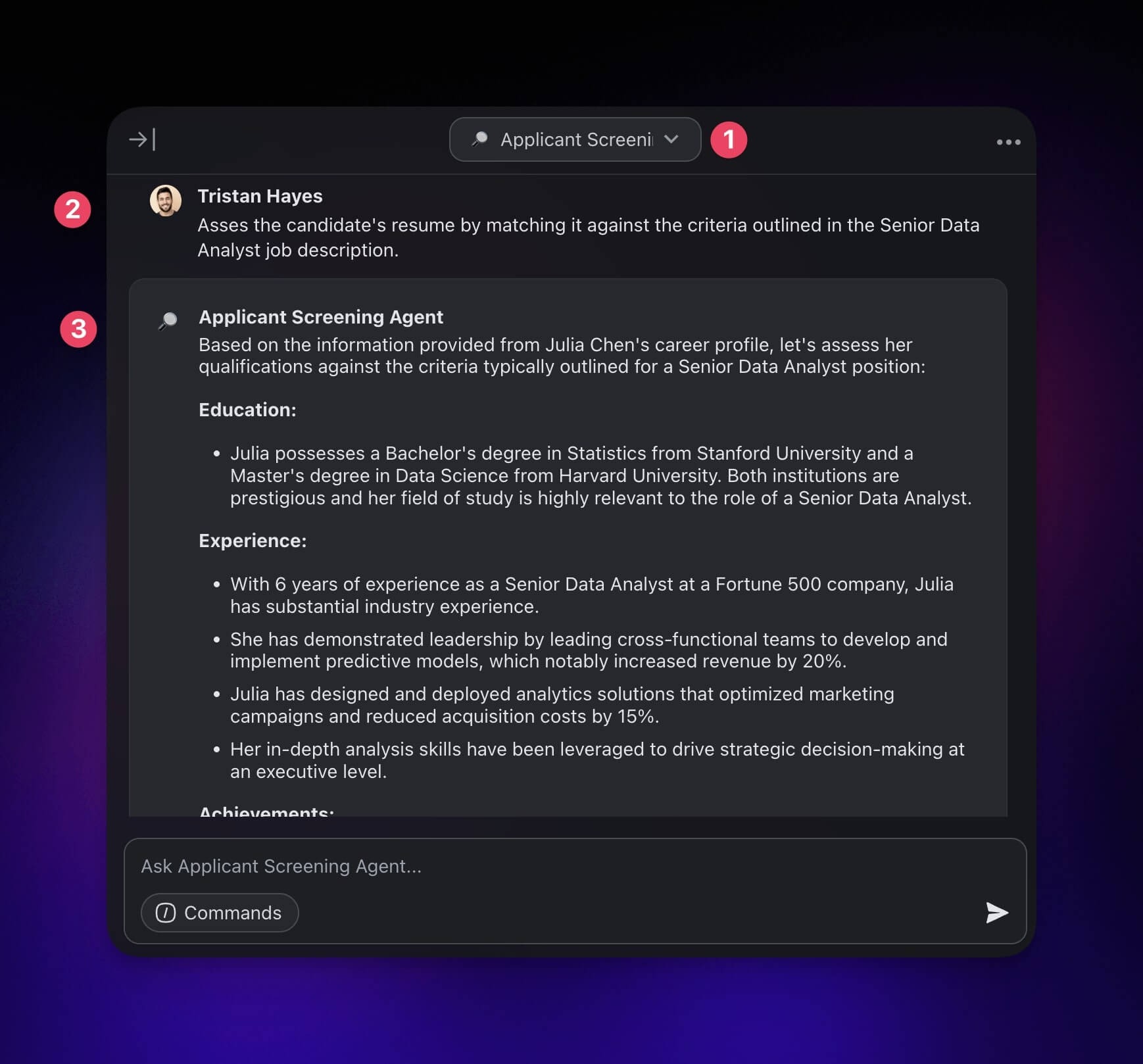 - Ask the agent to assess the candidate's resume by matching it against the criteria outlined in the job description. Wait for it to generate the output.