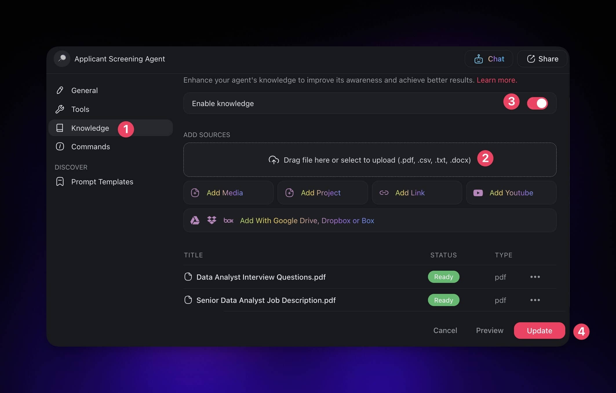 The workflow for this use case is simple. We're going to create an AI Agent and train it on the specific requirements of your job offering. This can include: