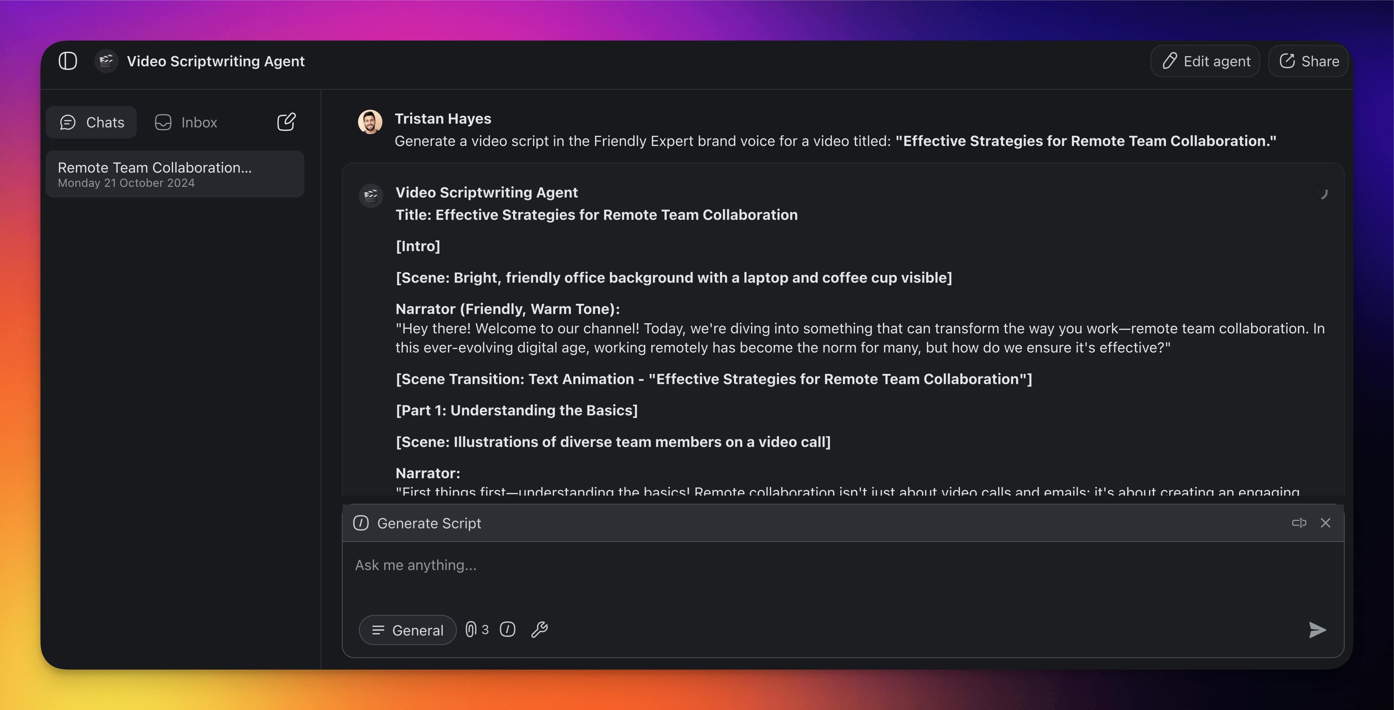 Now that your AI agent is ready, it's time to start creating. Our Video Scriptwriting Agent is perfect for video promos, tutorials, or demos. Let's use it to generate a new script: