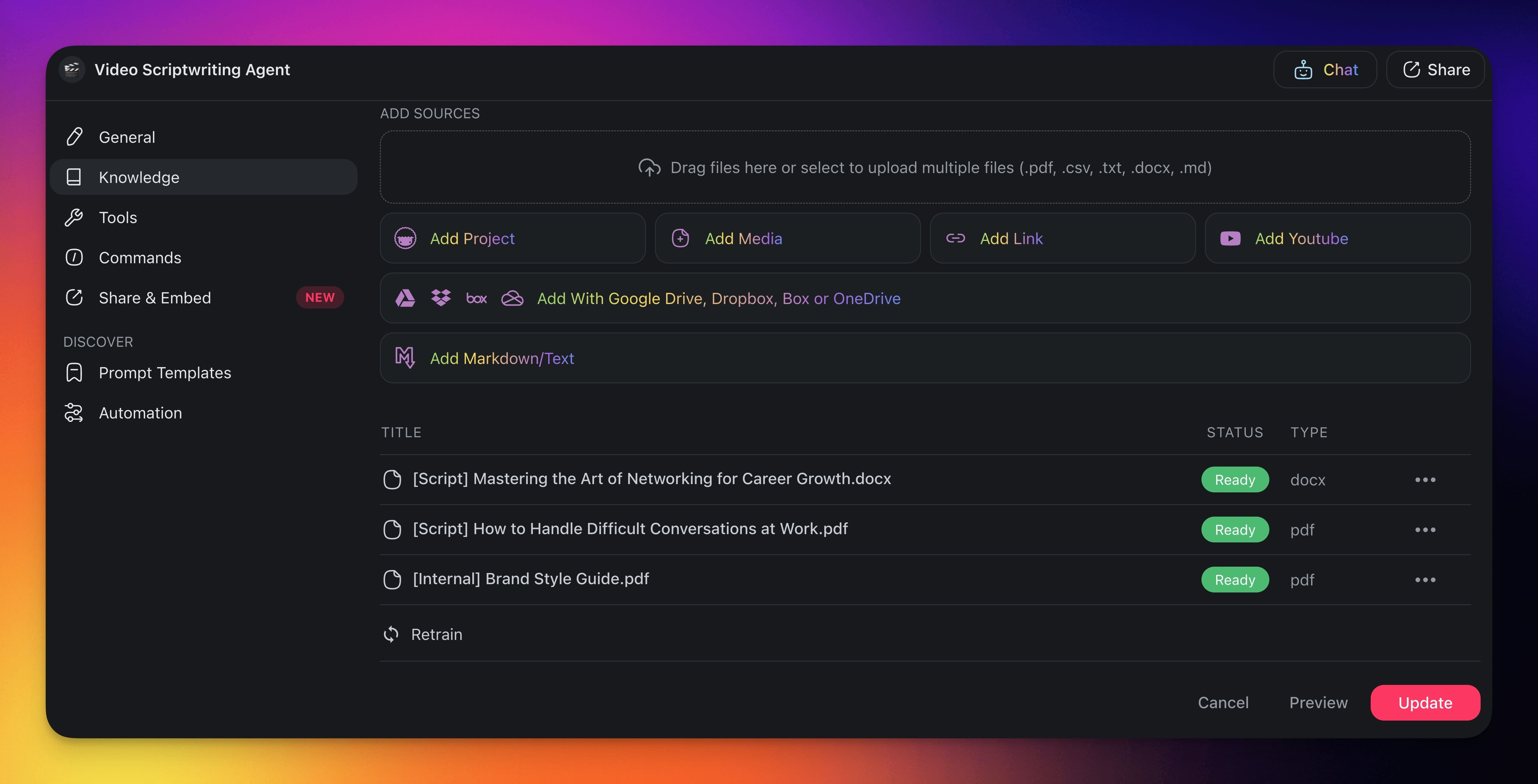 In our example, we used two video scripts for a style reference and a brand guidelines documents to fine-tune the agent’s tone and ensure consistency.