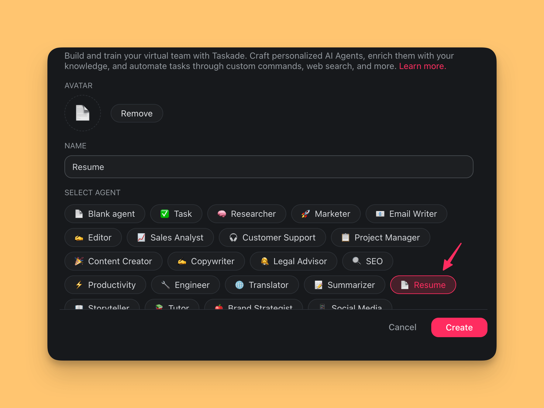 - Choose the ๐ Resume agent template from the list.
