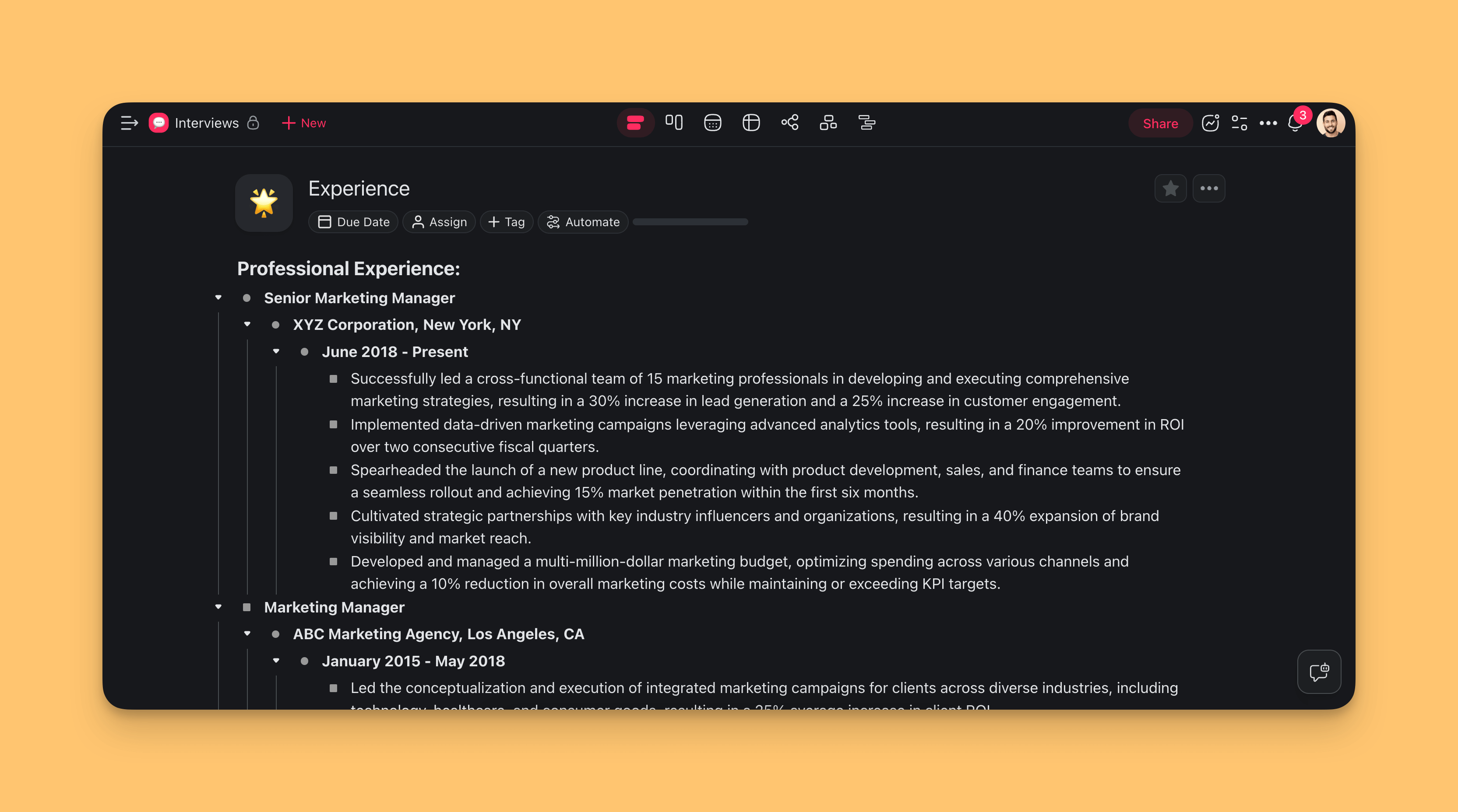 First, add your accomplishments and achievements into a Taskade project.