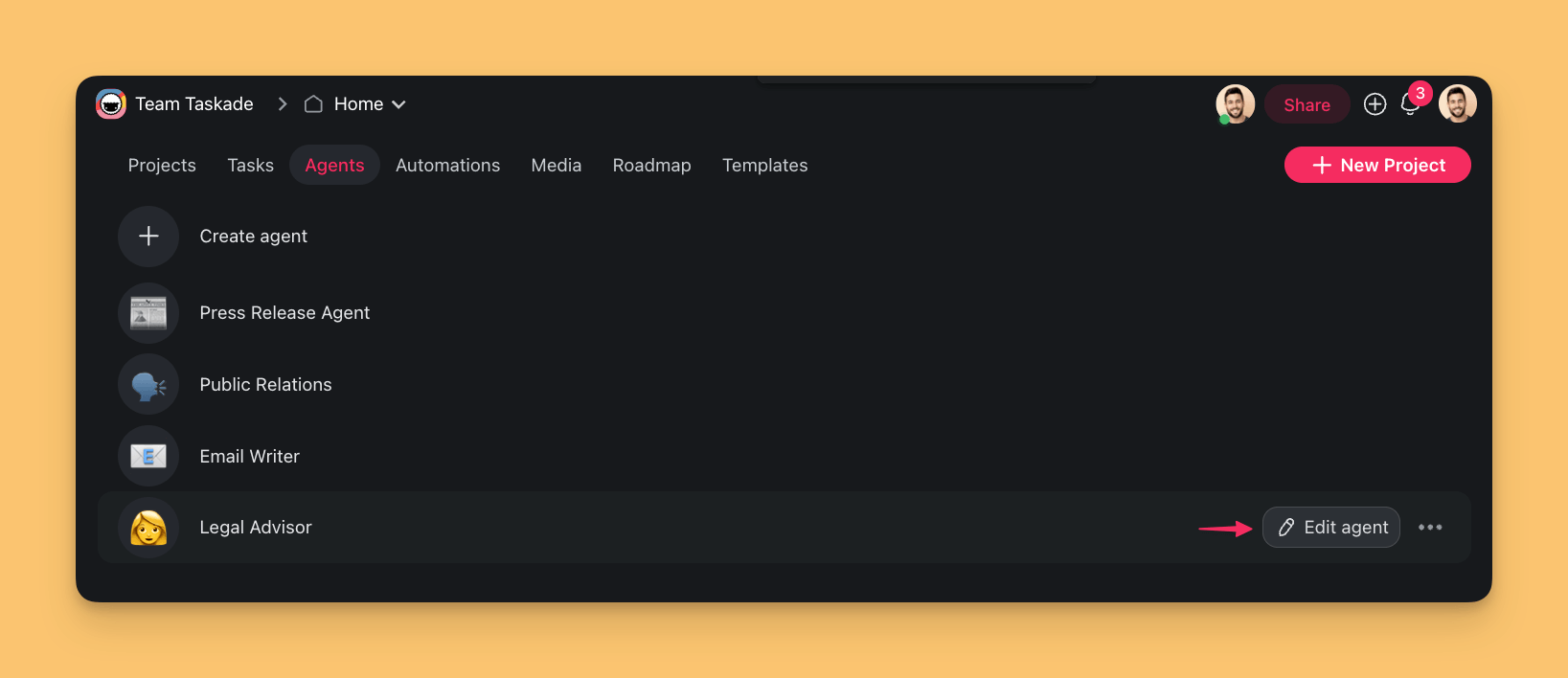 Click the โ๏ธ Edit agent button on the right.
