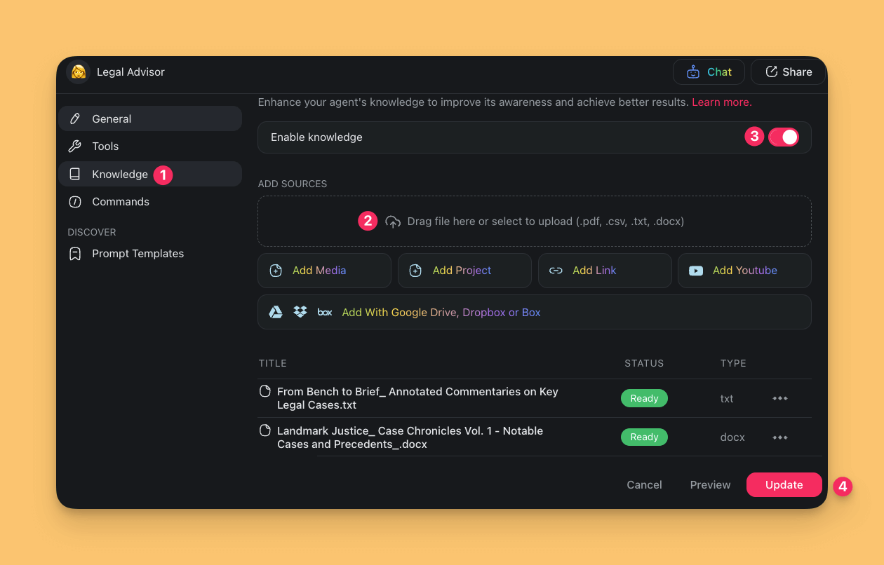 Our ๐ฉ Legal Advisor agent starts with some basic knowledge, but it needs context to be more effective. You can train the agent on using anything from court filings to legal memos and briefs. The more varied the documents, the better equipped the agents will be to provide tailored assistance across a range of legal scenarios.
