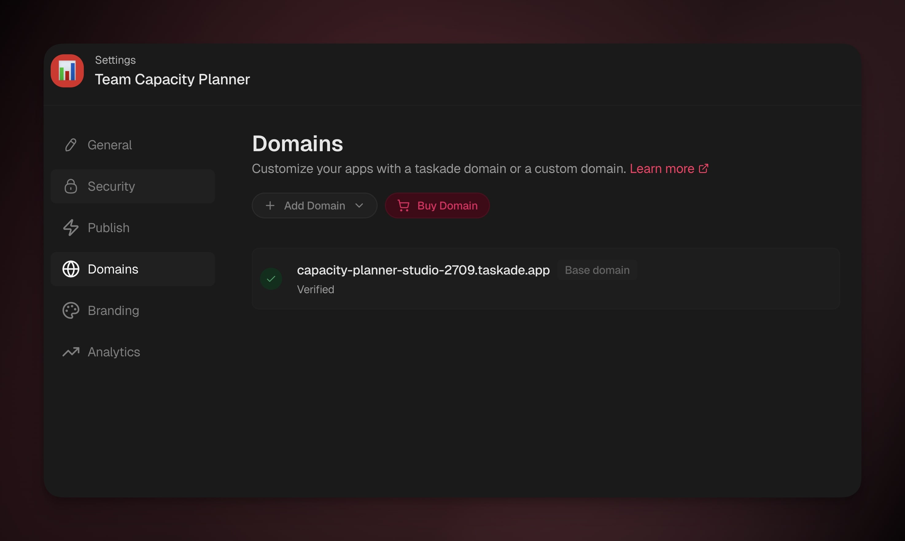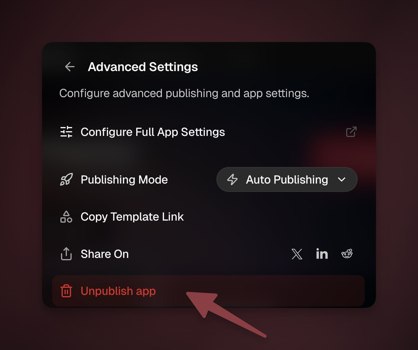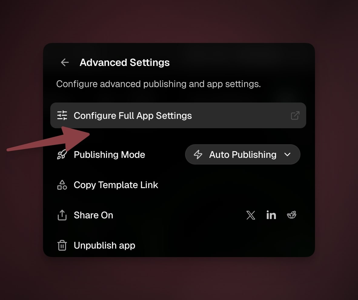 Use full app settings for deeper control over publishing, branding, SEO, and domains.