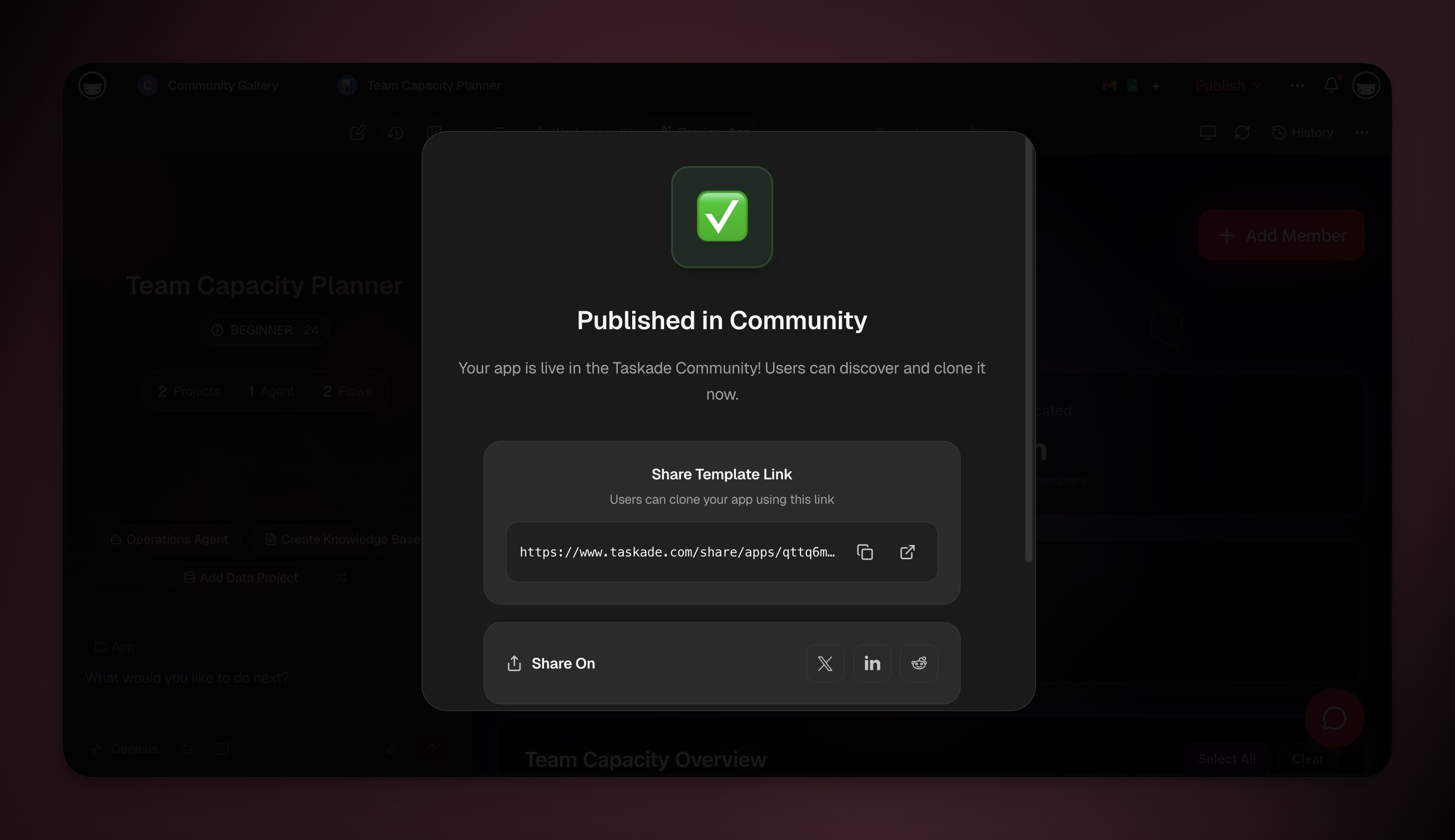 When your app is shared on social media, Slack, or Discord, Taskade automatically generates a screenshot of your app to use as the preview image.