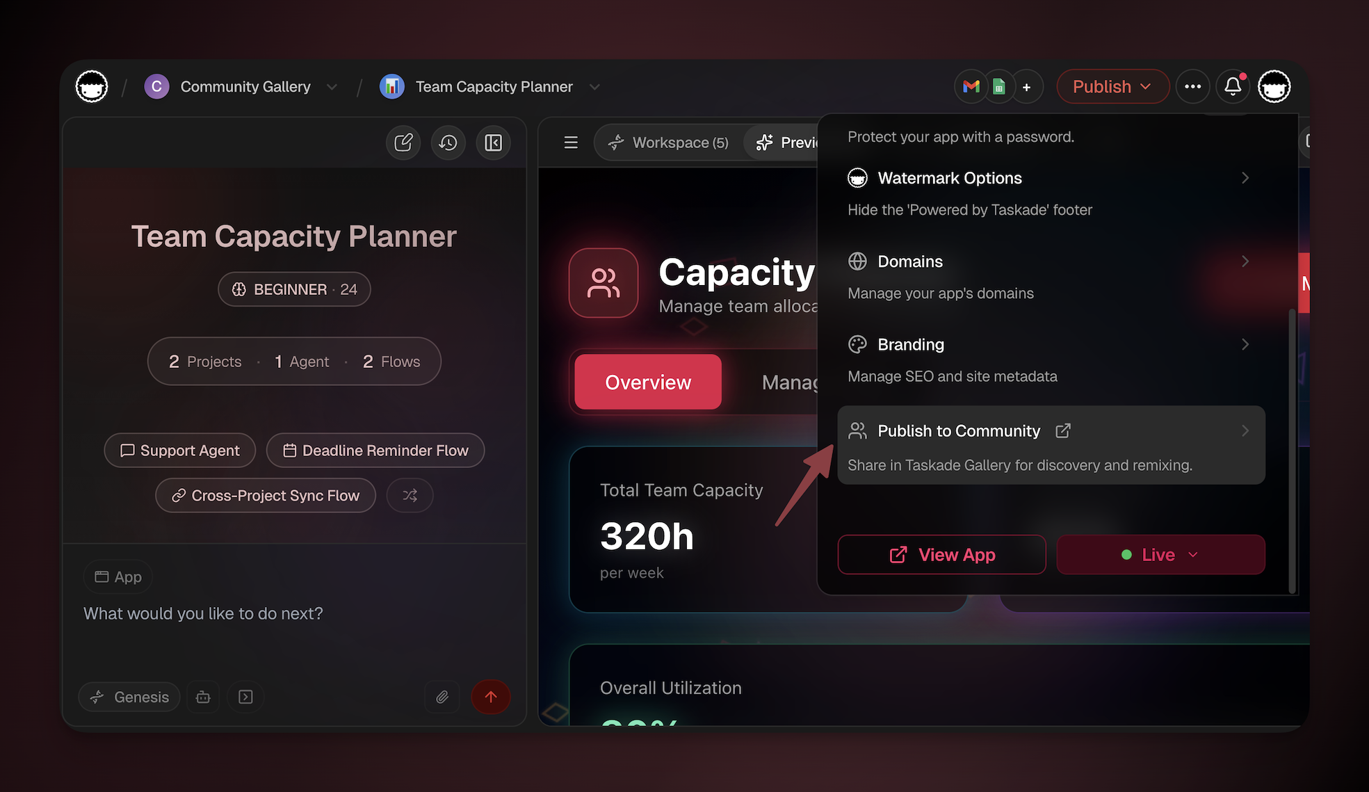 Once you've built an amazing app with Genesis, you can share it with others in different ways. Whether you want to publish it for everyone to use, let others clone your entire workflow, or simply share a template, we've got you covered.