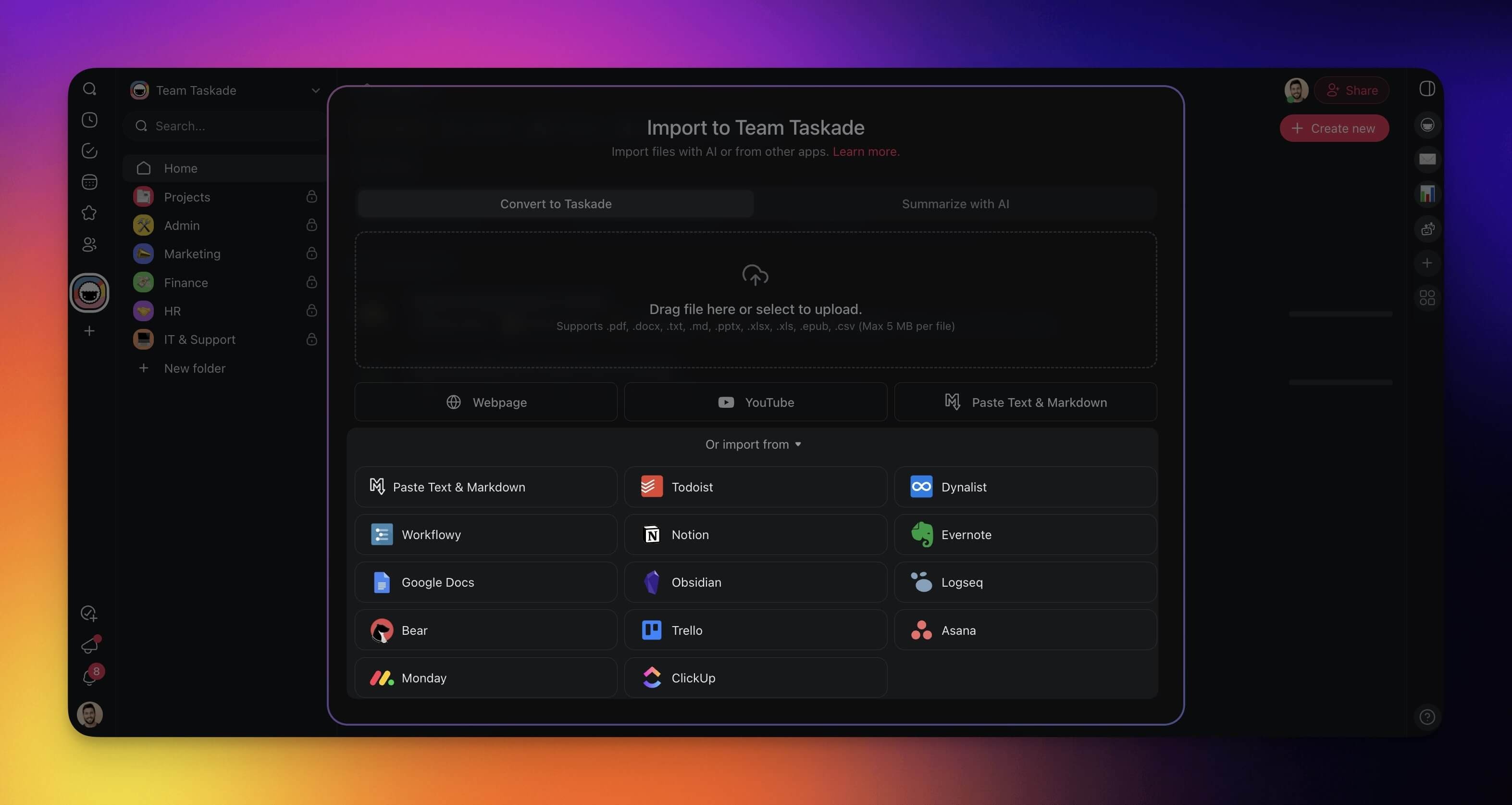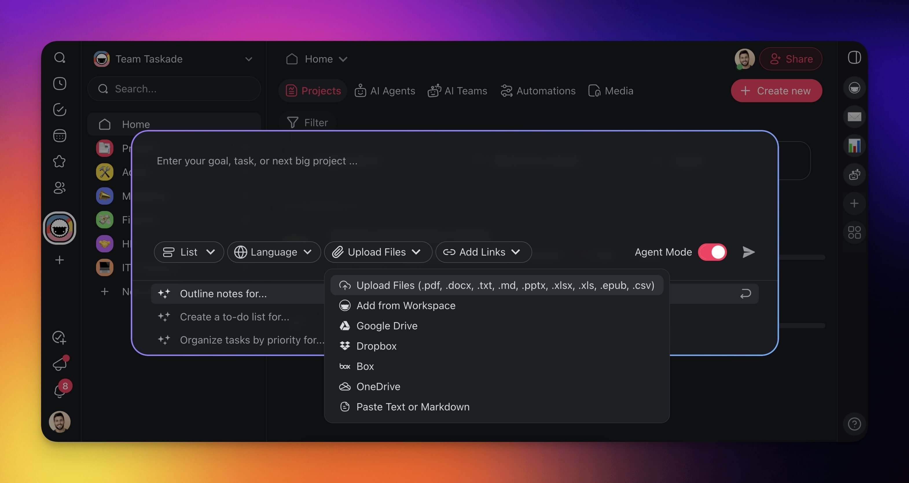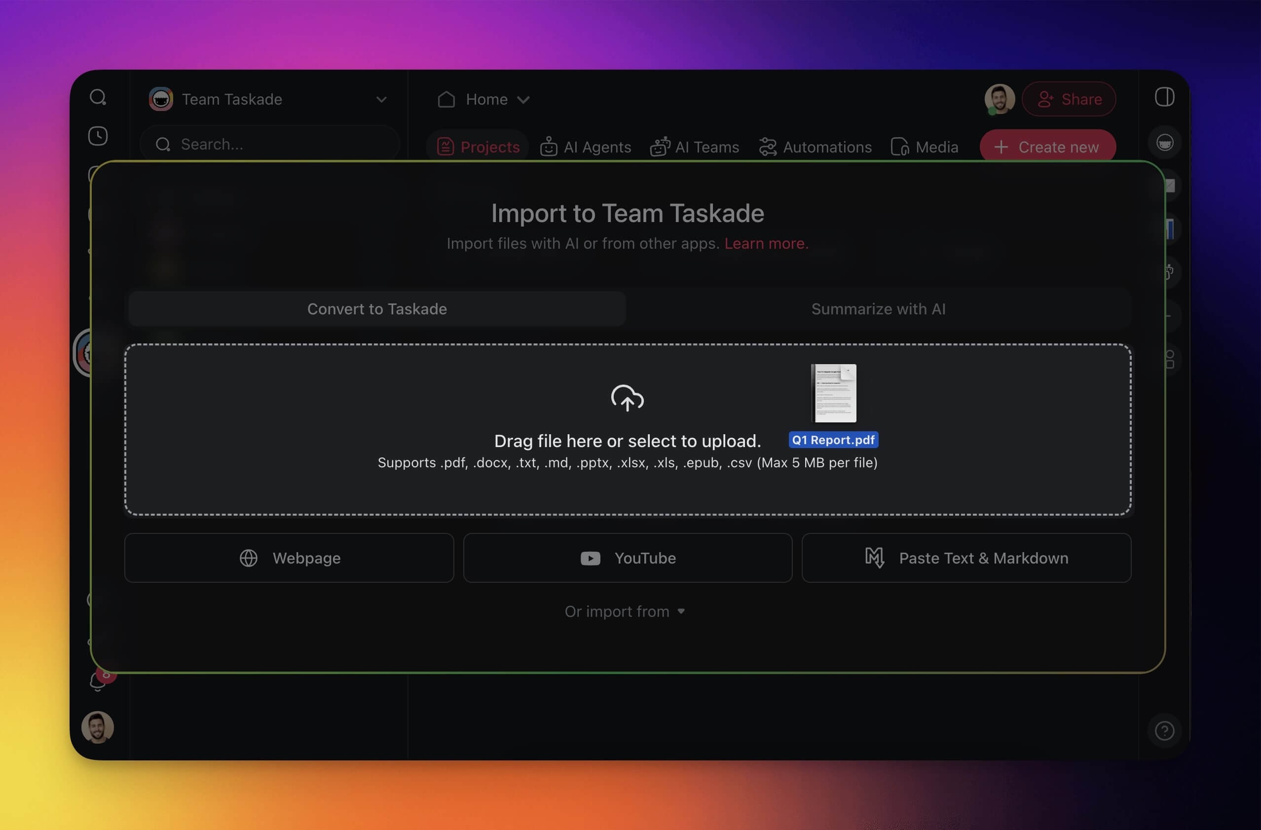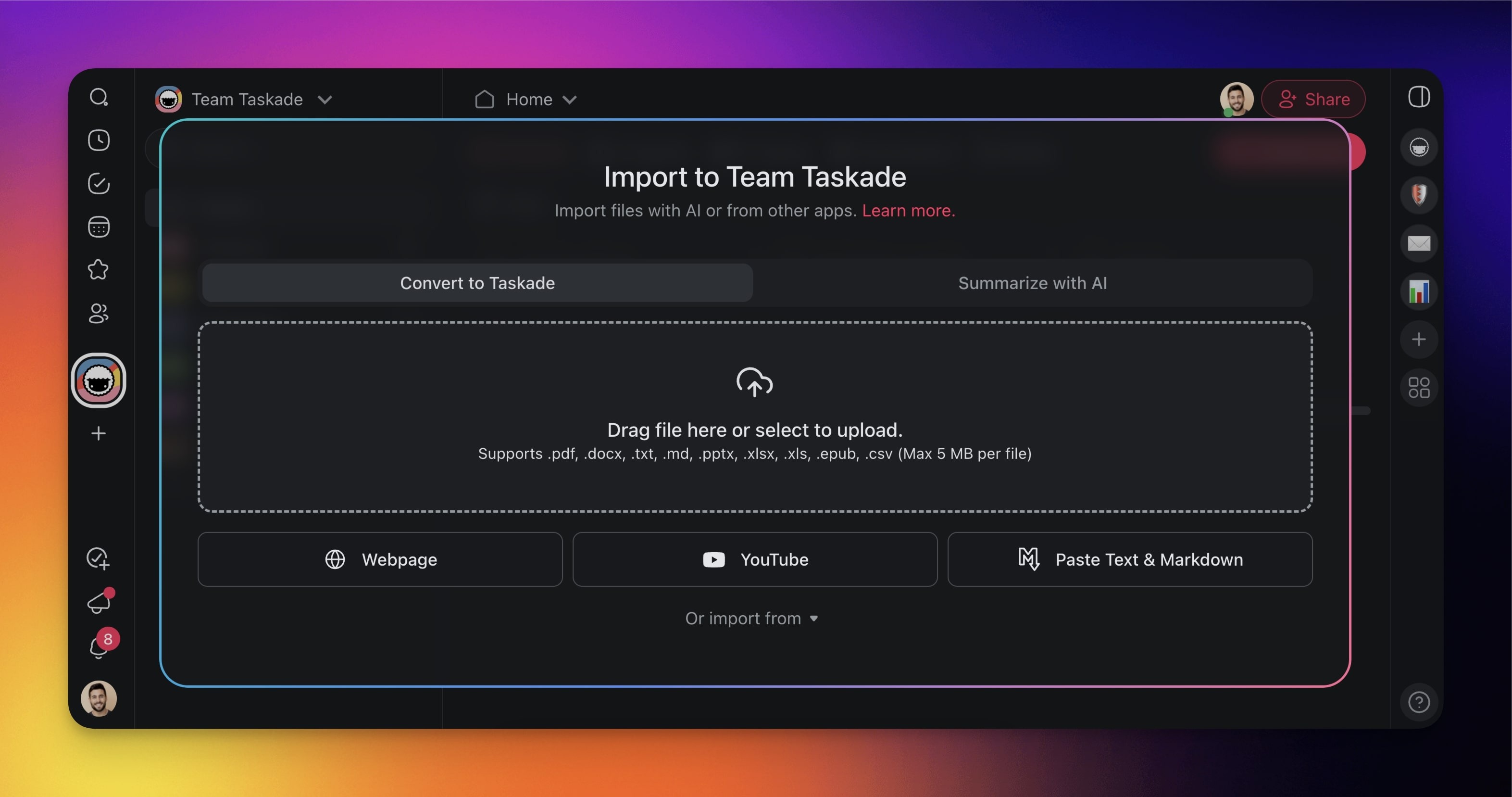 Import files and documents into Taskade. Upload your presentations, notes, and lists of tasks stored in .pdf, .docx, .txt, .md, .pptx, .xlsx, .xls, .epub, and .csv to get started.