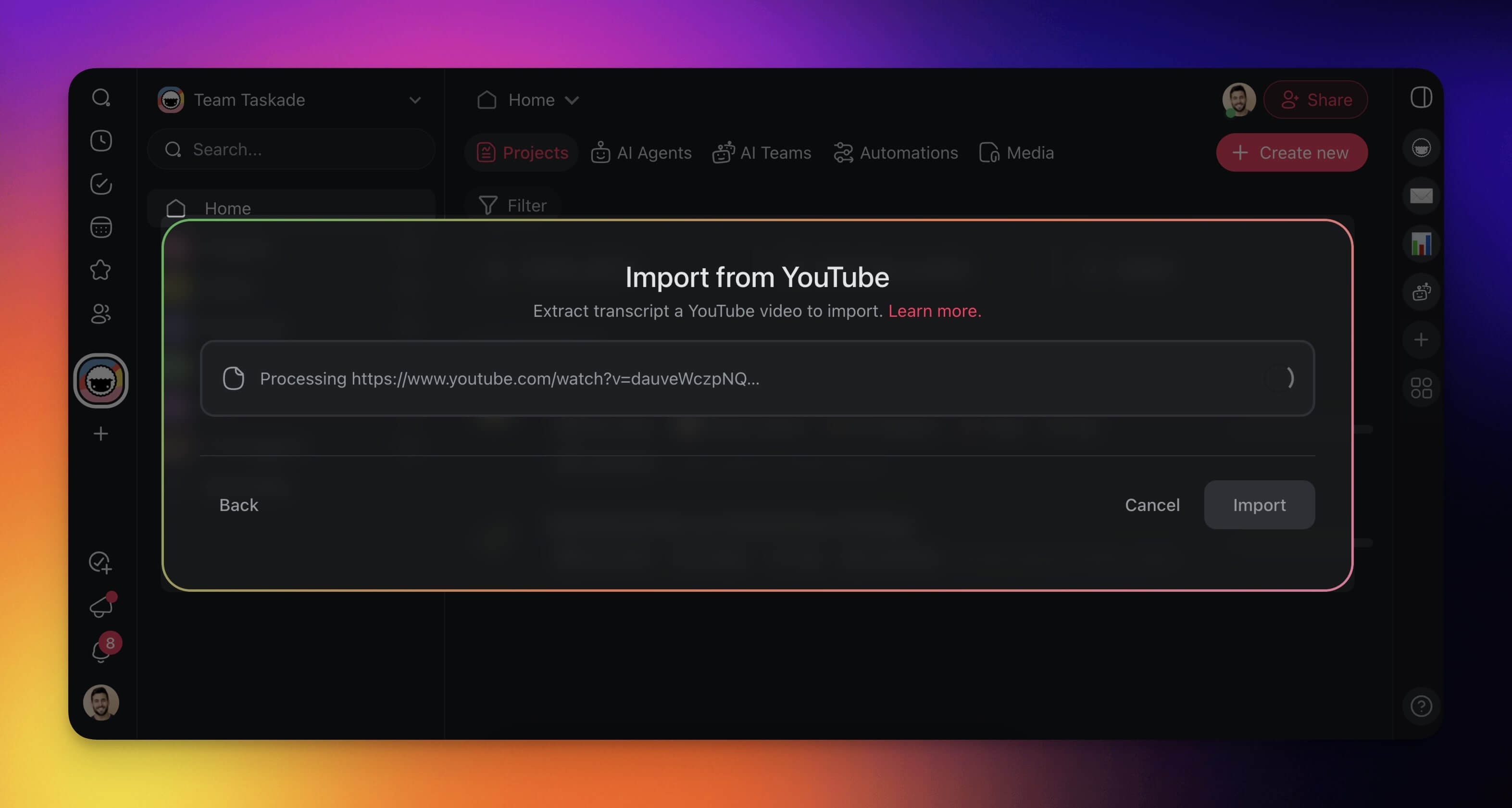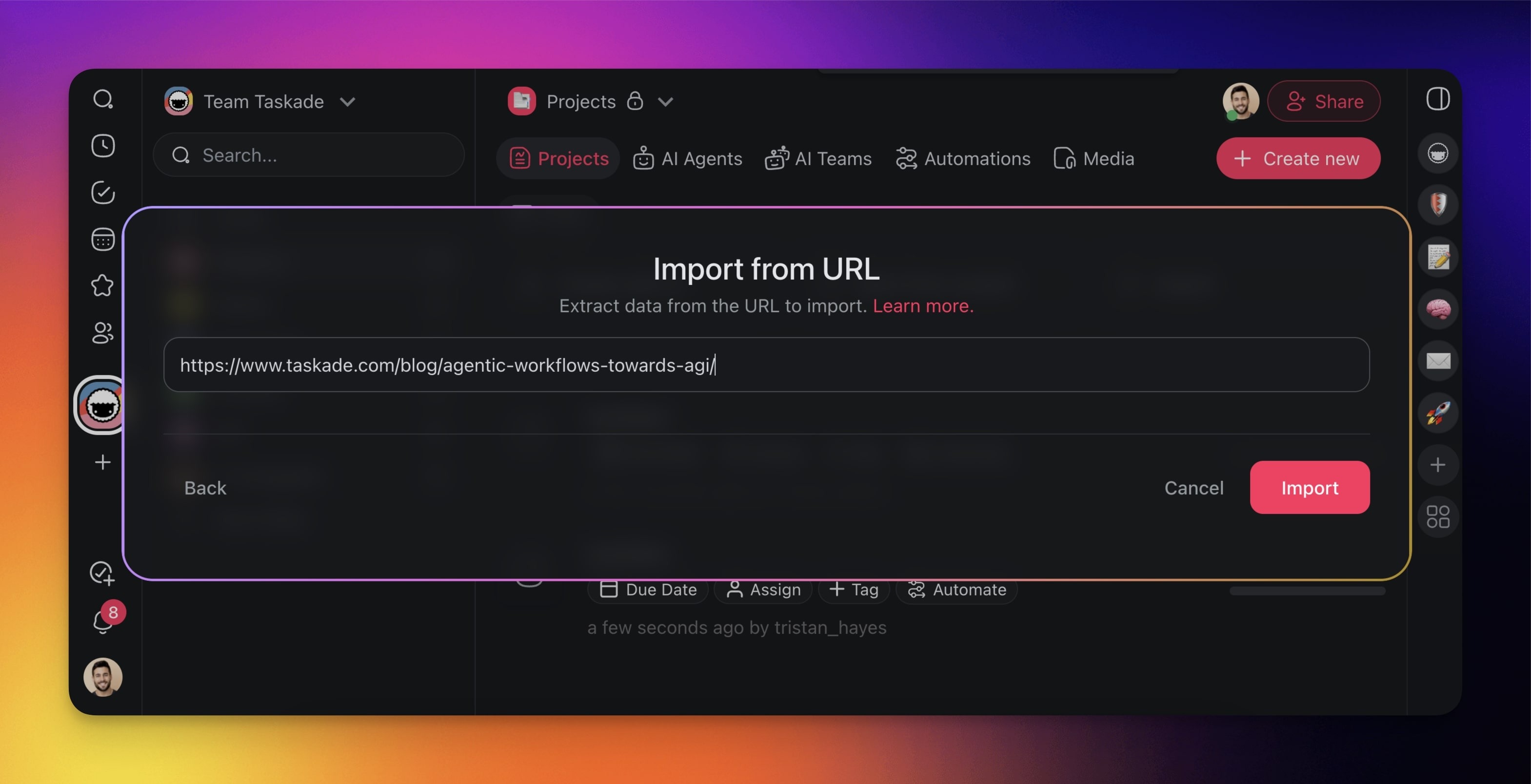 Import content from any webpage directly into Taskade. Capture articles, blog posts, and other web resources, and turn them into actionable projects.