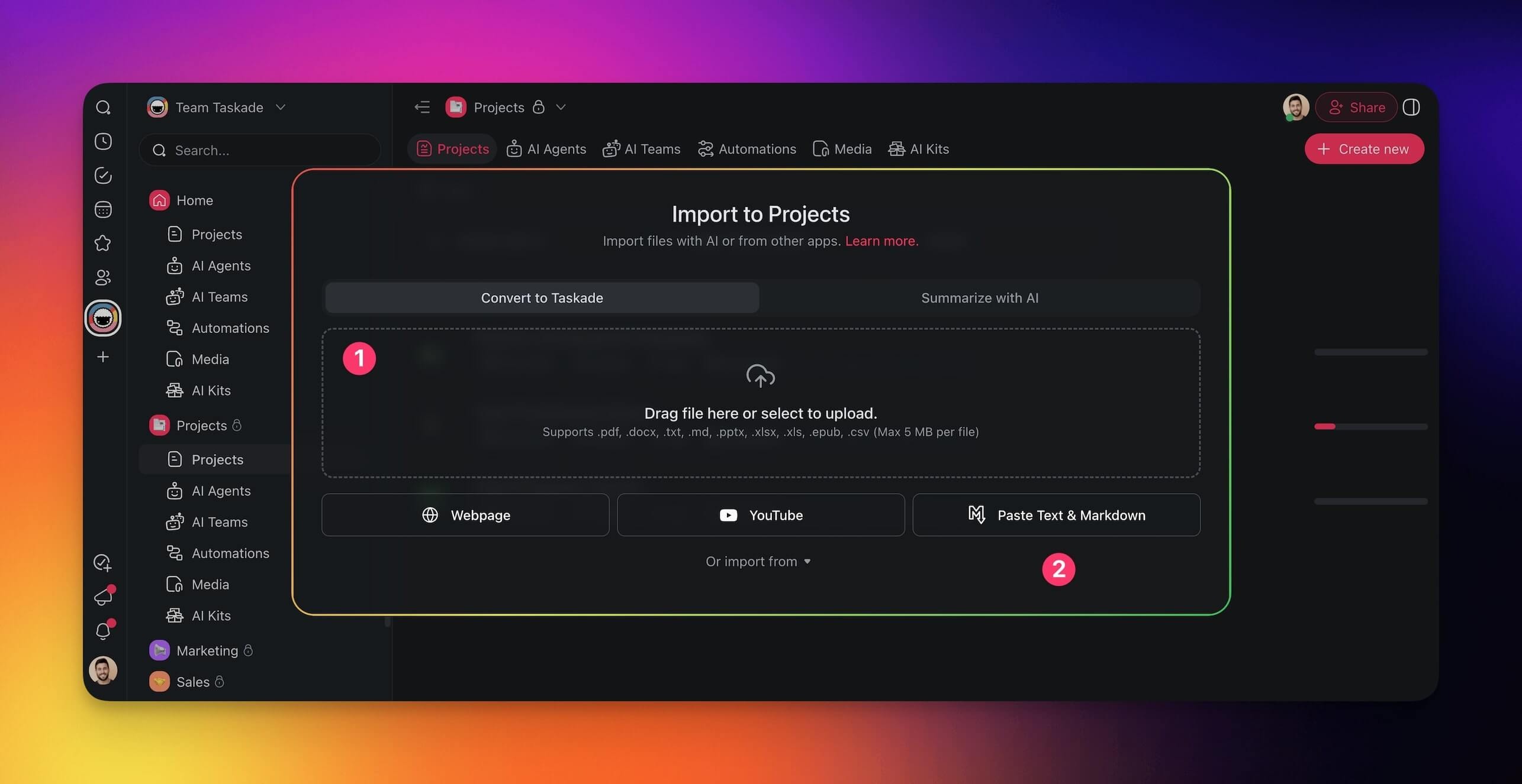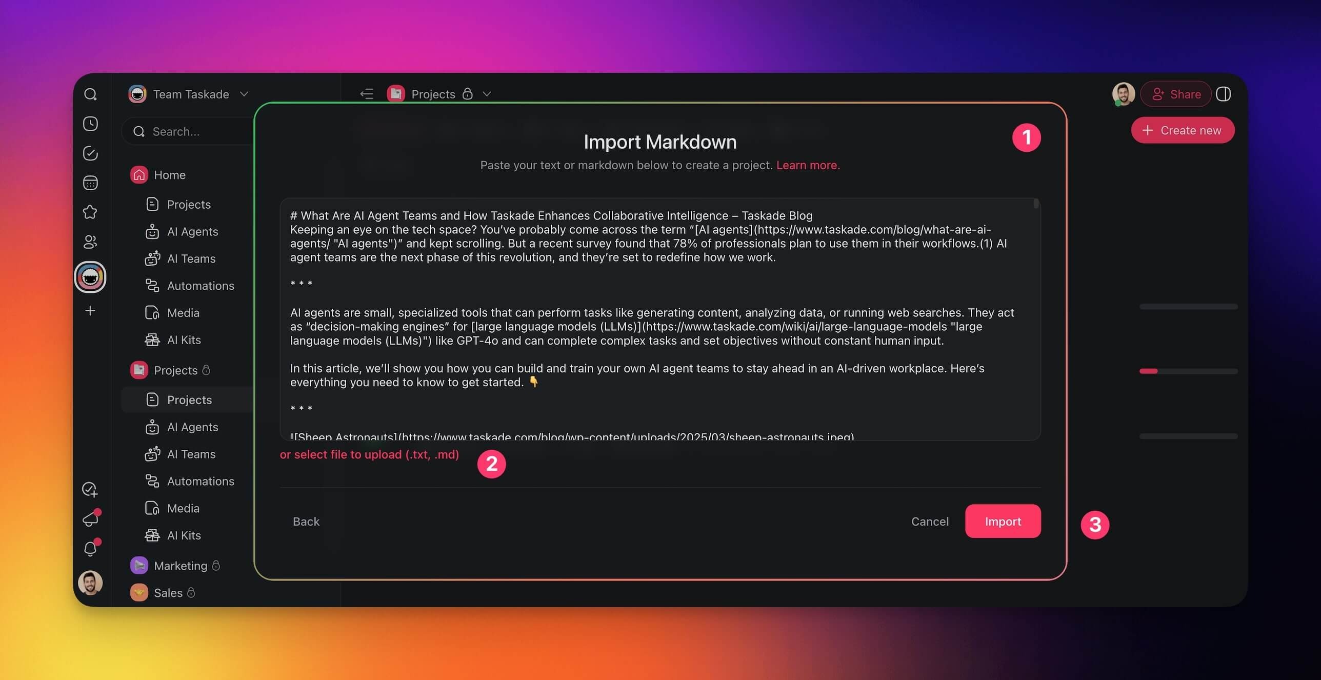 When you paste .txt or .md content directly into Taskade, the text is automatically cleaned up and reformatted using AI without changing the original meaning.