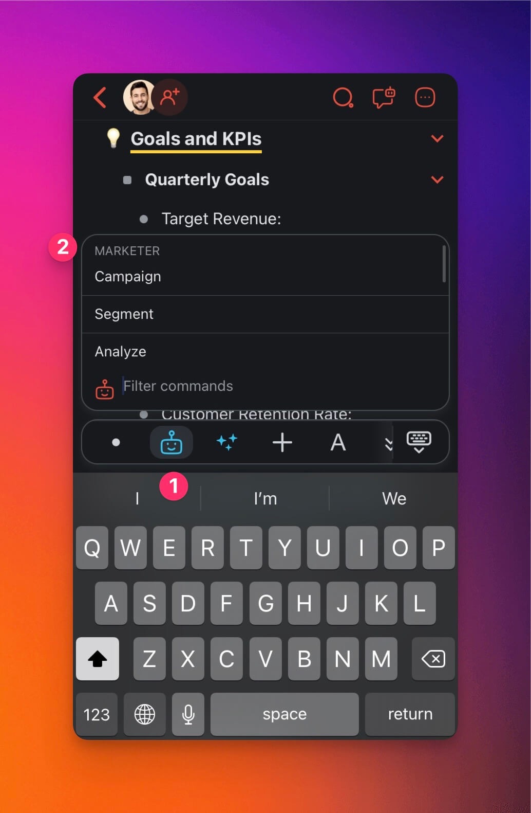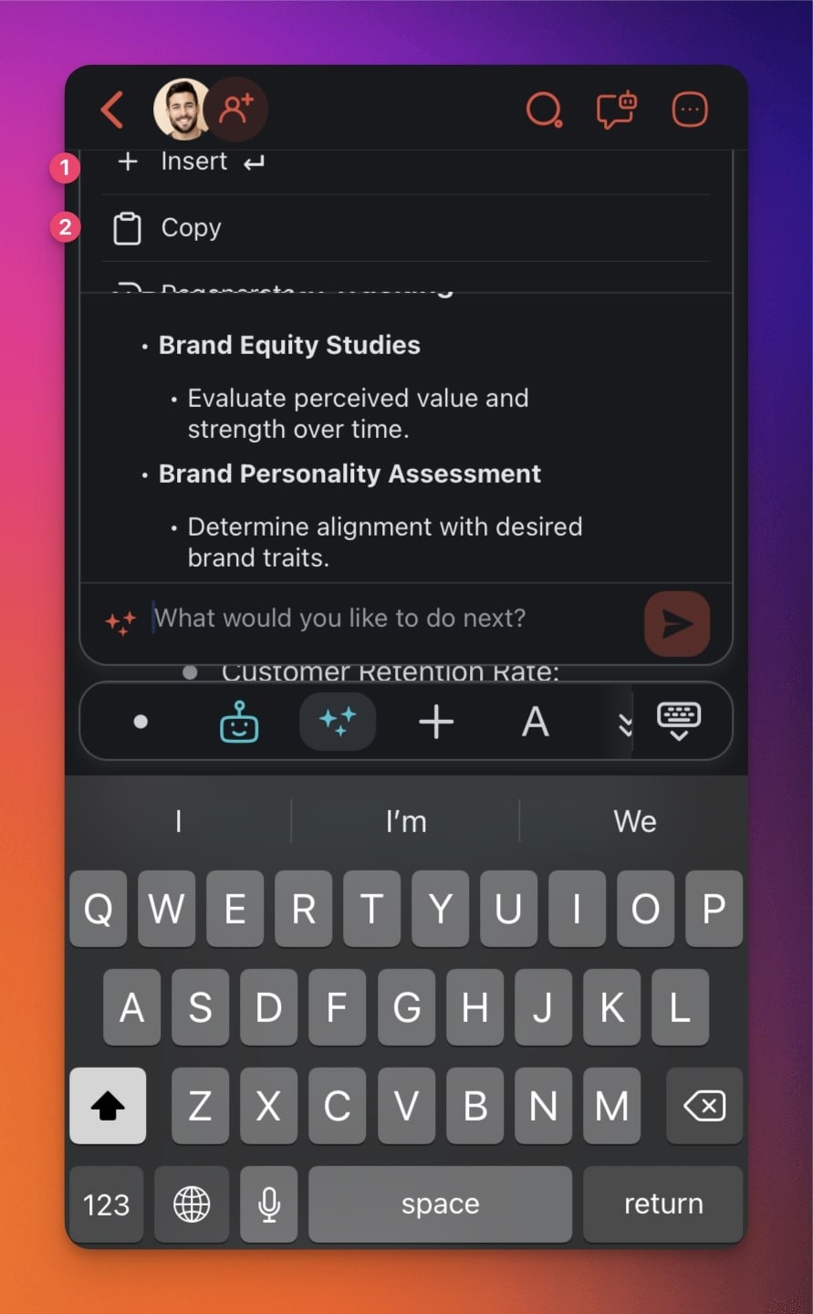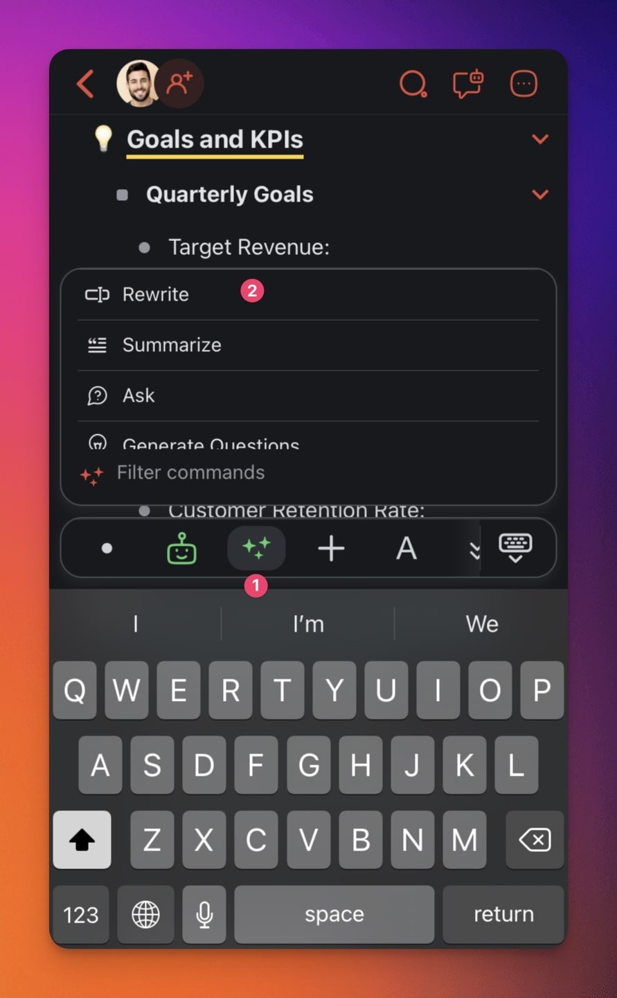 - Tap the โจ stars icon in the keyboard toolbar and choose a command.