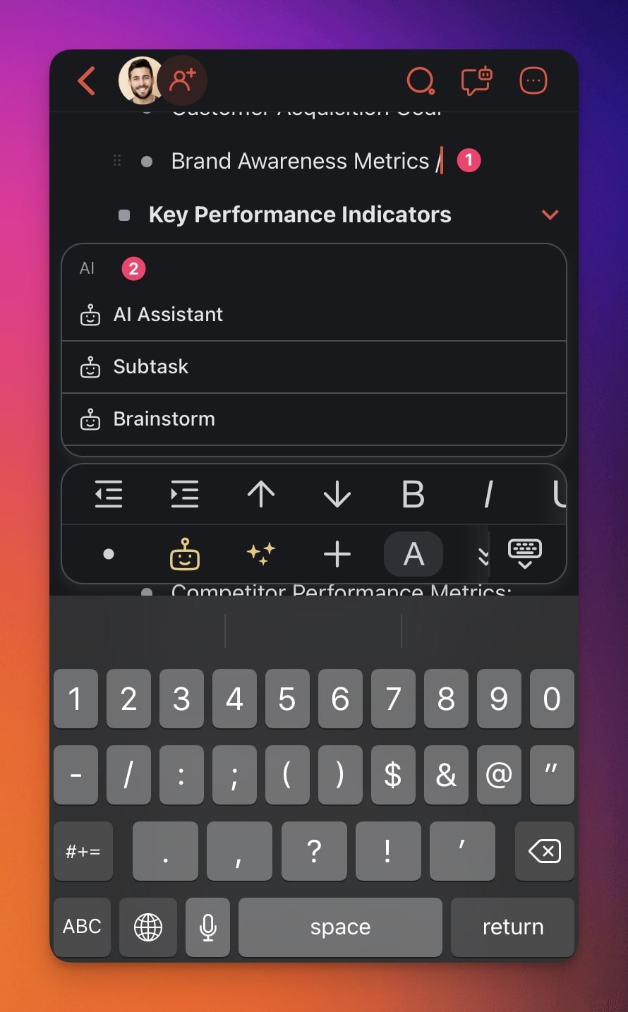 The AI Assistant is a productivity companion that helps you generate content, answer questions, brainstorm ideas, and organize anything using handy AI commands. You can also make use of Custom AI Agents to assist you.
