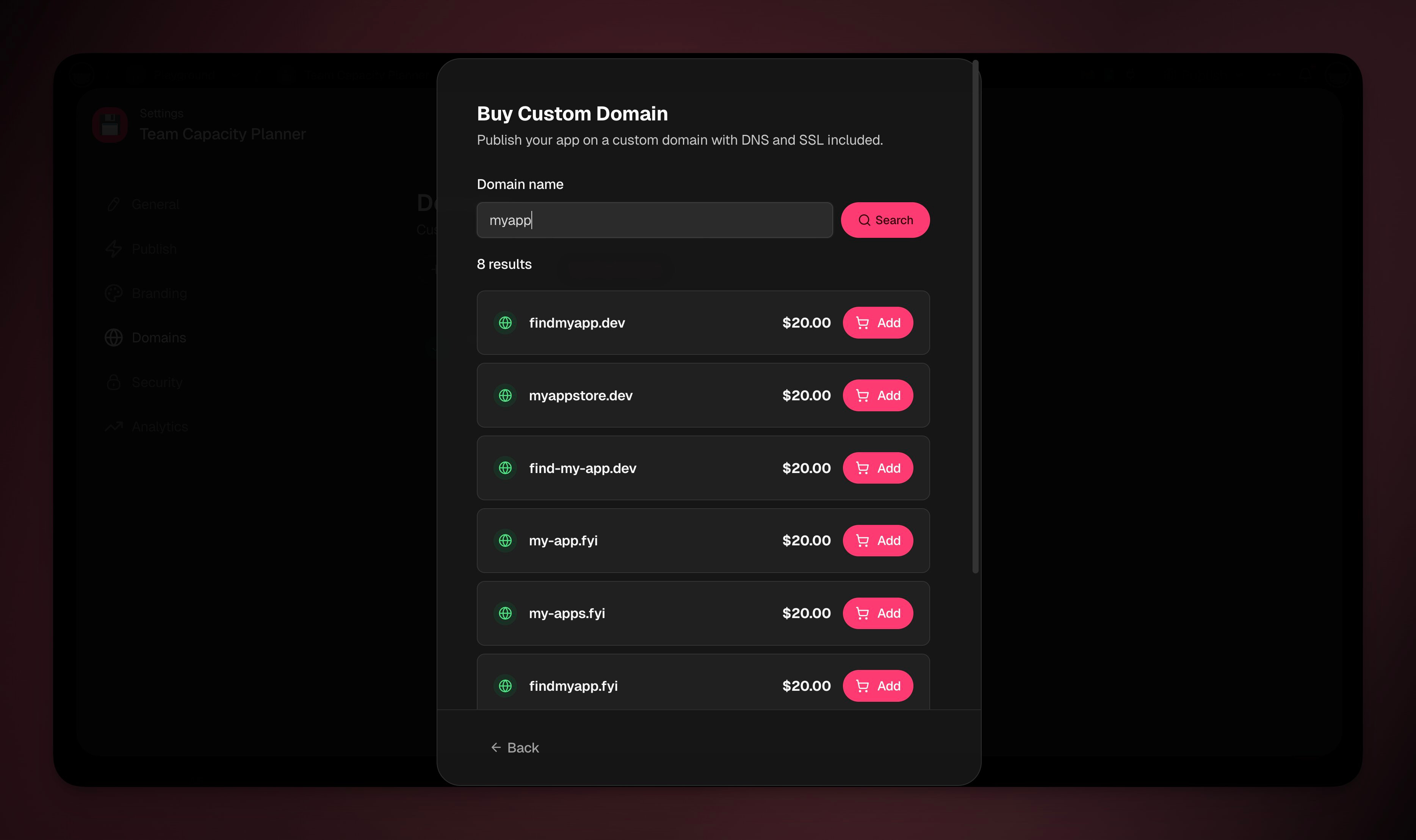 - Select a domain → Click **Add** → **Buy and Publish.**