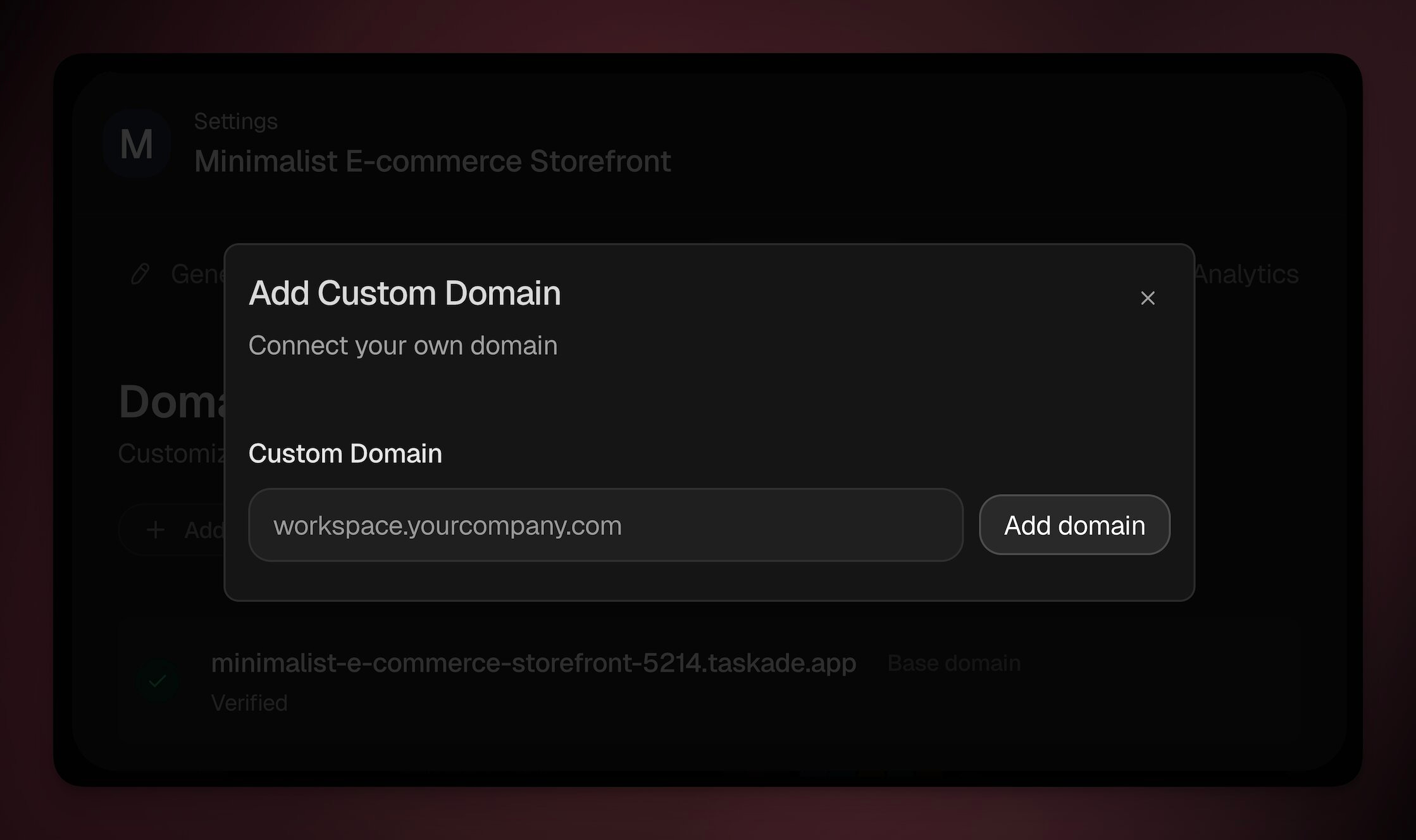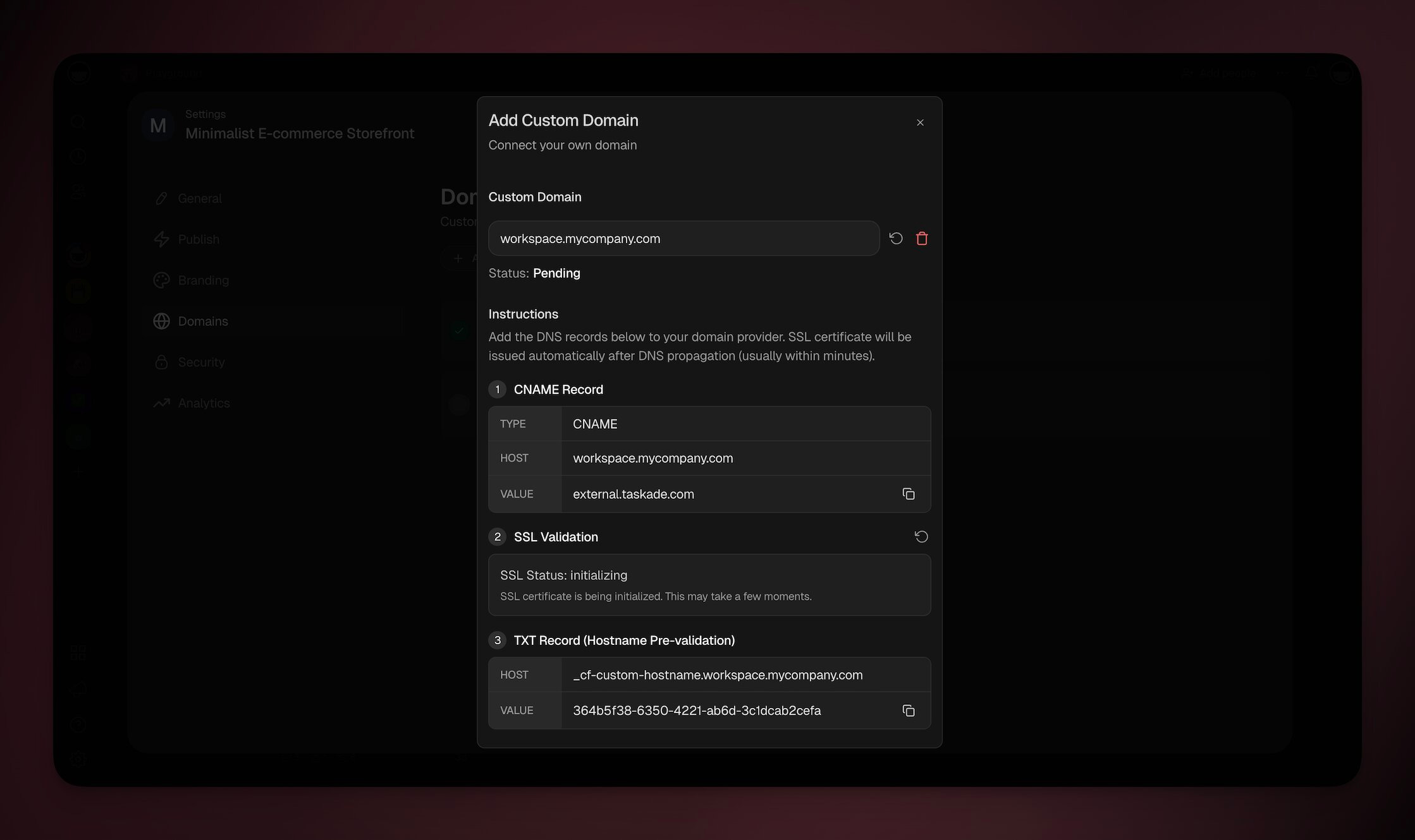 - Enter your domain and Taskade will show you the exact DNS record to add.