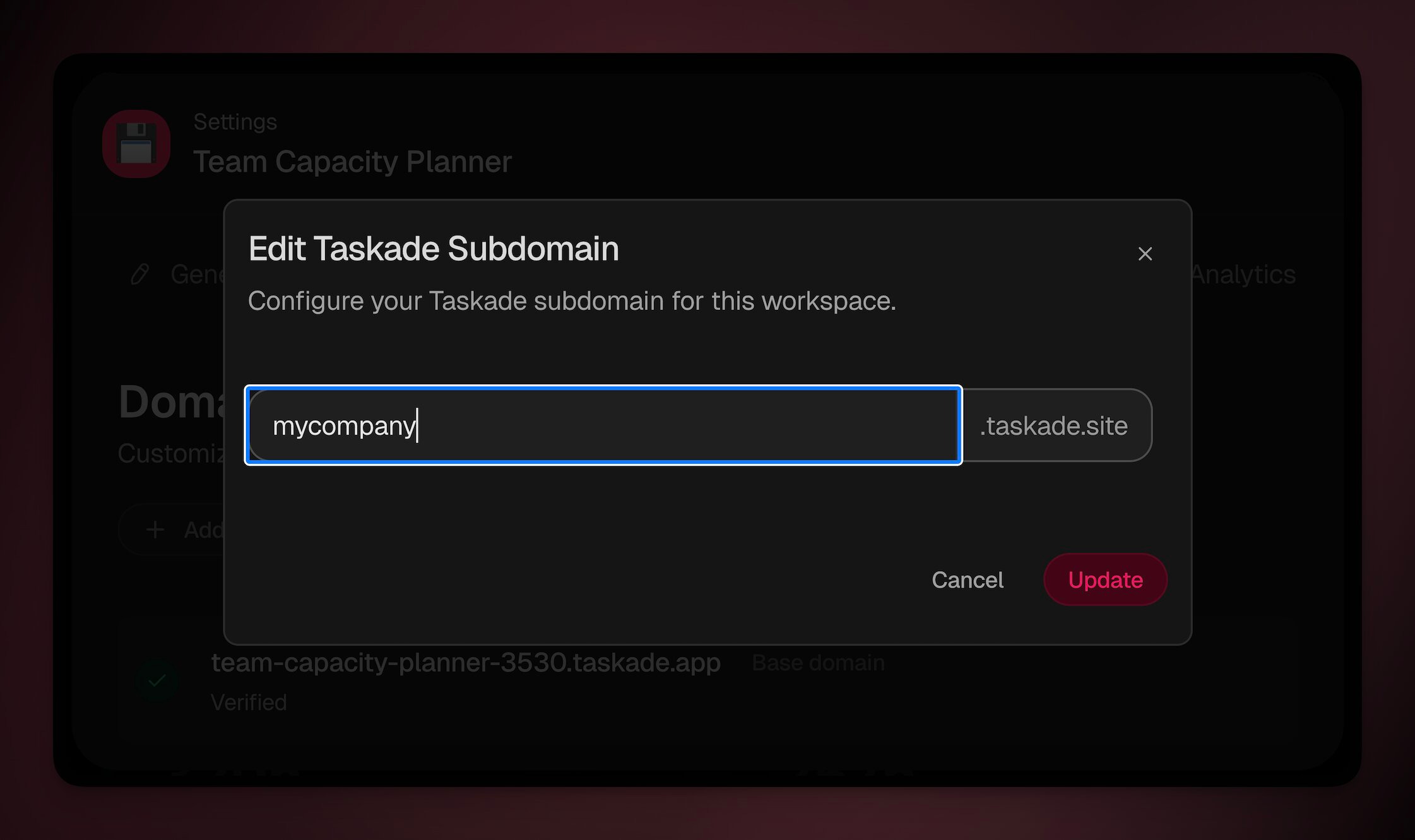- Pick from an available Taskade subdomain or add your own.