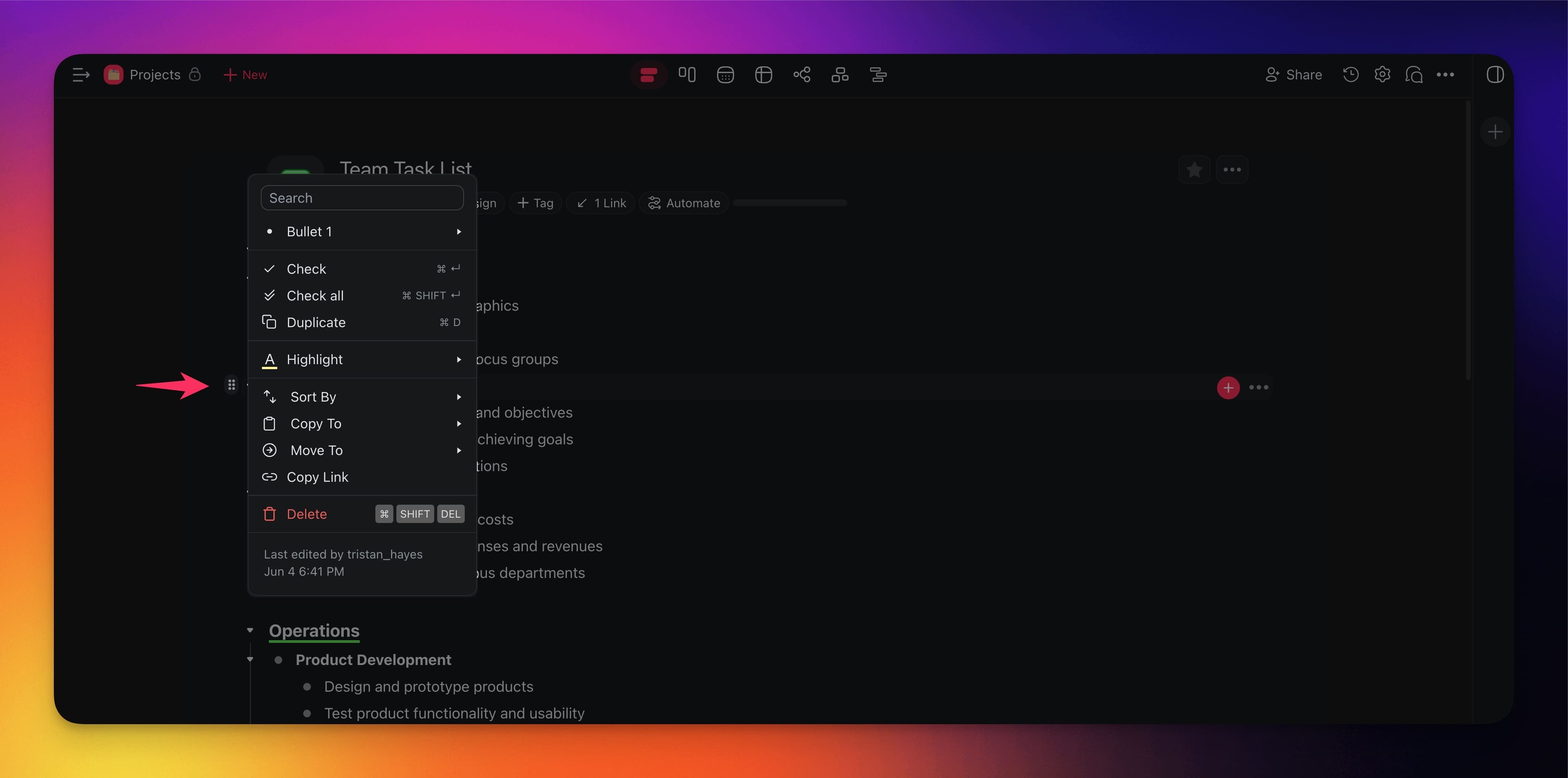 The drag icon menu(⋮⋮) lets you access formatting options, Add-Ons, and even reorder tasks. To access the menu, move the cursor over a task and click (⋮⋮) on the left. Start typing to show more formatting options like due dates and comments.