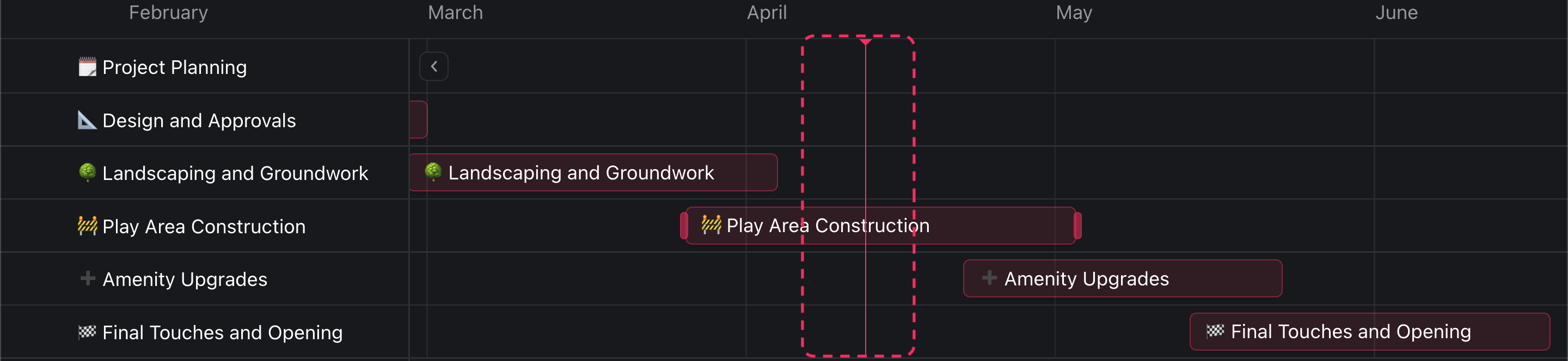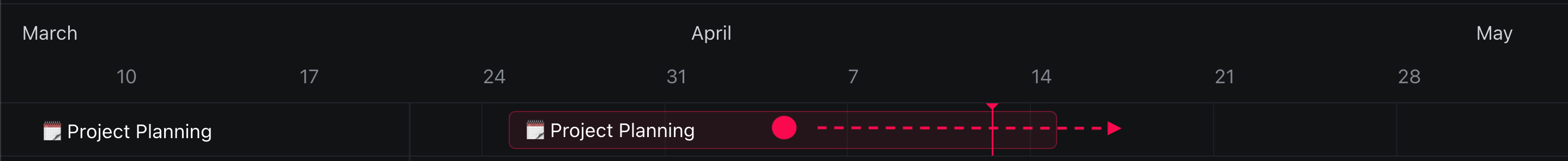 Reposition tasks on the timeline: Click and hold at the center of the task. Once selected, drag the task left or right along the timeline.