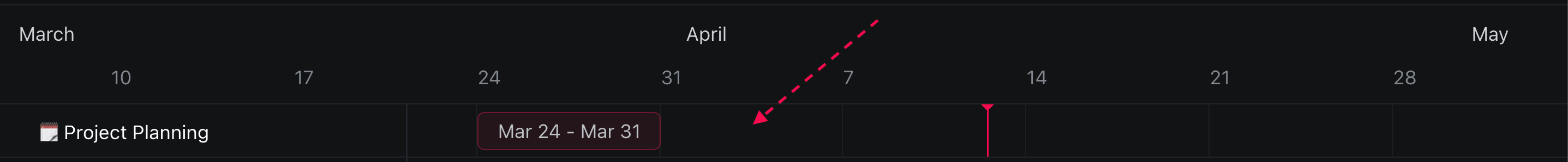 Set task duration: Click the empty space on the timeline at the same height level as the corresponding task on the left to set the duration.