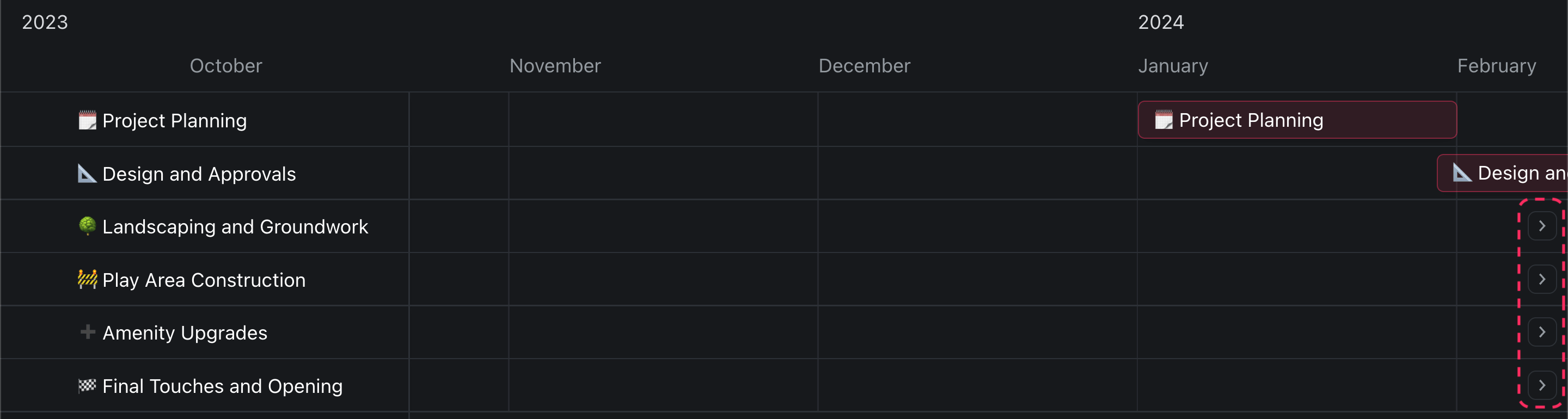 Seeker Arrows: The arrows on the edges of your timeline allow you to quickly jump to the tasks on the timeline. Use them to navigate complex, lengthy projects.