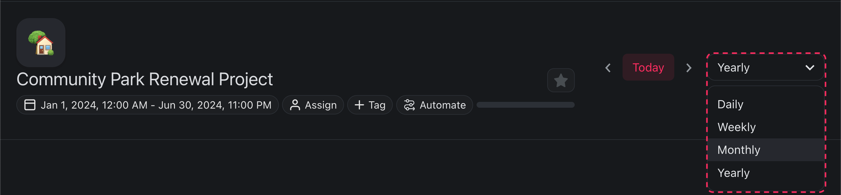 Time Scale Selector: Located in the top-right corner of the project, the selector lets you switch views between daily, weekly, monthly, and yearly timelines.