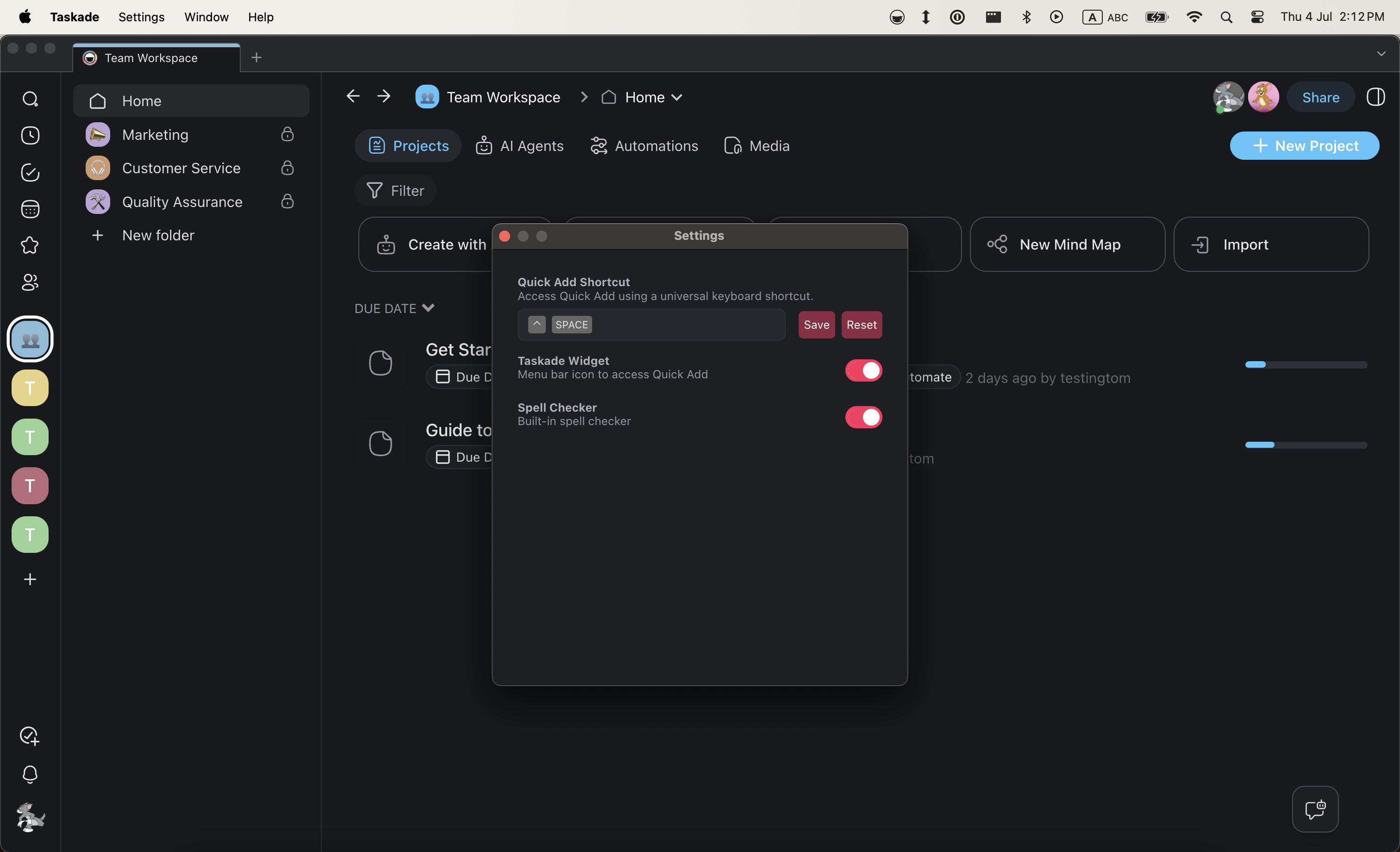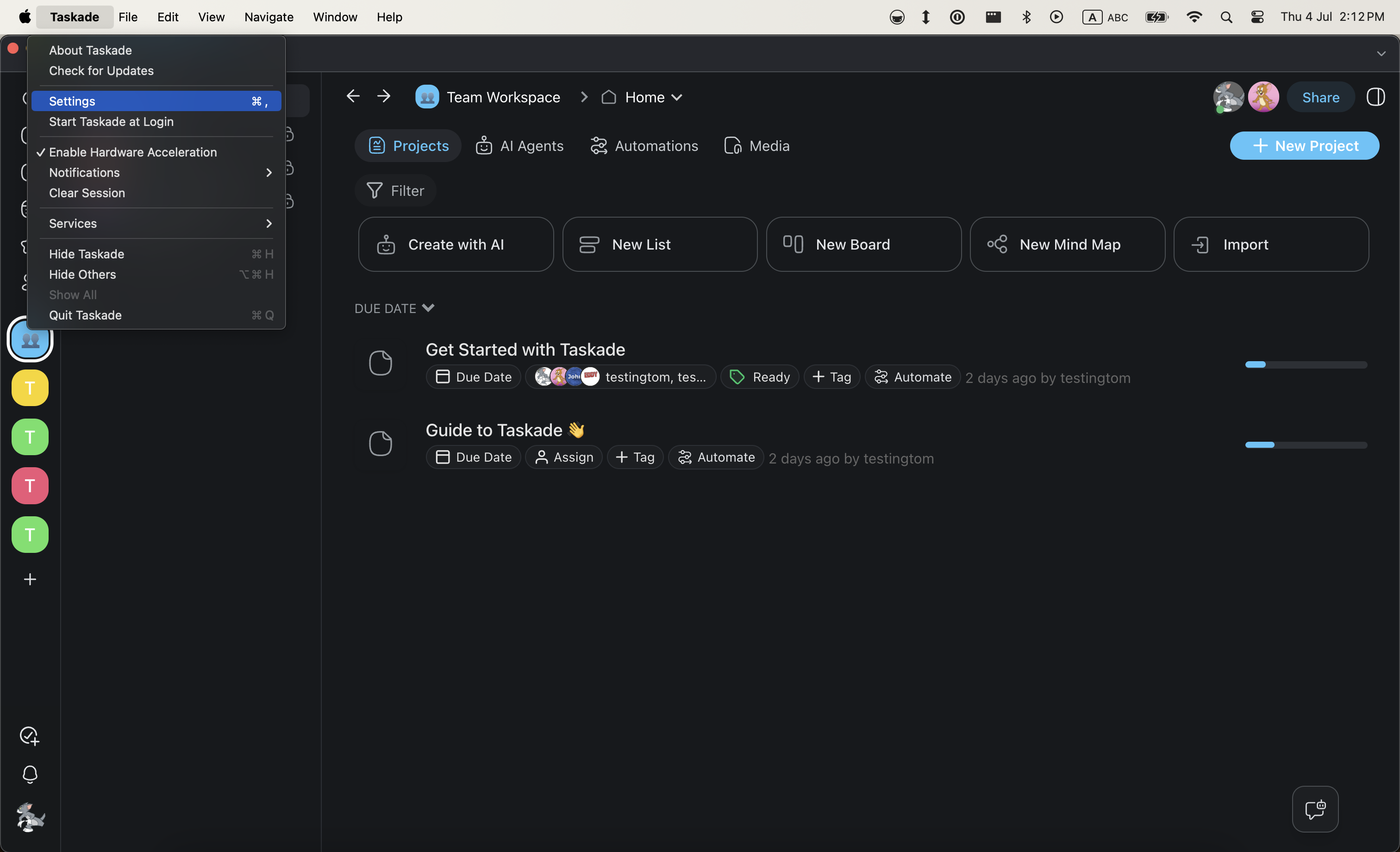 - Select Taskade from the top left corner in the menu bar.
