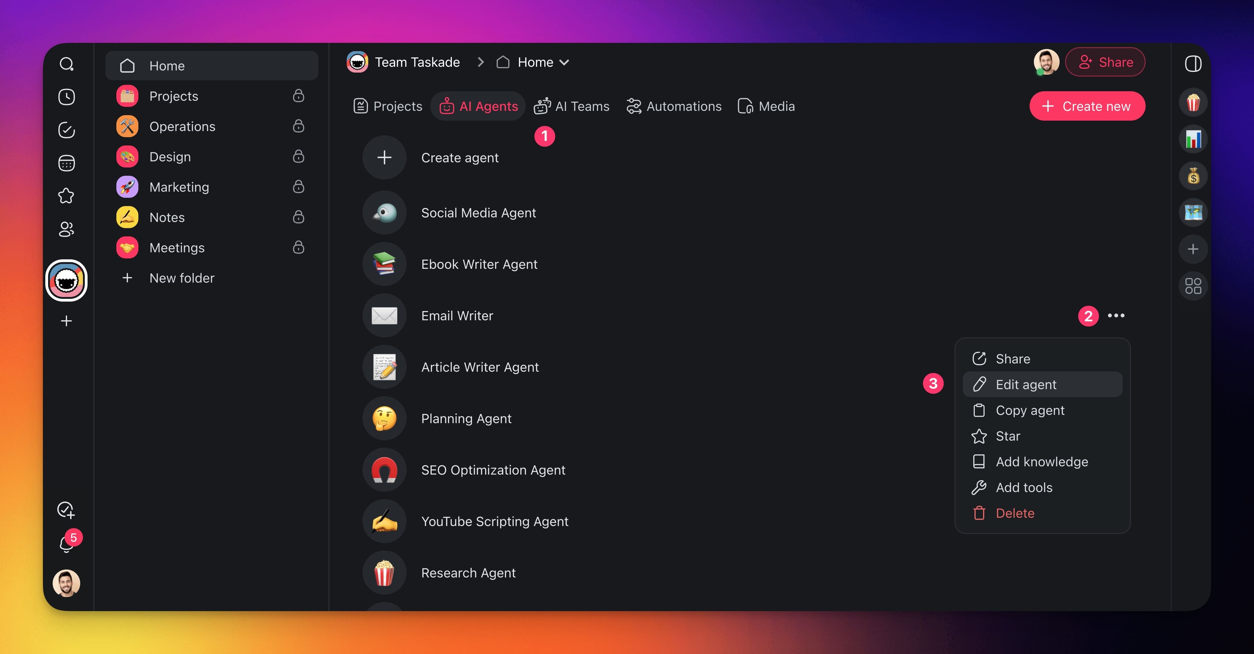 - Click the three dots ··· next to an agent and select ✏️ Edit agent from the list.