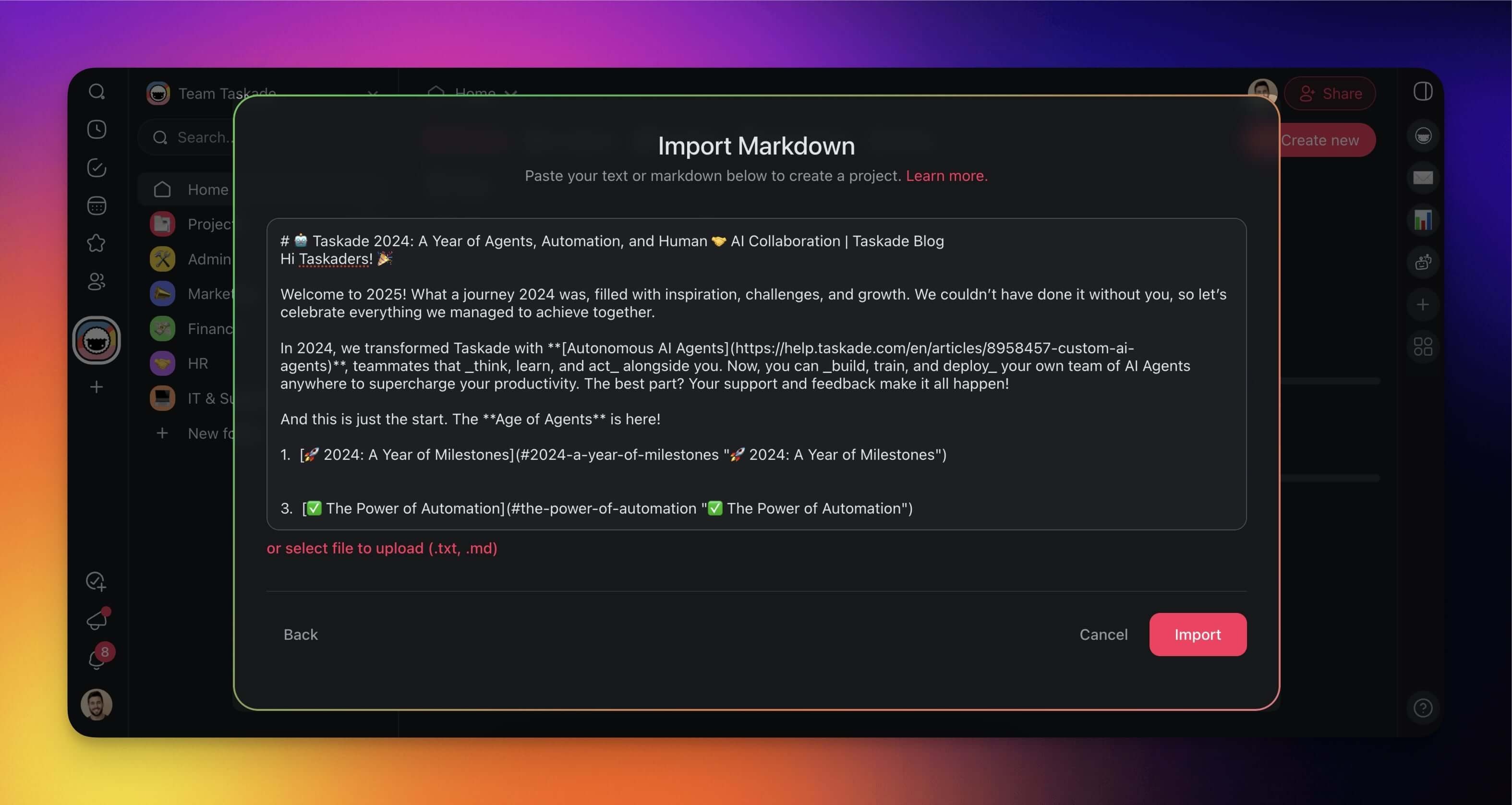 There are several ways to import your Markdown documents into Taskade.