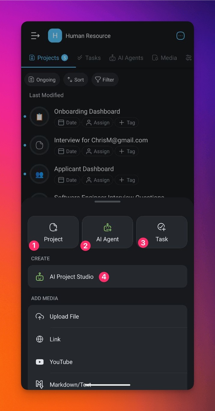 - AI Project Studio (Mobile): Generate projects, tasks, and workflows.