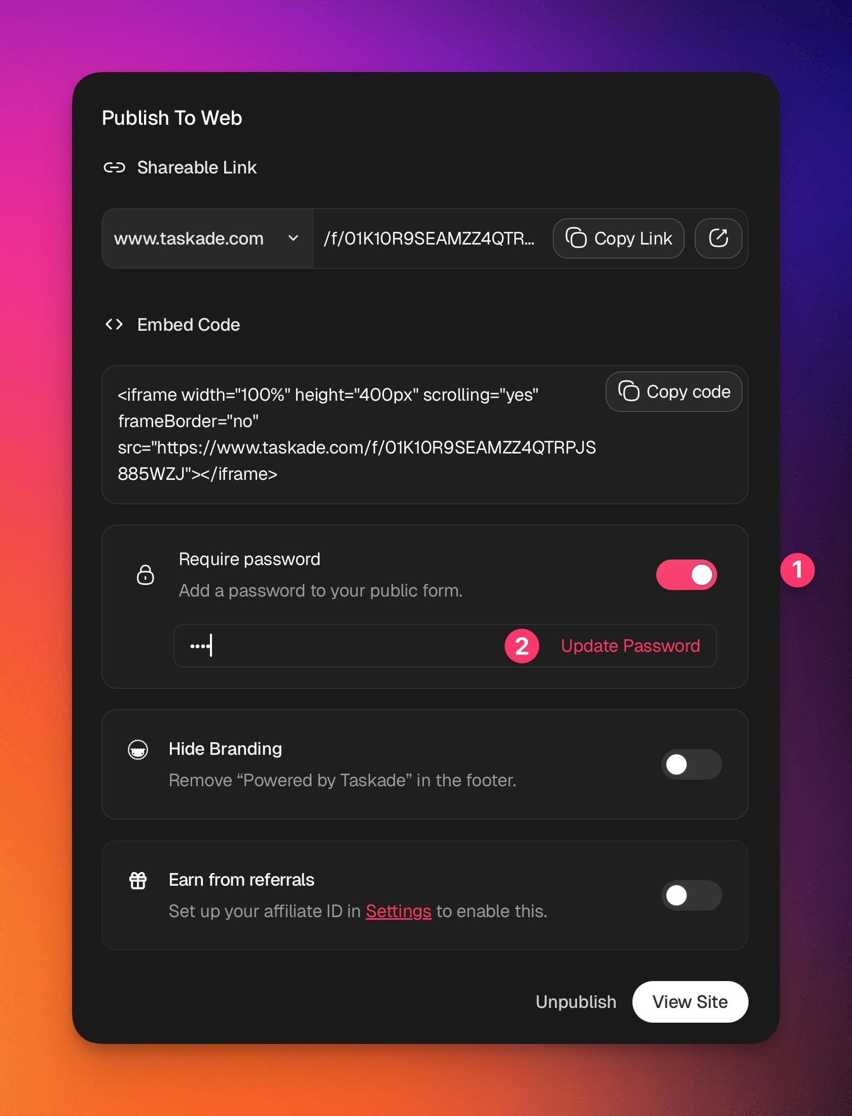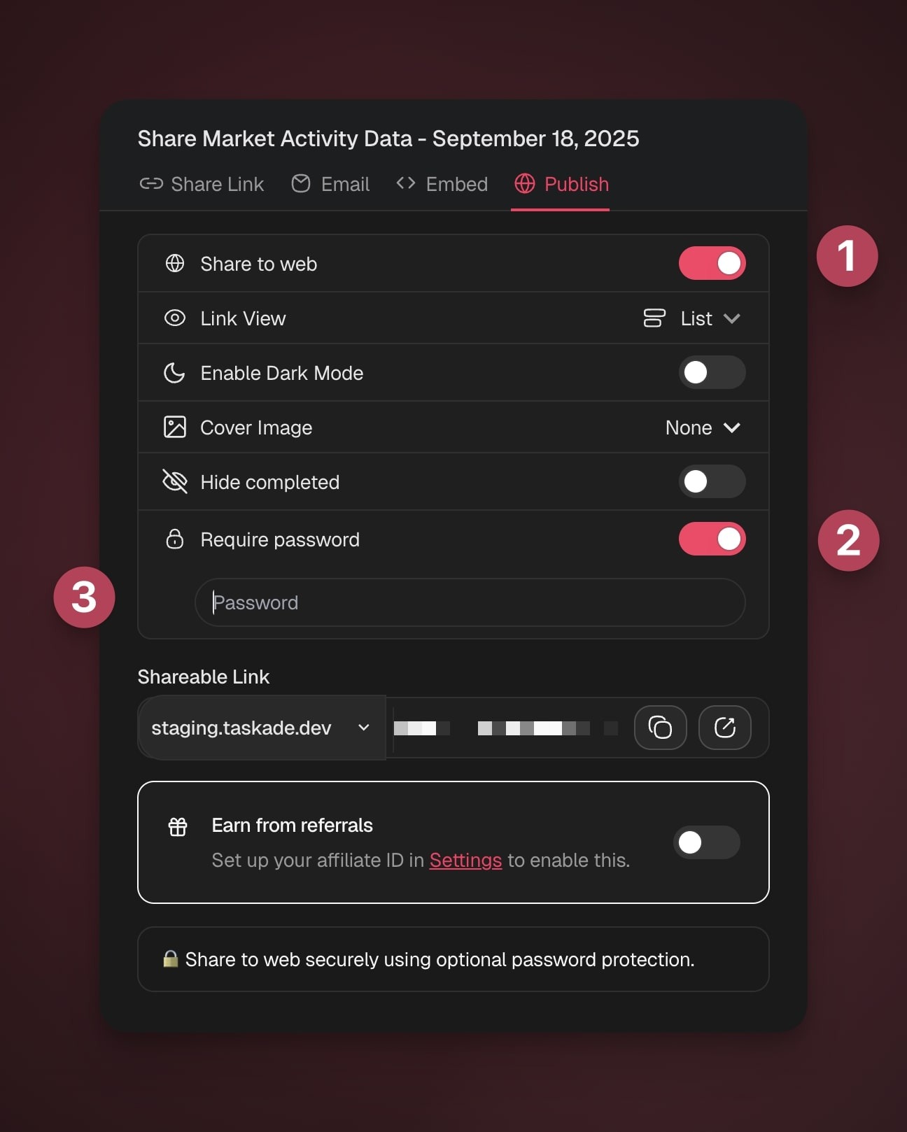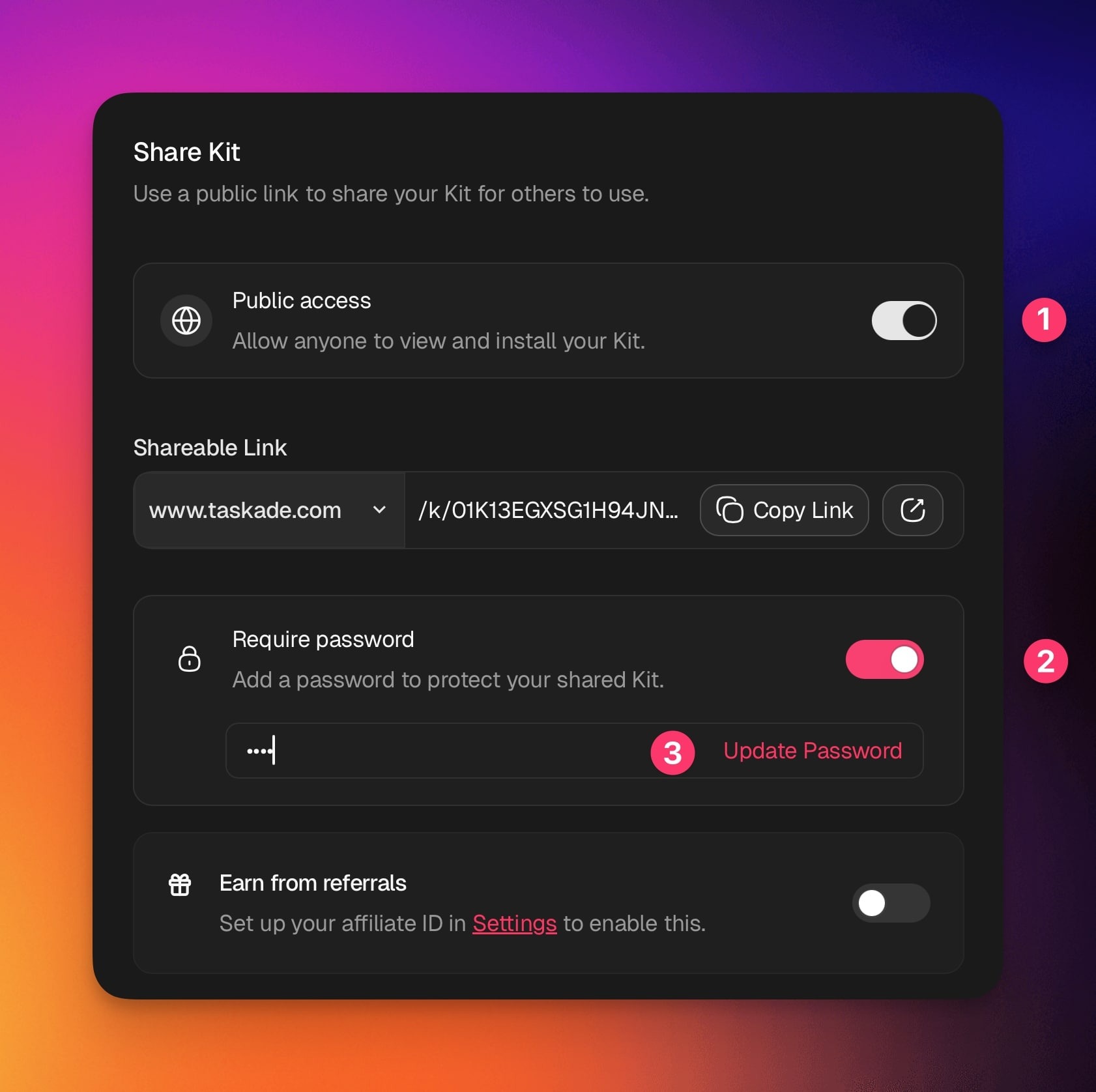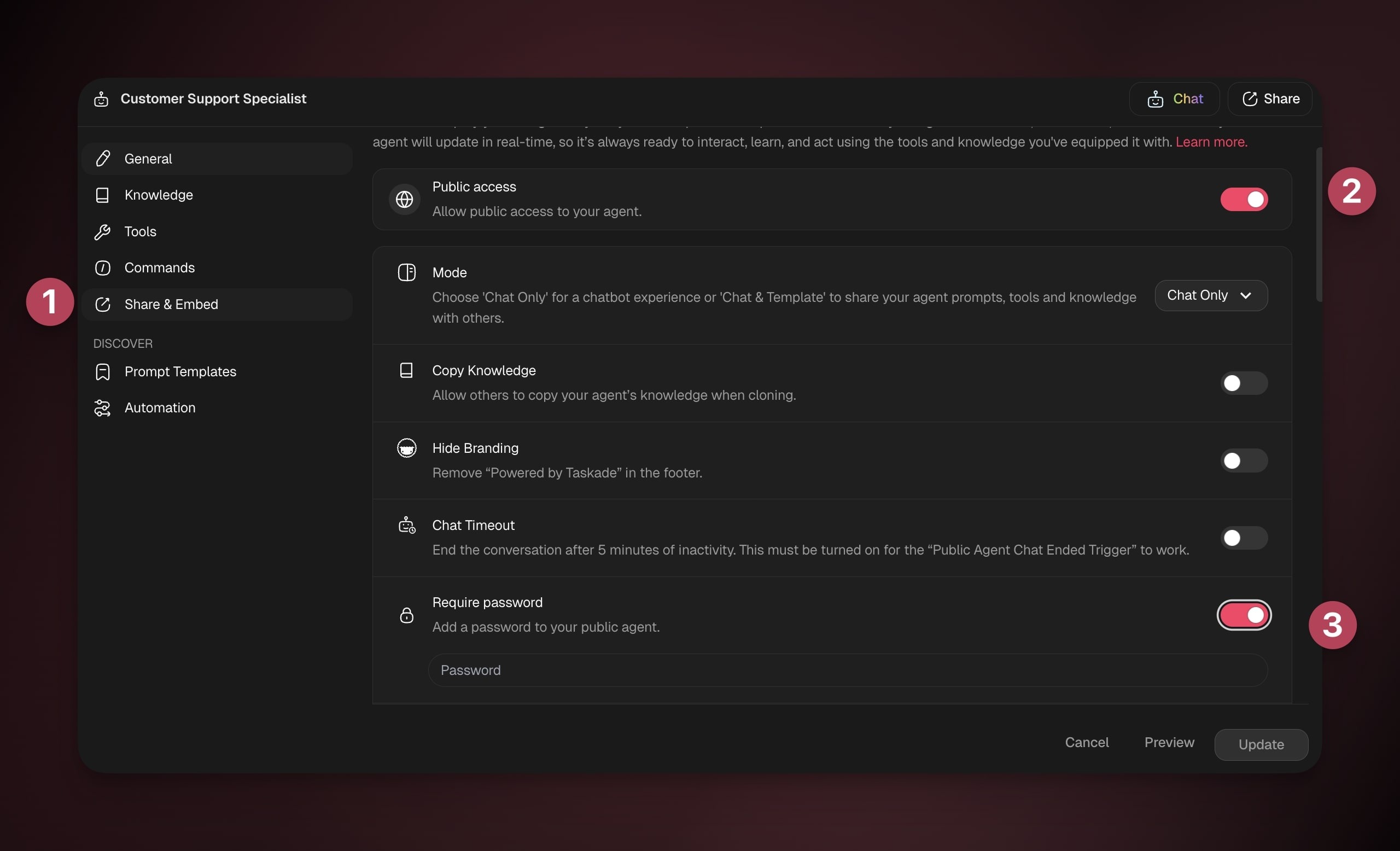 Password protection allows you to control access to any public link shared from your Taskade workspace. This includes AI Agents, Forms, Kits, and Automations. Use this feature to add an extra layer of privacy when sharing resources outside your team.