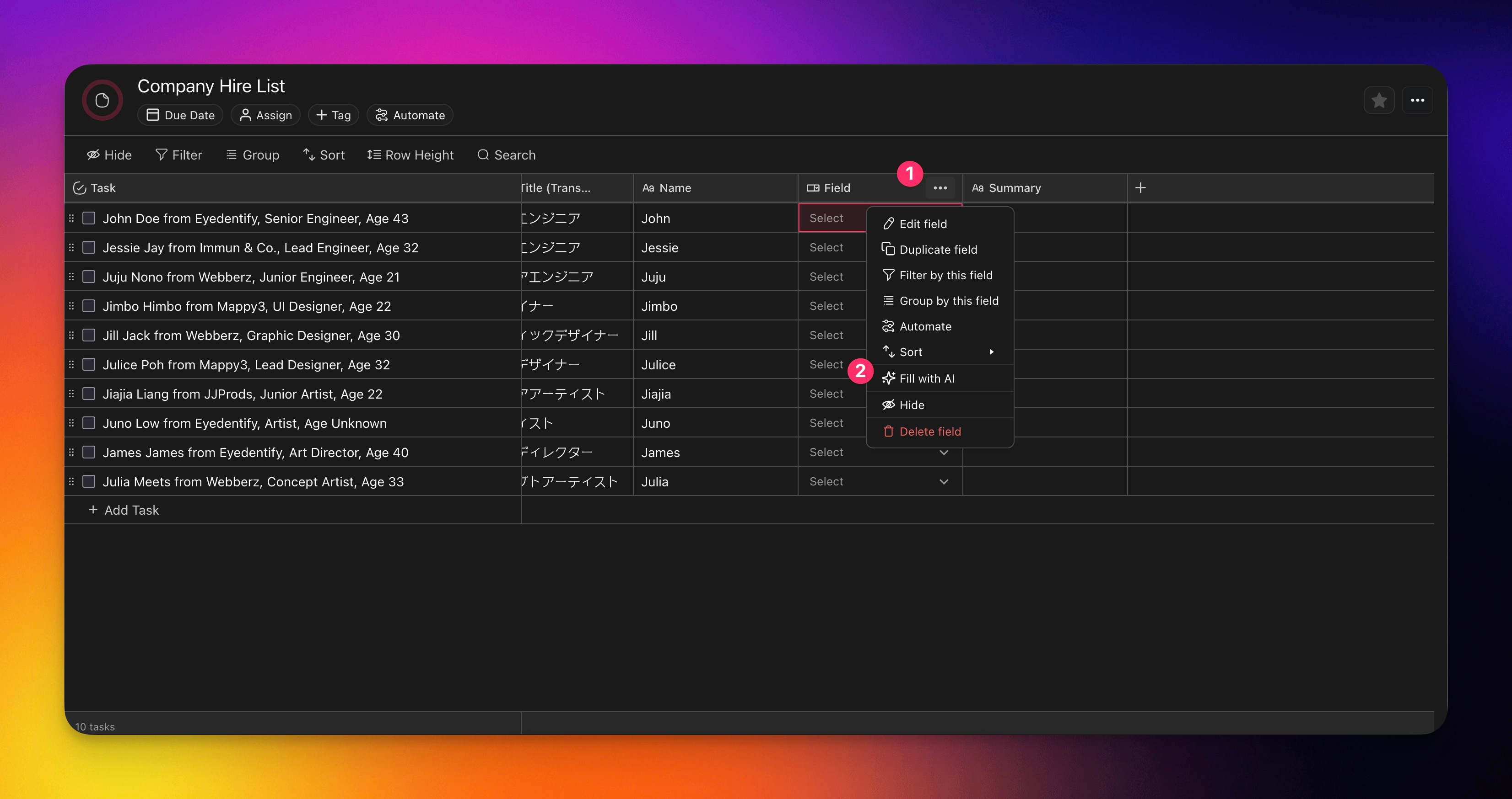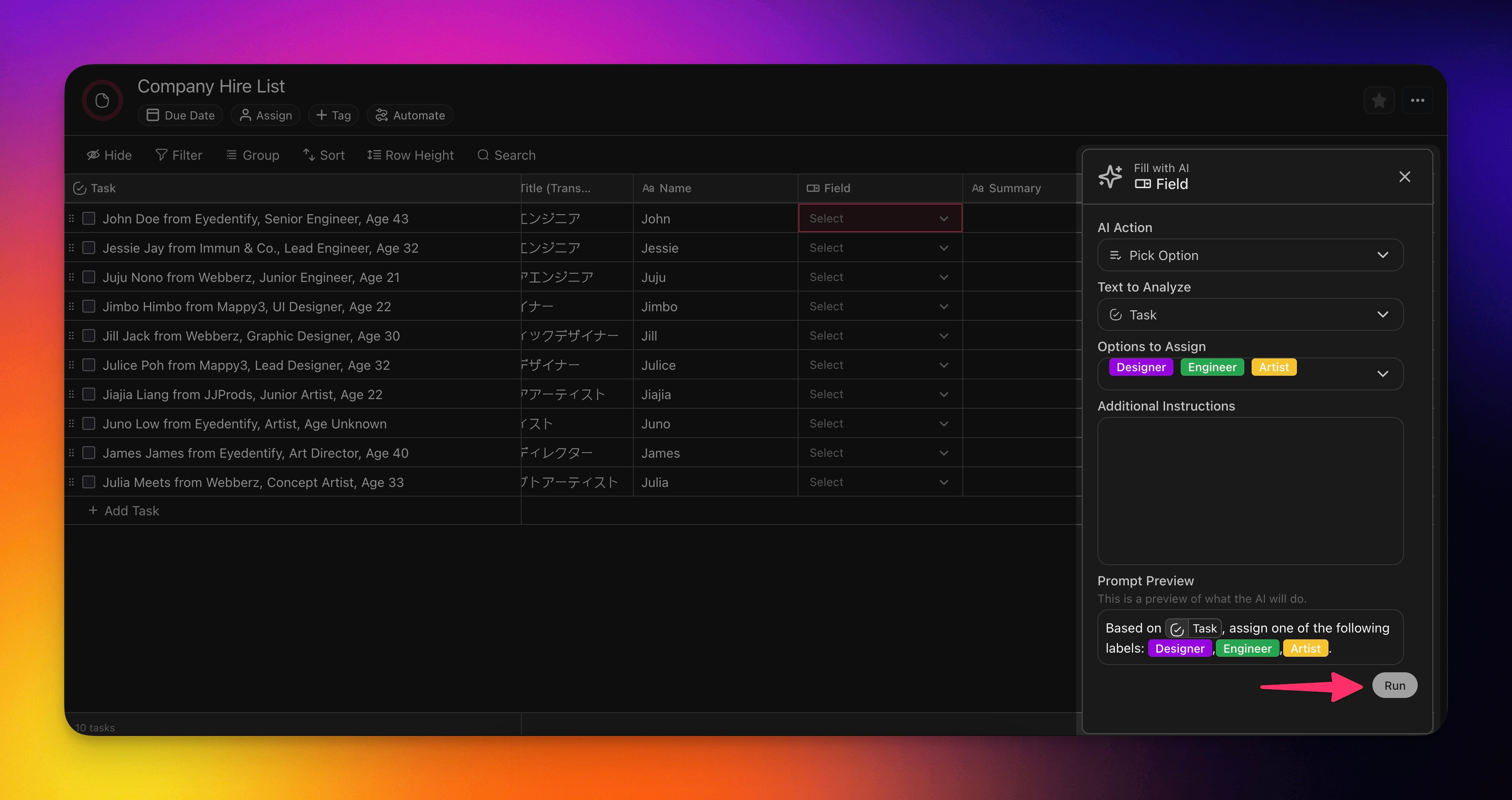 Fill up a Select Field column using AI.