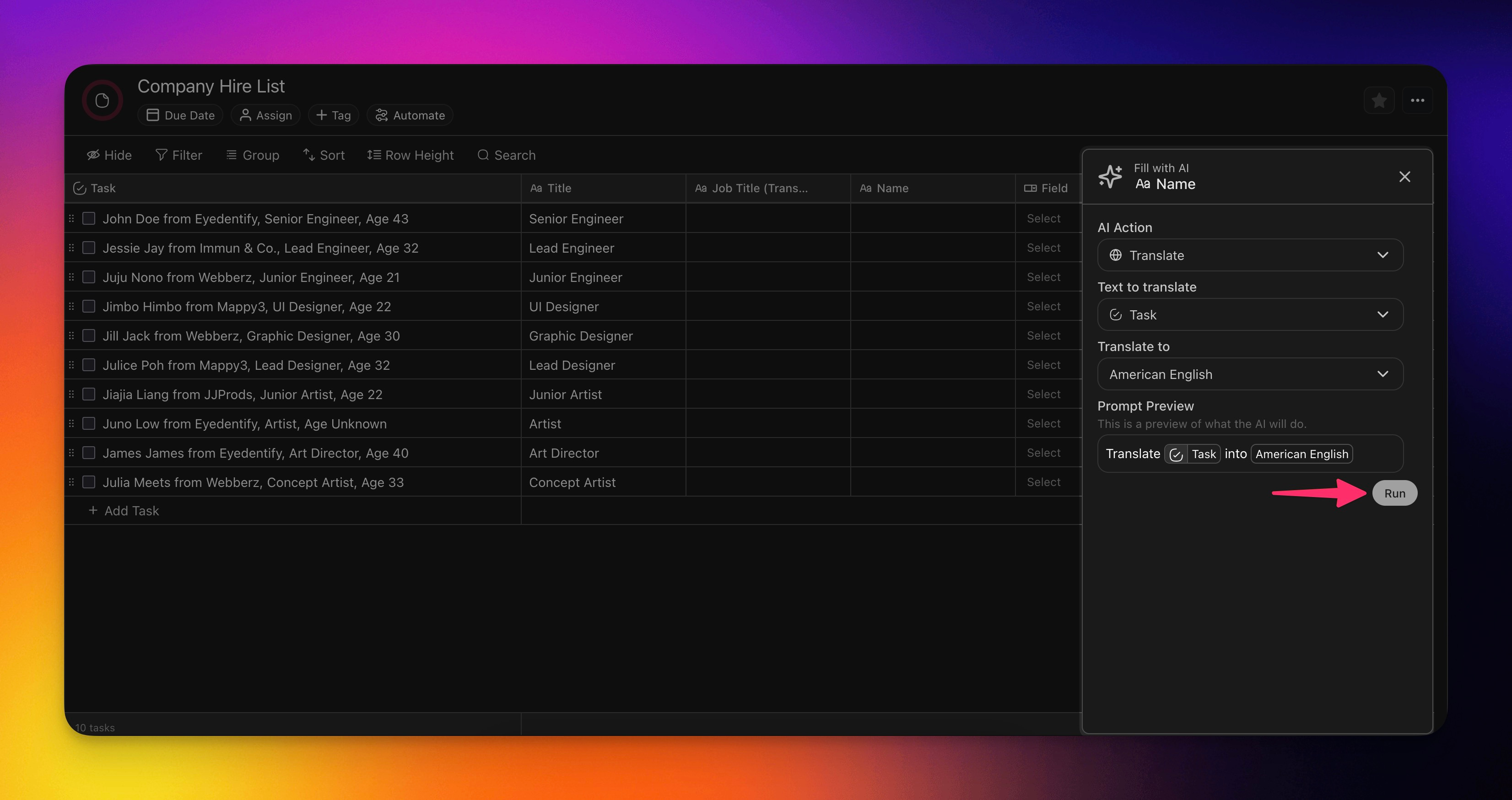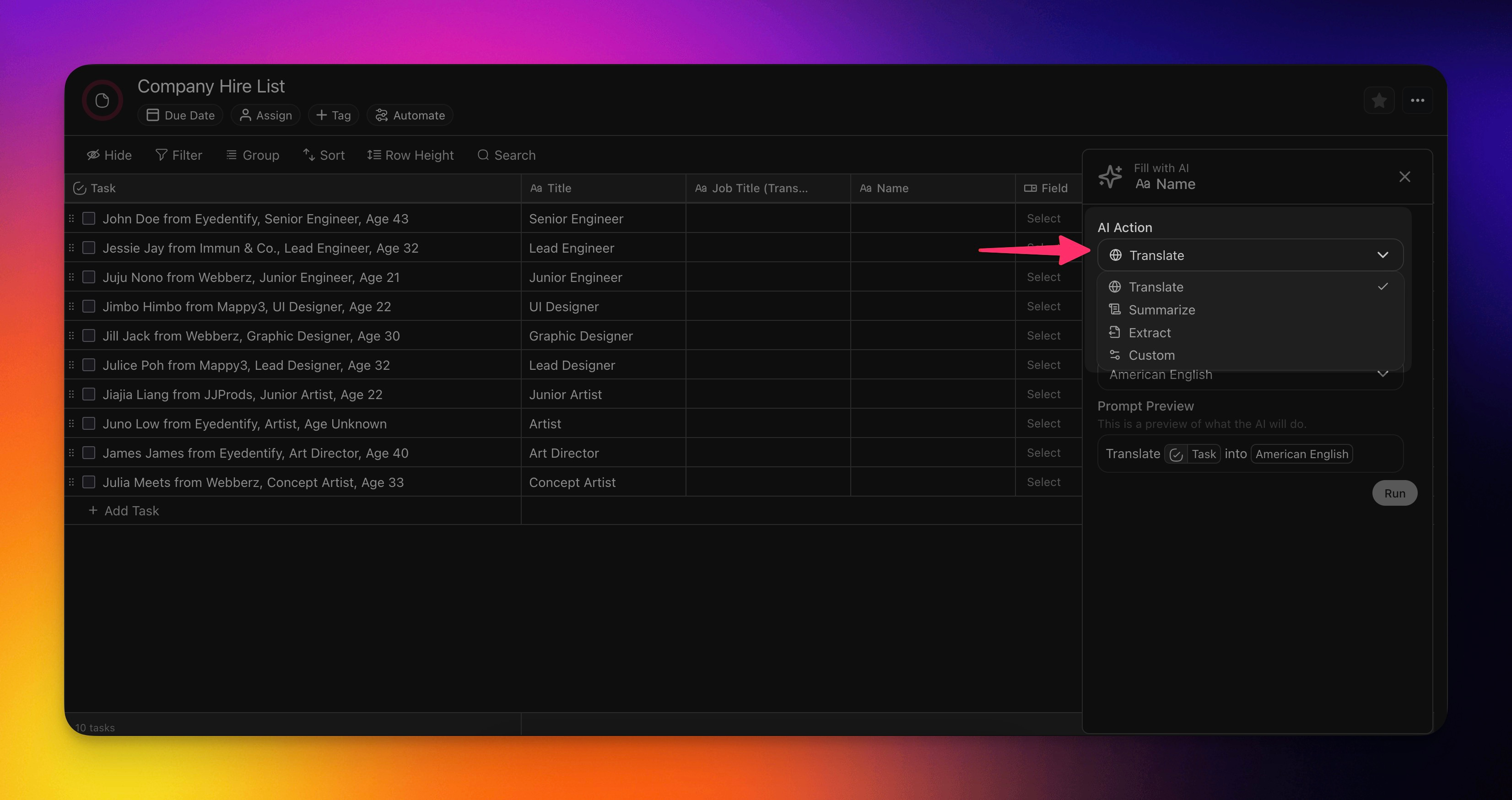 Fill in AI in the Table View allows you to automatically populate table columns. Translate, summarize, or extract information without extra manual steps.