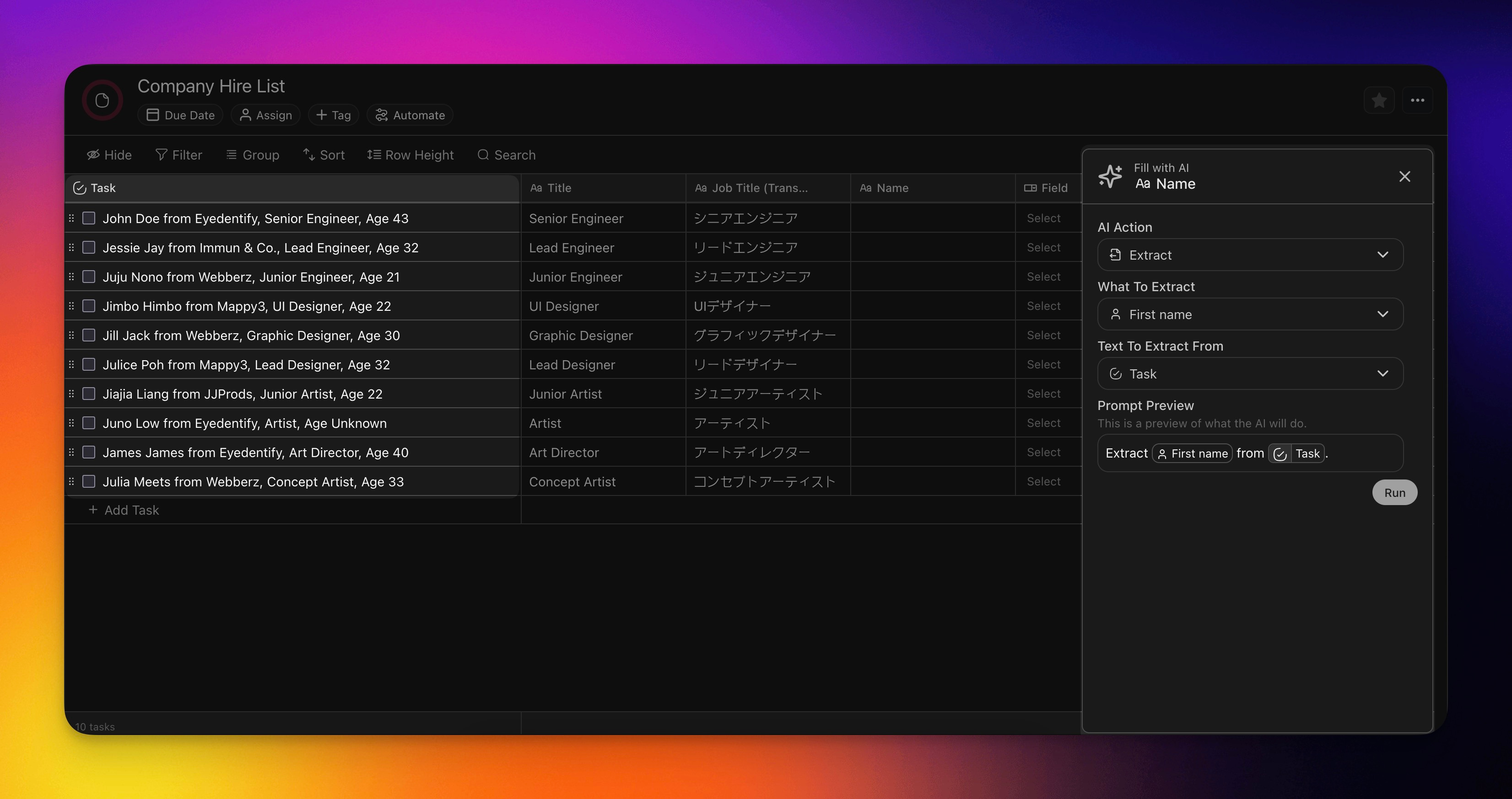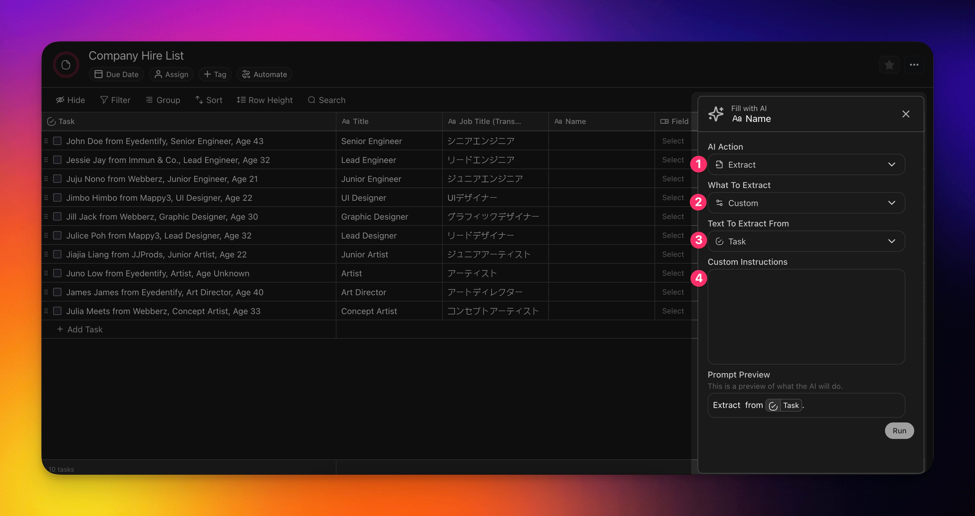 | Extract information from another column, and fill up this column accordingly. | Select the type of information to extract. | Select a column to extract from. | Prompt the AI with specific instructions on how you want the information to be extracted. |