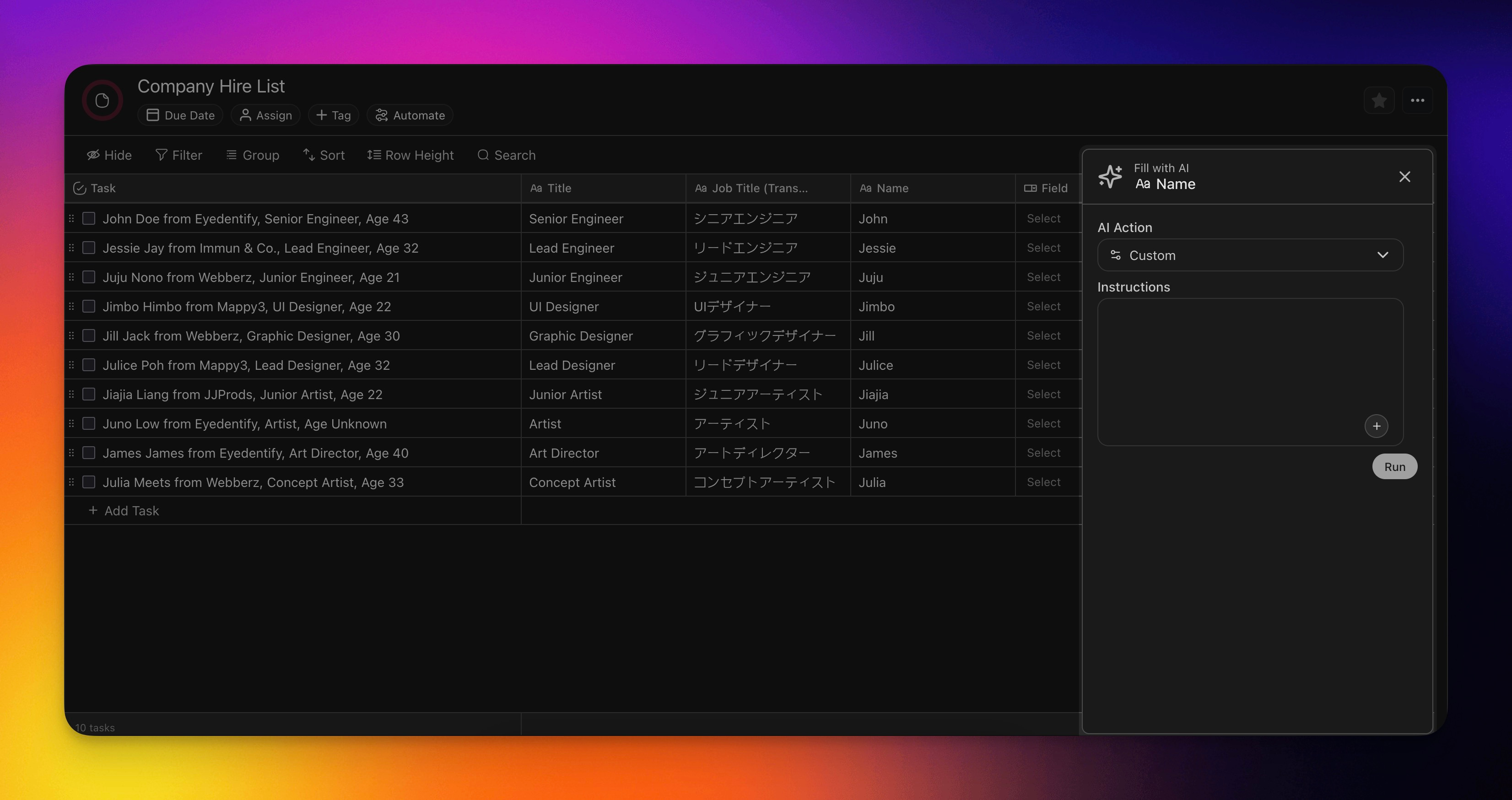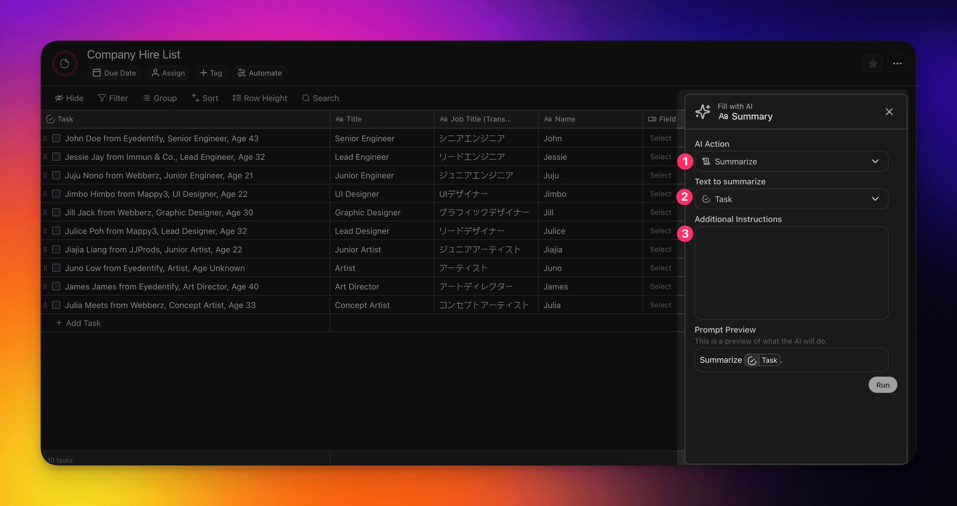 | Summarize another column, and fill up this column accordingly. | Select a column to summarize. | Prompt the AI with specific instructions on how you want the information to be summarized. |