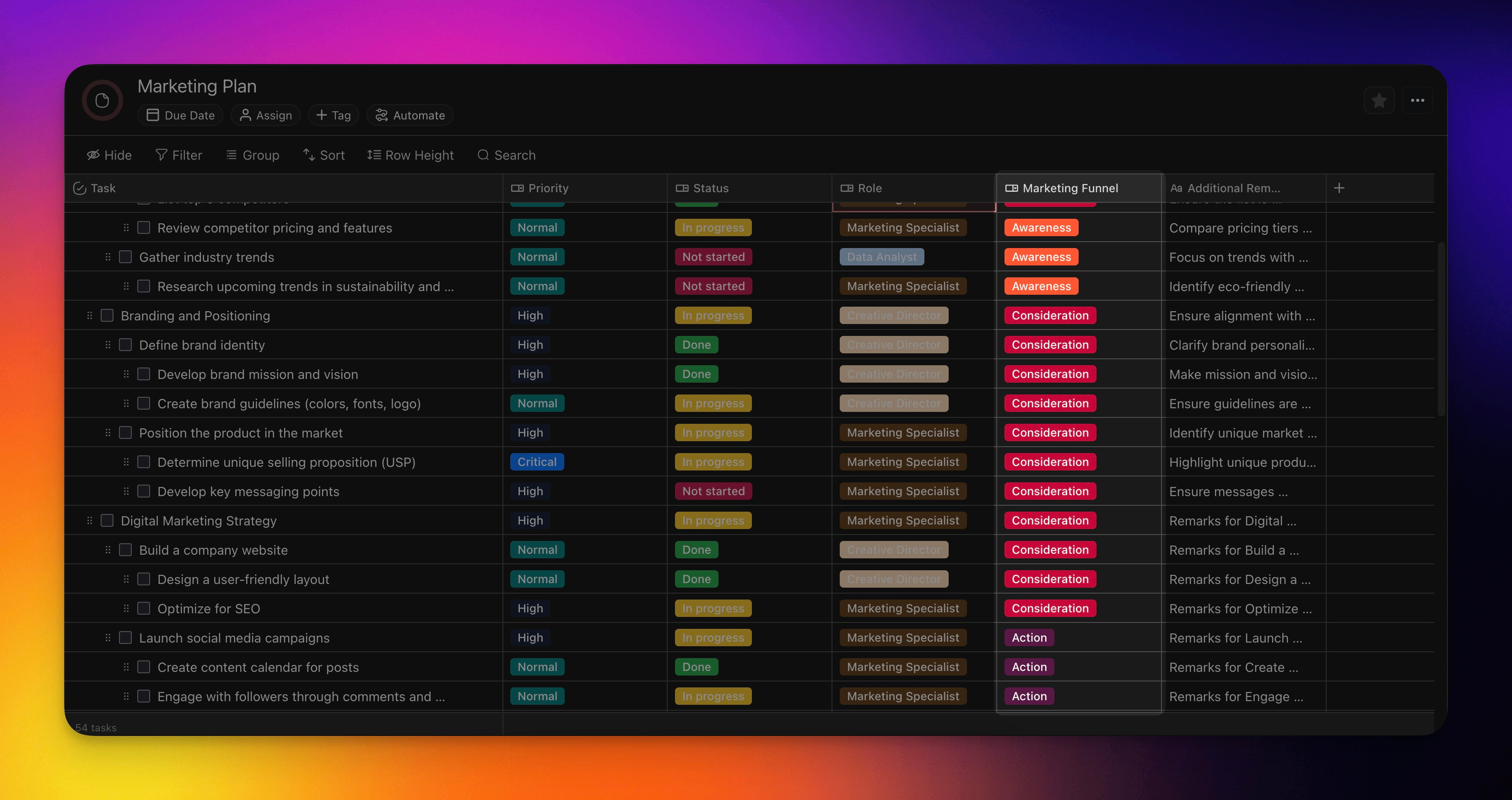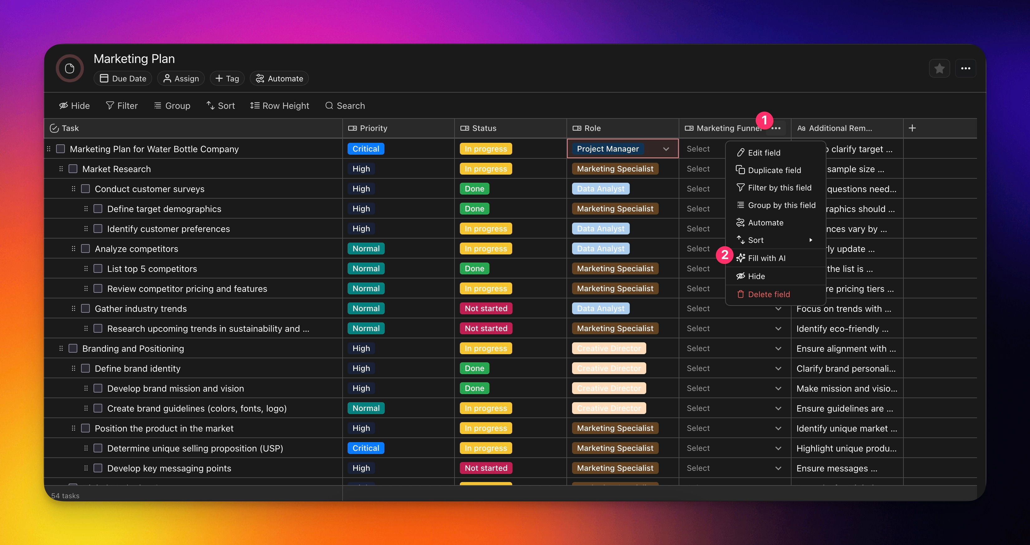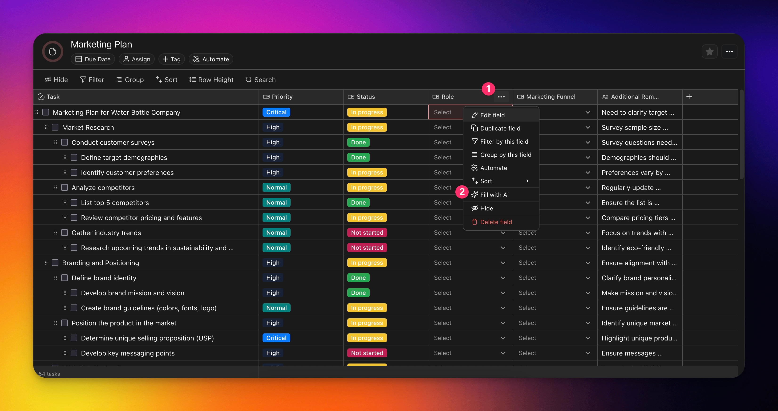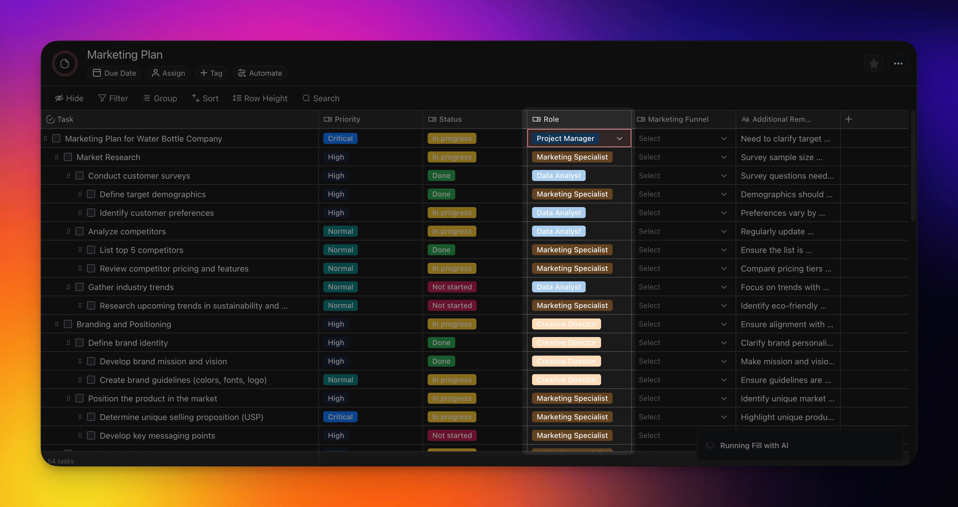 You can utilize Fill with AI to quickly identify where in the marketing funnel each task will fall under.