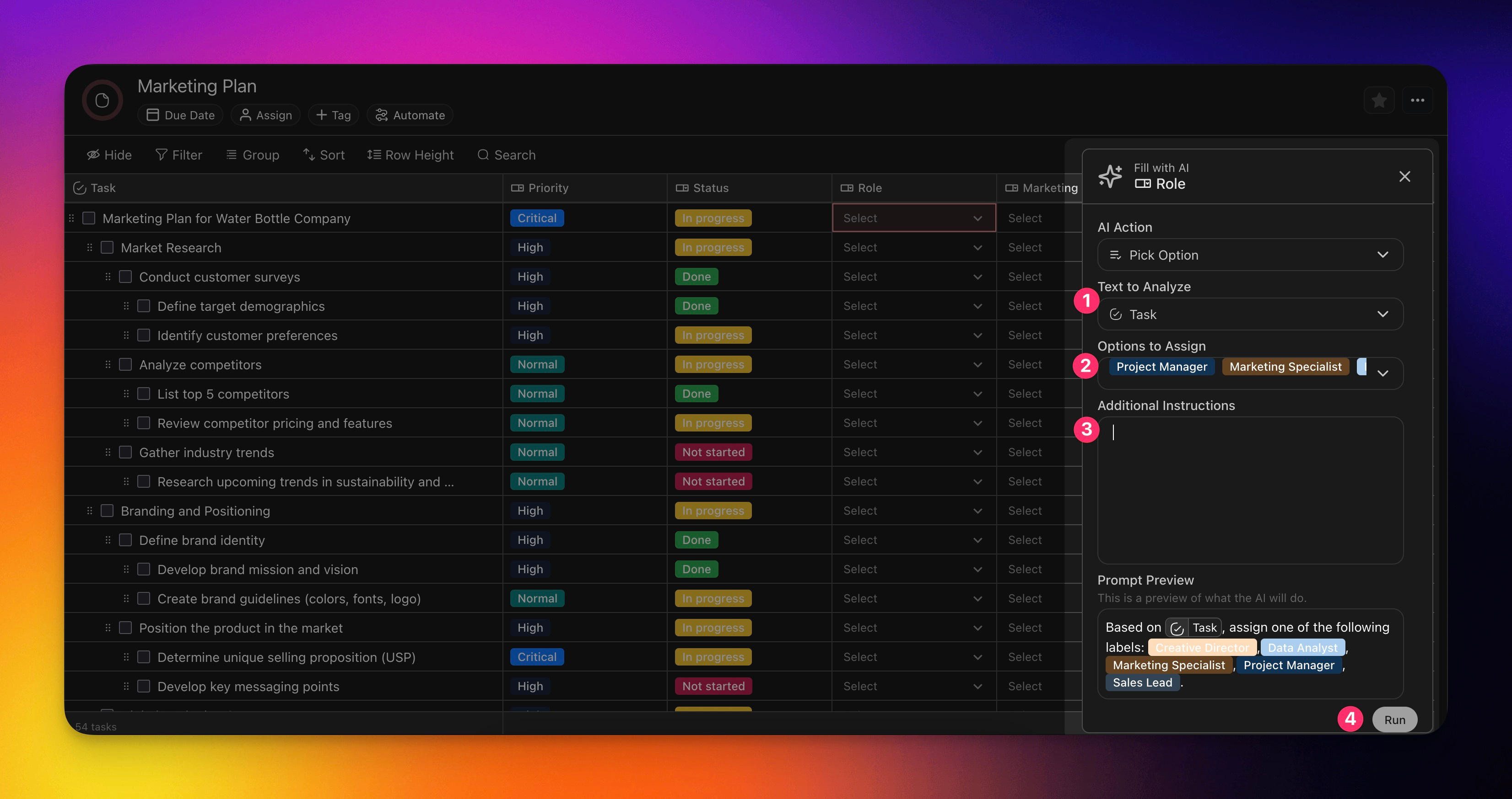 4. You can provide additional instructions for the AI to process. For example: "determine where in the marketing funnel each task belongs to".