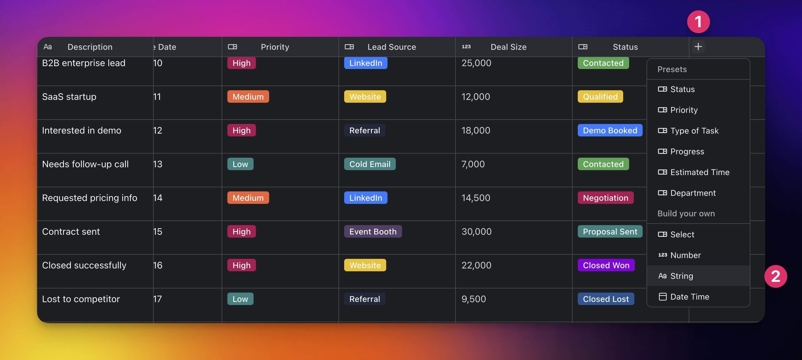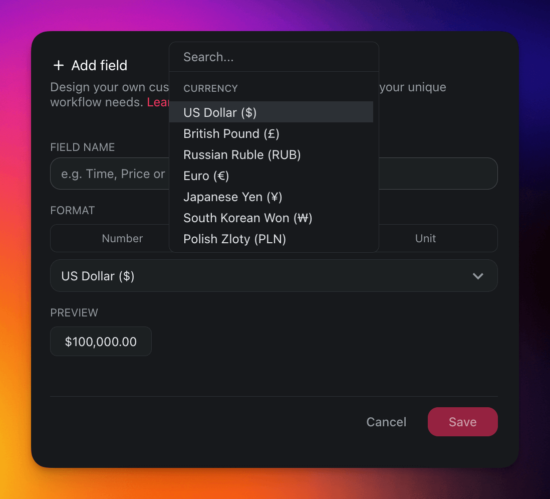 | Add and work with plain numbers, perfect for quantifications, numerical records, or data analysis. | Add currency values, perfect for financial tracking, budgeting, and cost-related projects. | Represent your data in percentages, perfect for tracking completion rates and performance metrics. |