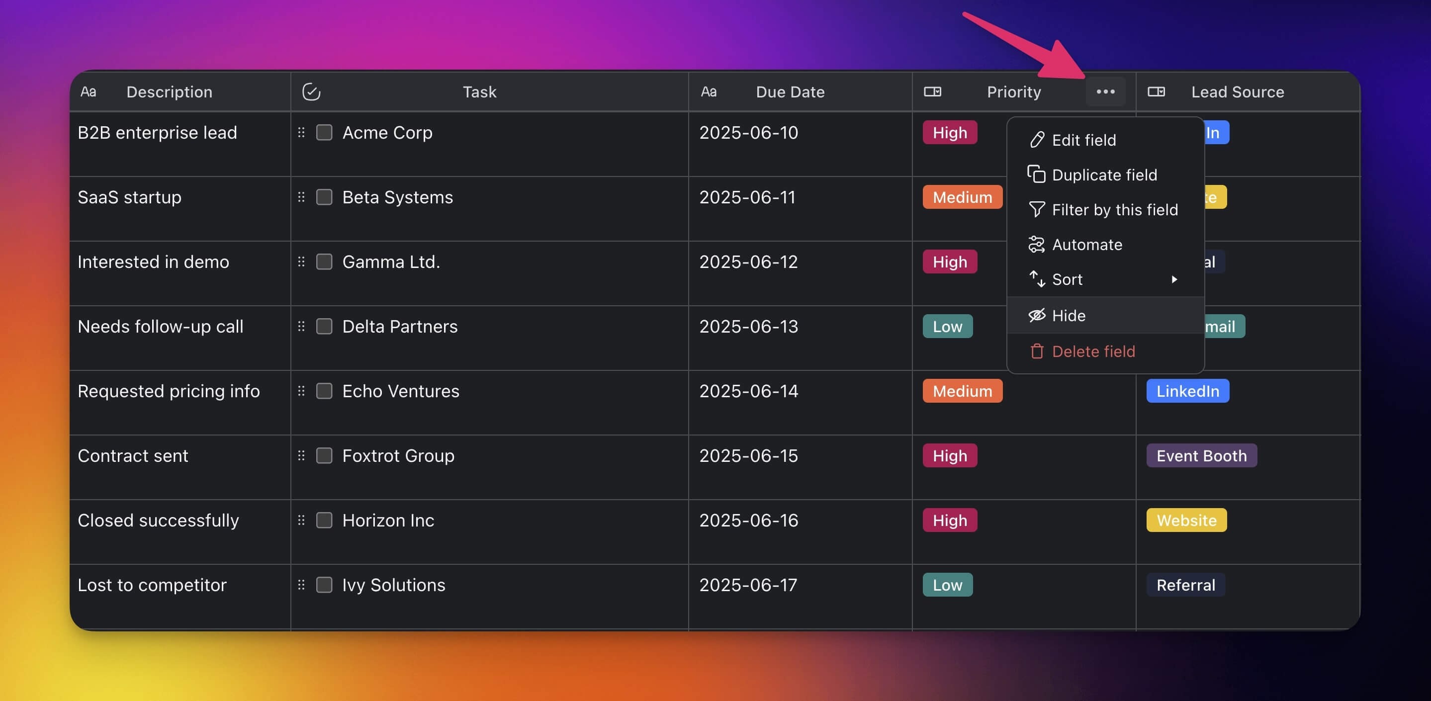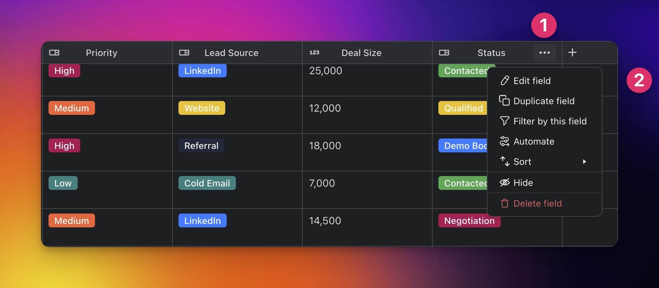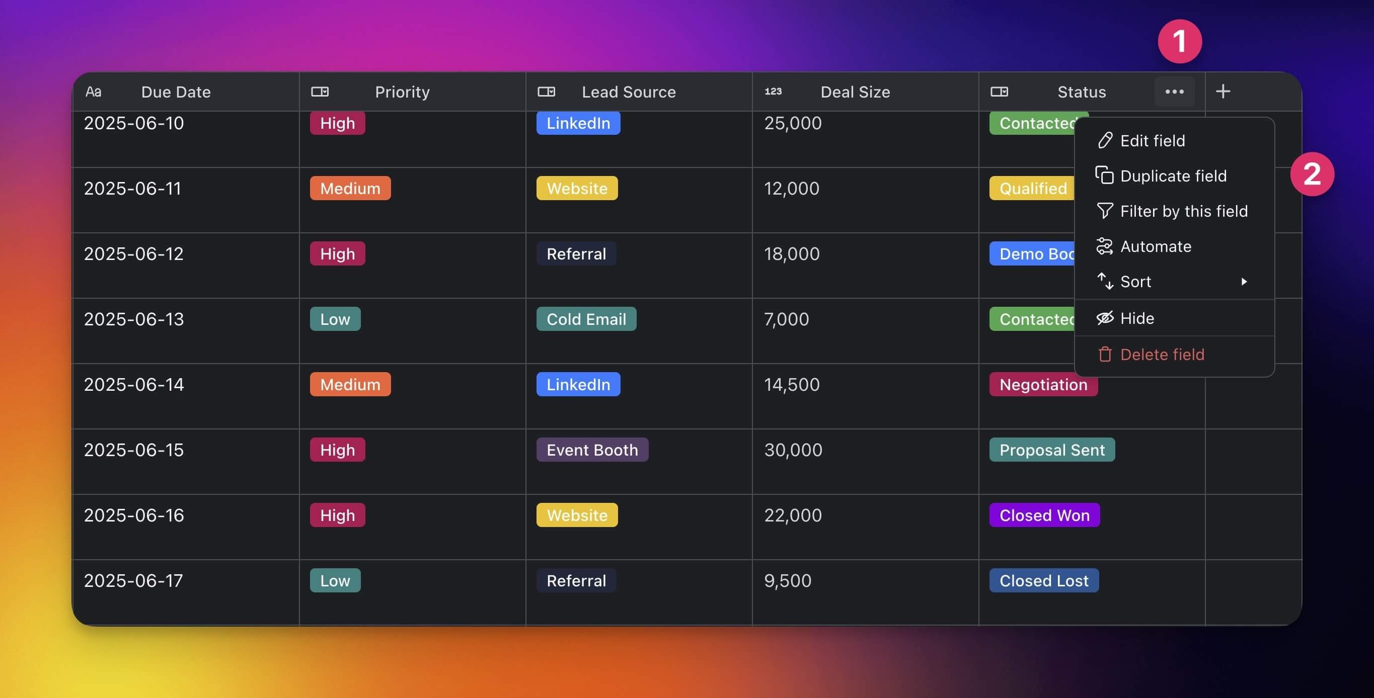 Click the ยทยทยท (three dots) next to a column header (e.g. Status).