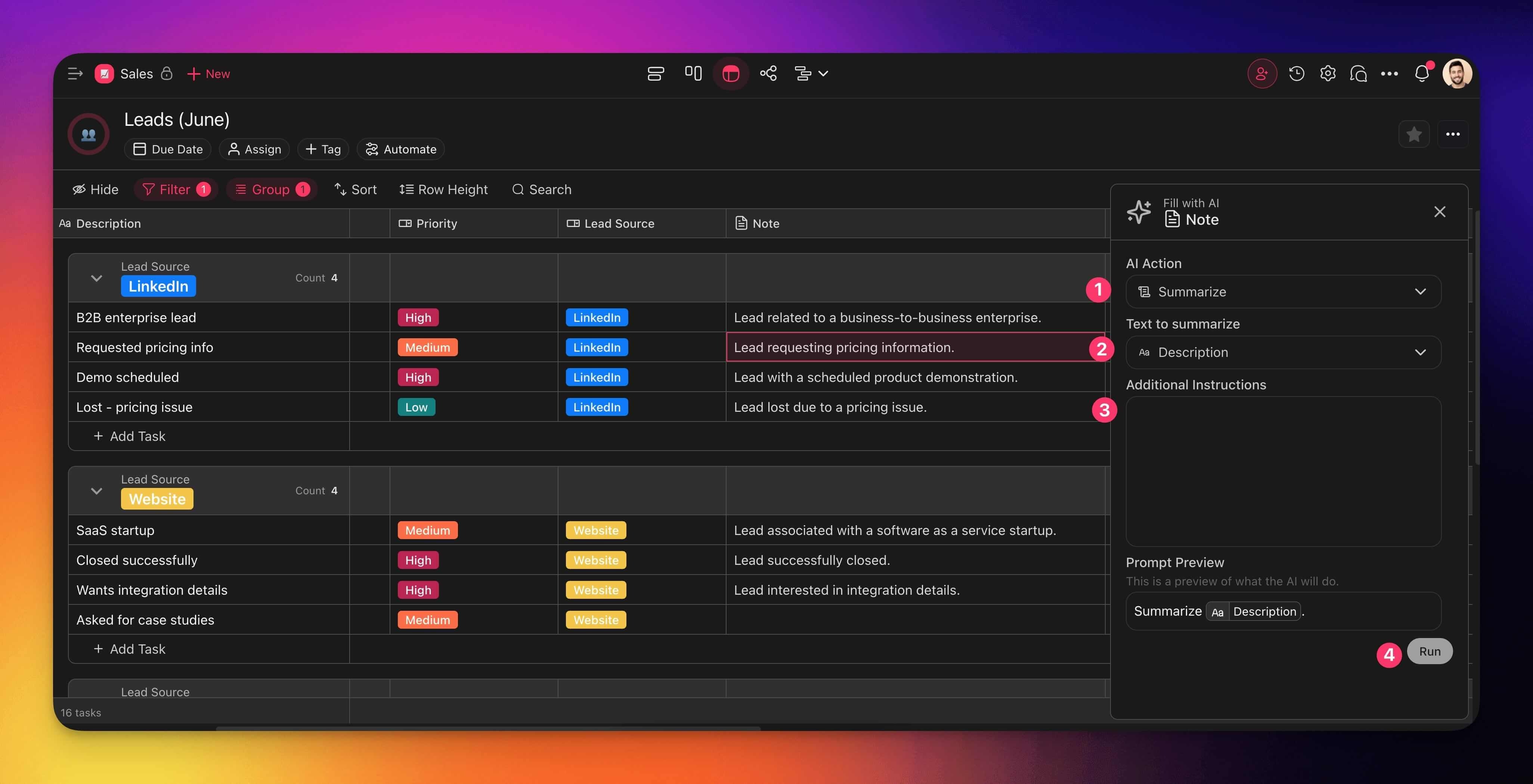 - Click Run to fill the selected column with AI-generated content.
