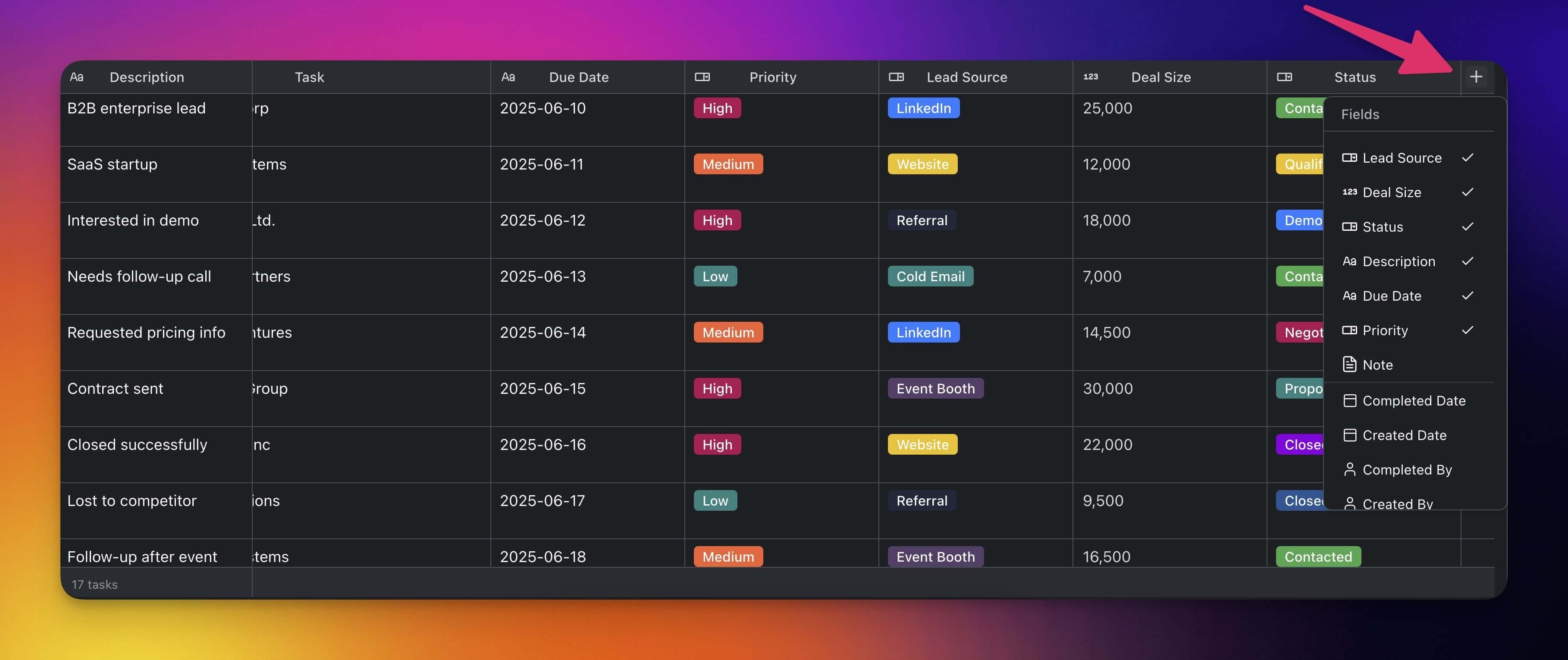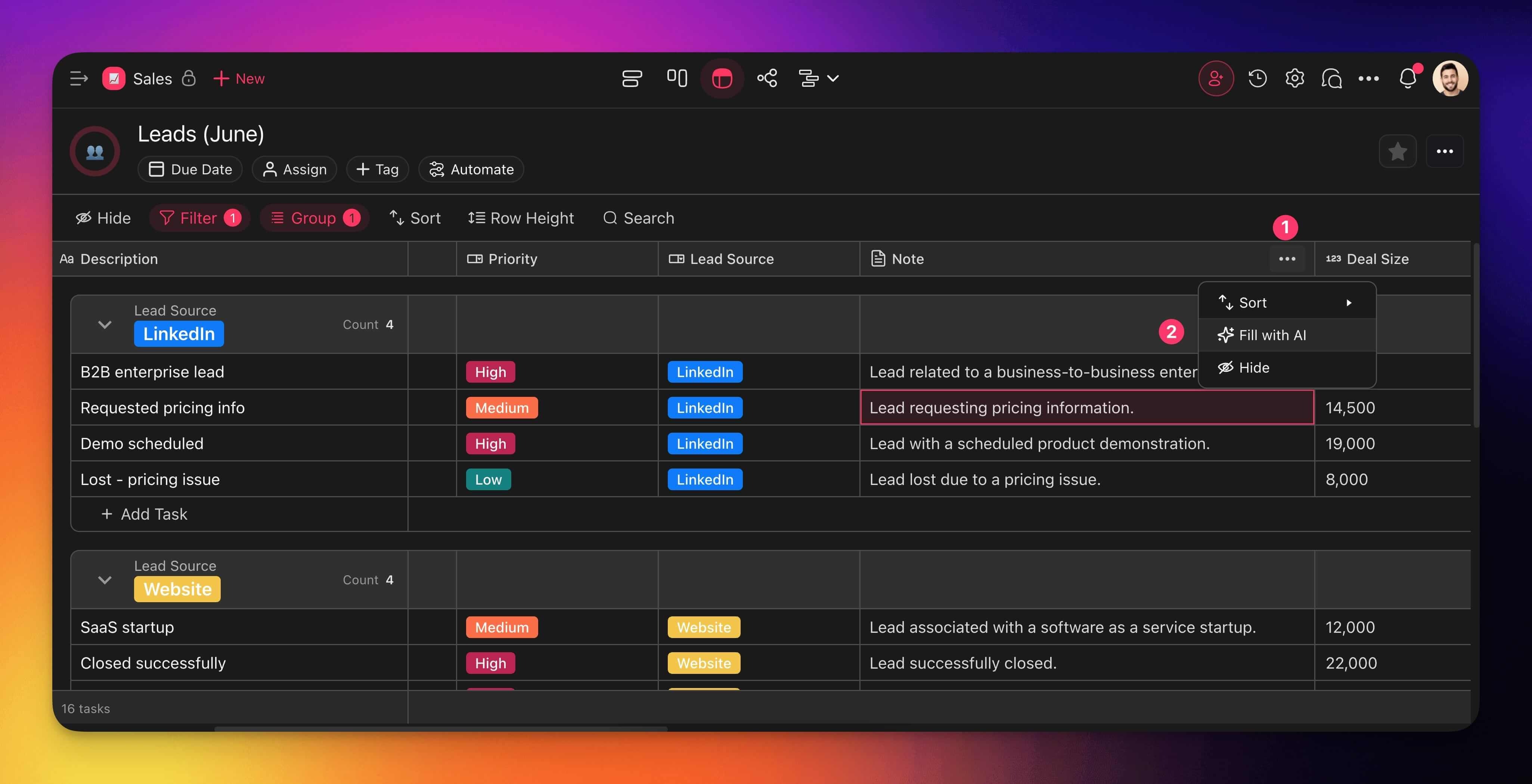 - Click ยทยทยท next to a column header (e.g. Note).