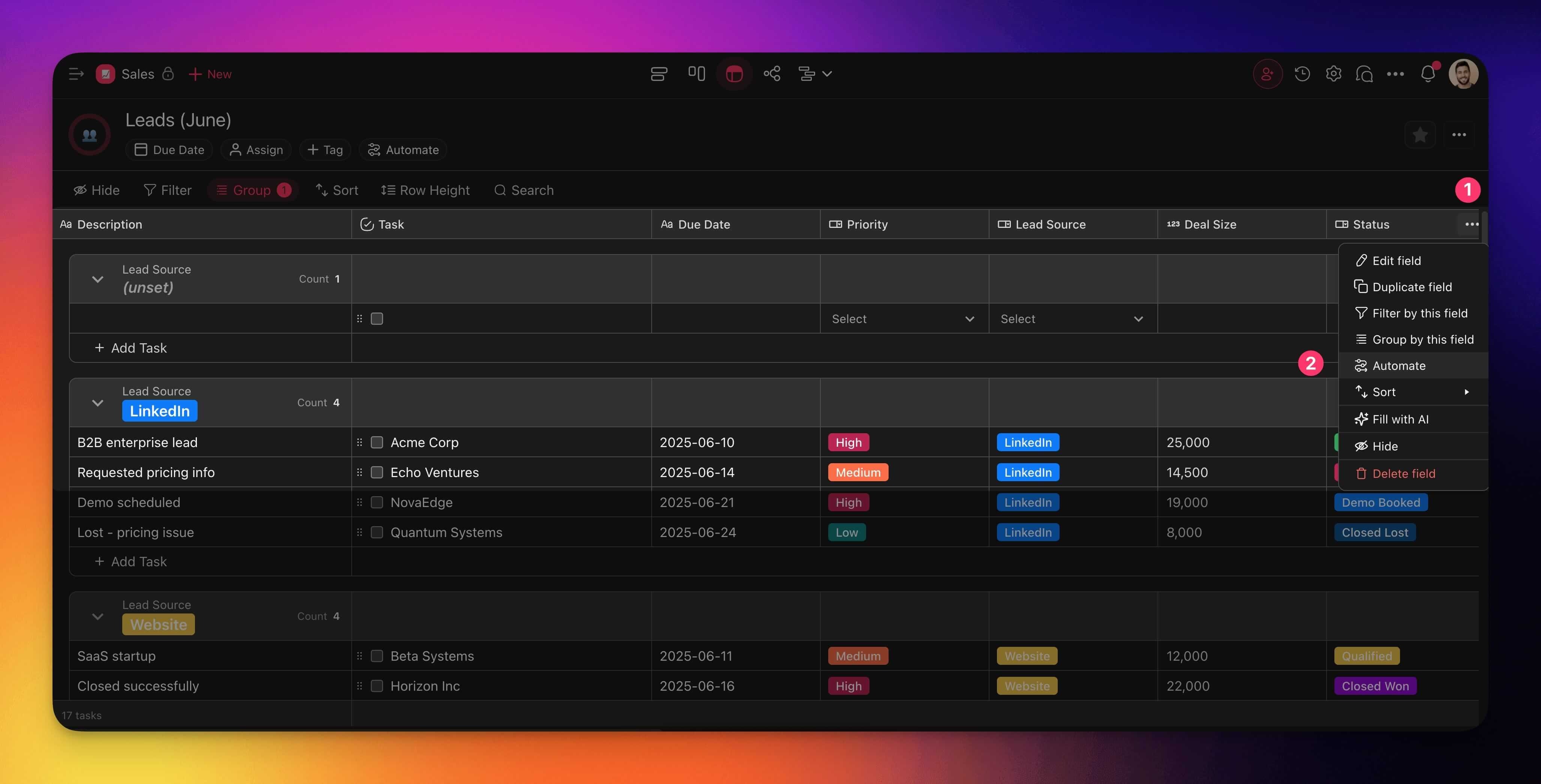 The Automate feature lets you build simple workflows that run when something changes in your table, e.g., when a task status is updated.