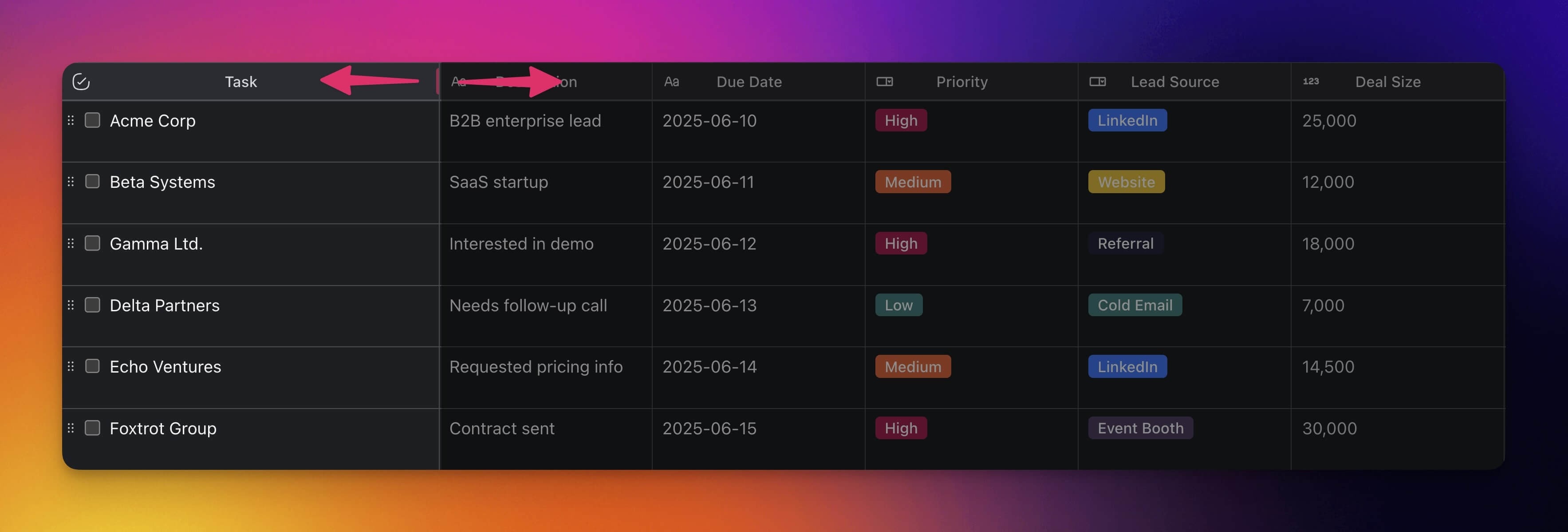 - Click and hold a column divider and drag it to the left or to the right.