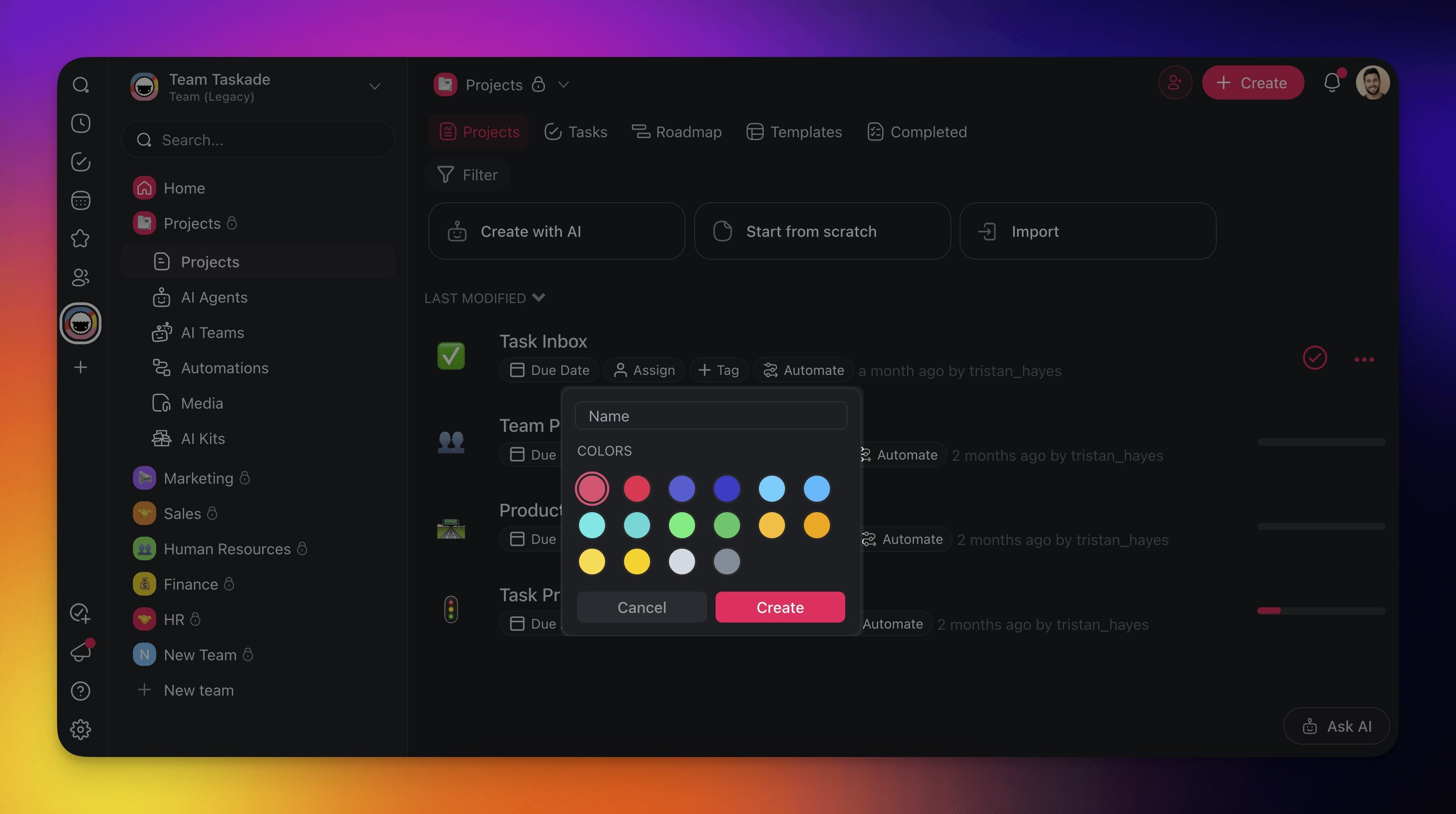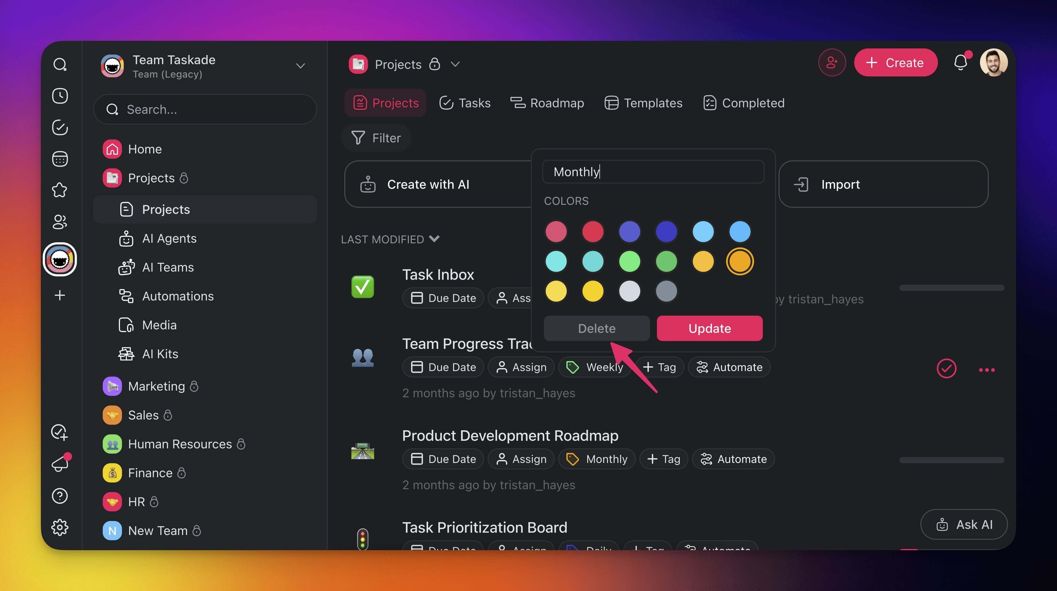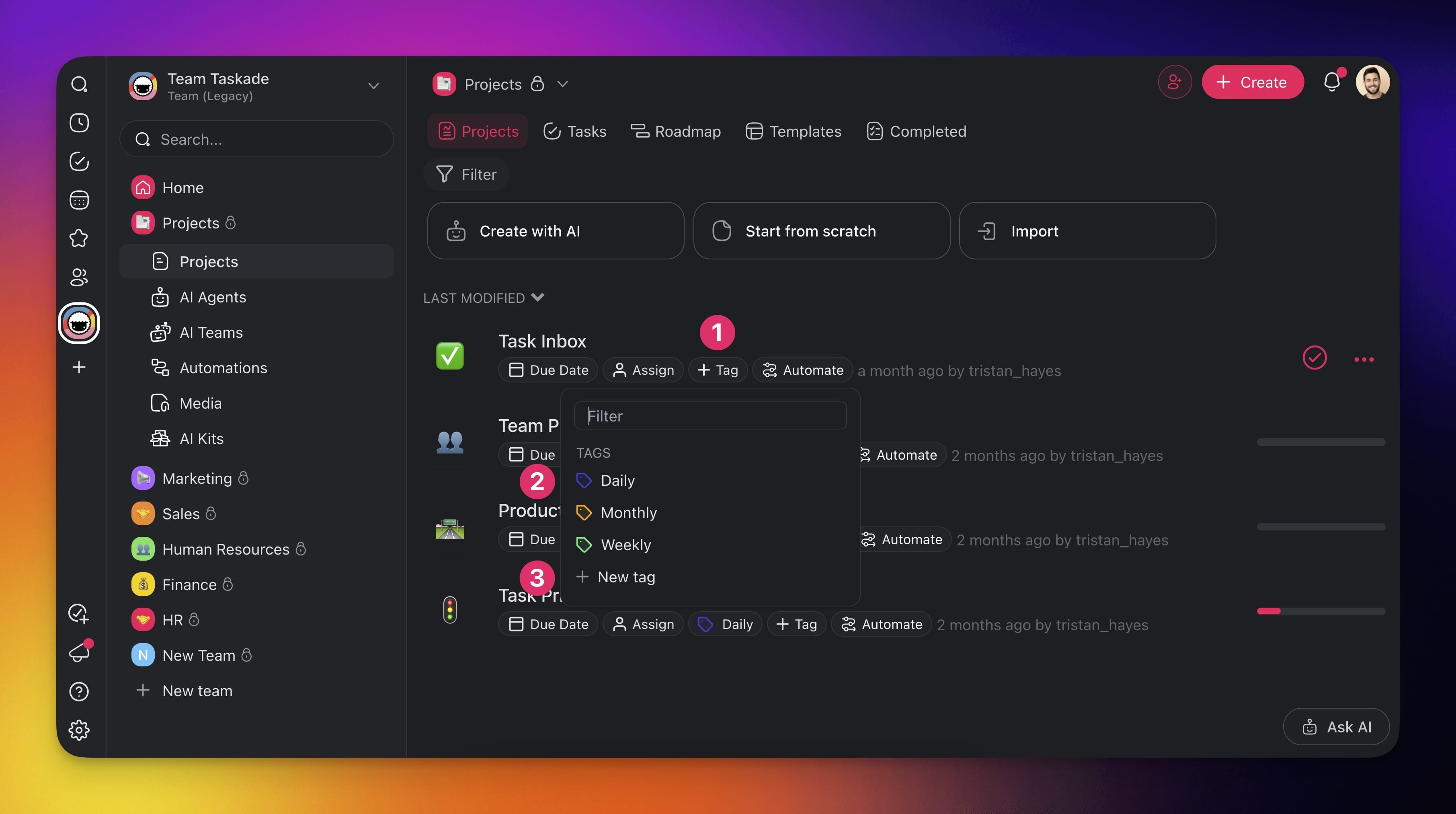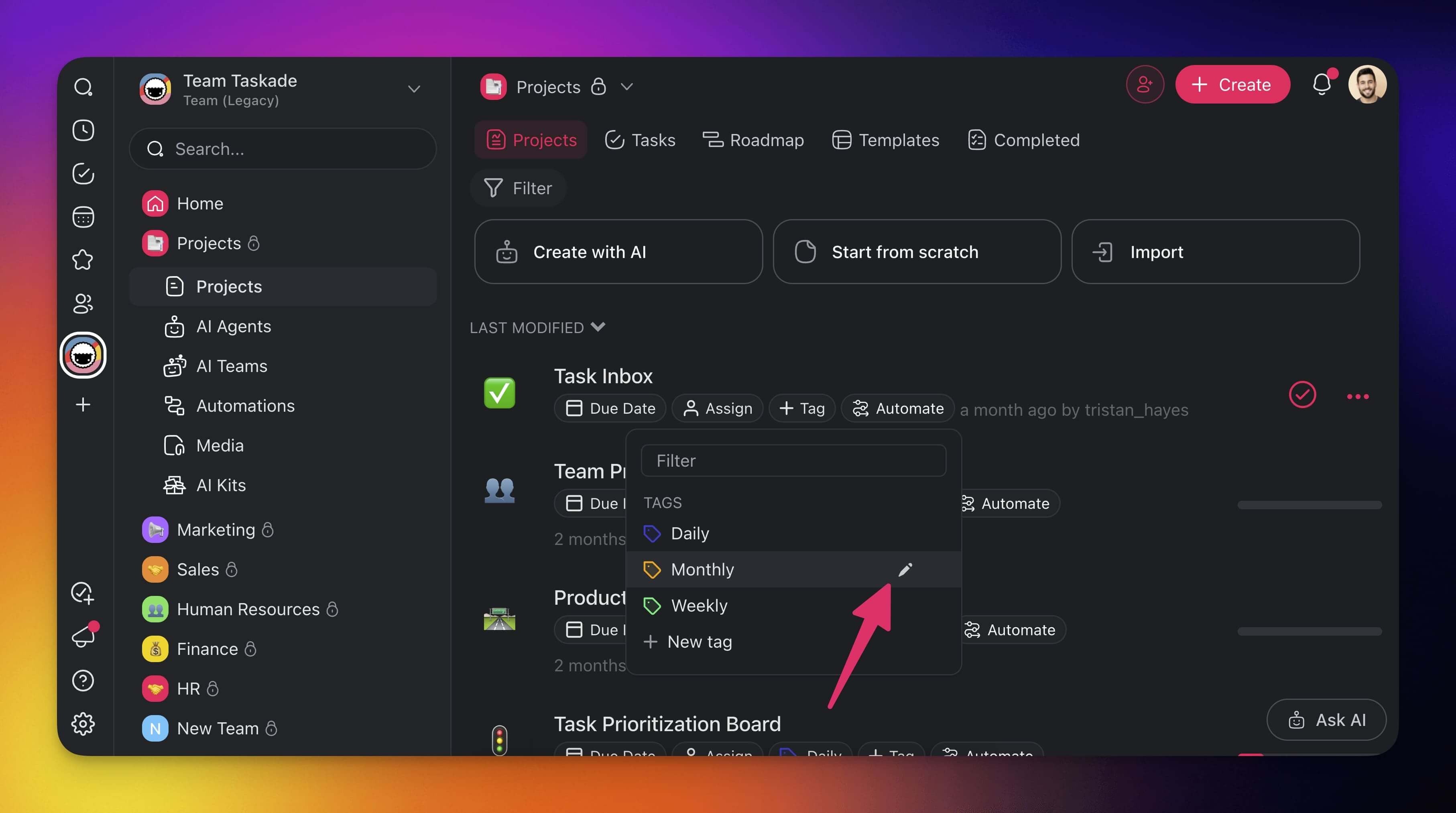 Tags make it super easy to organize projects inside a workspace or team. You can create unlimited color-coded tags to group projects and filter workspaces.
