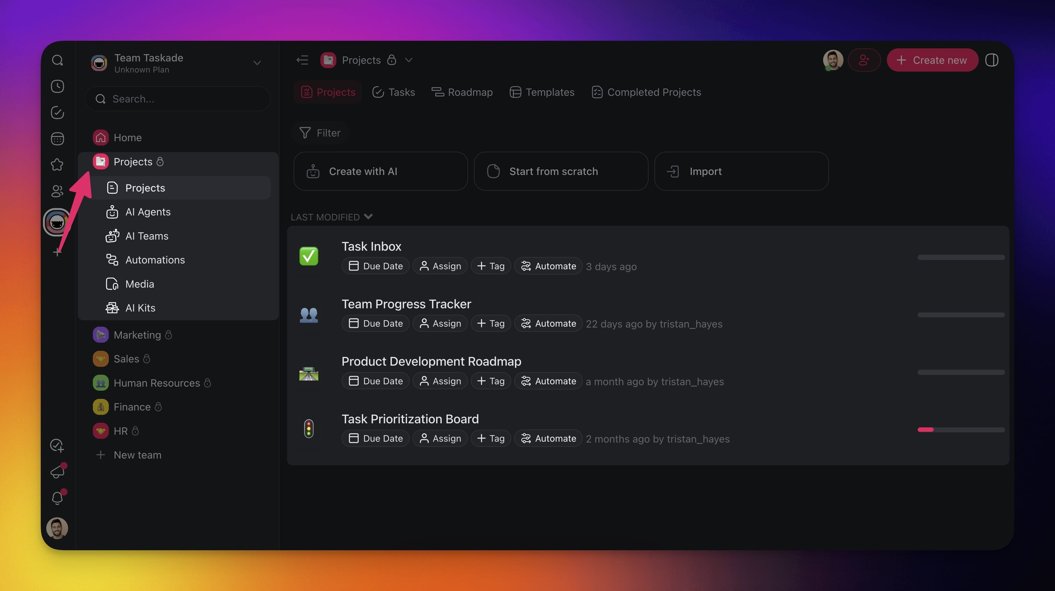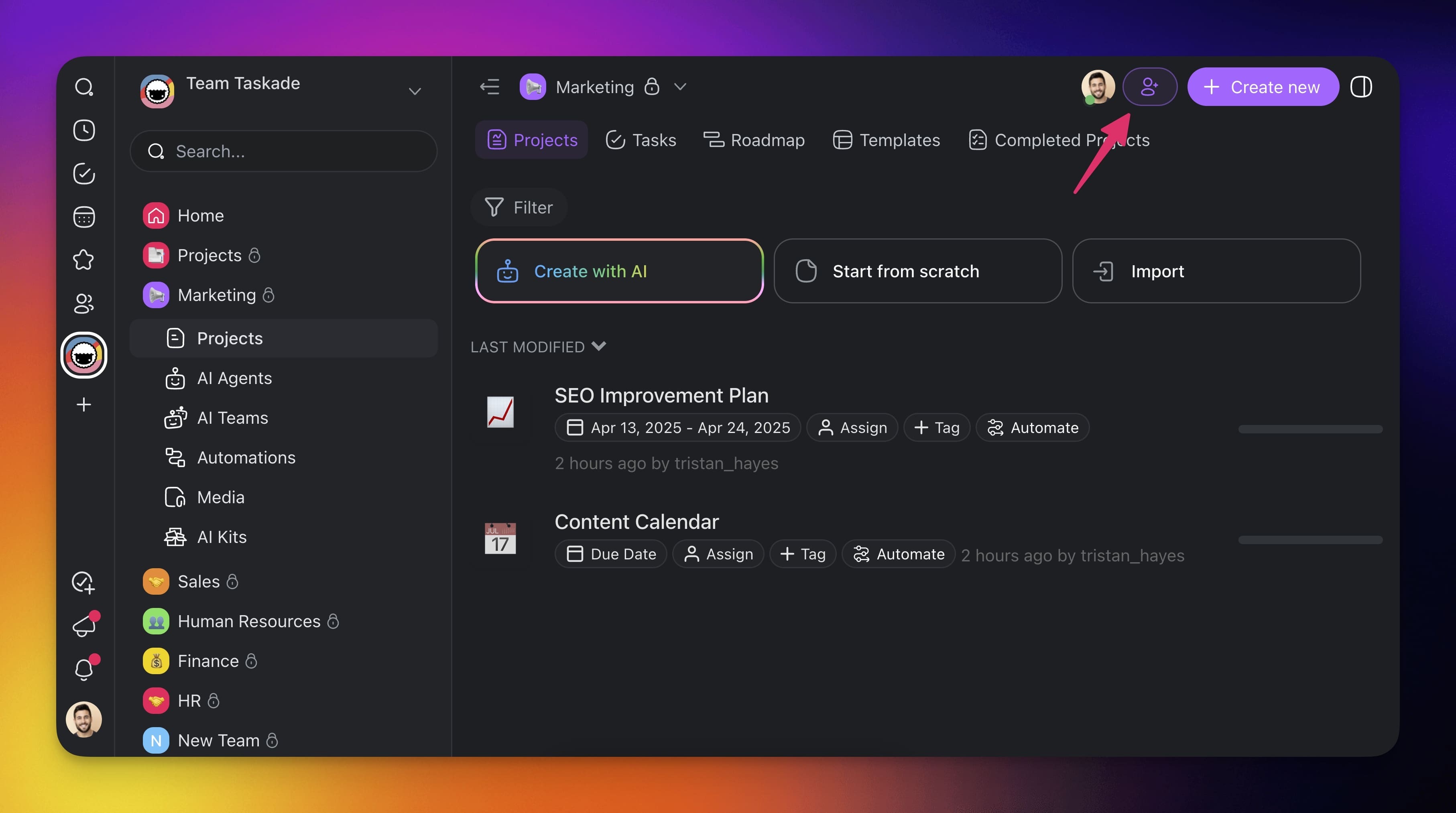 Taskade has built-in AI Agents and Automations that can work alongside your projects. Try building with AI →