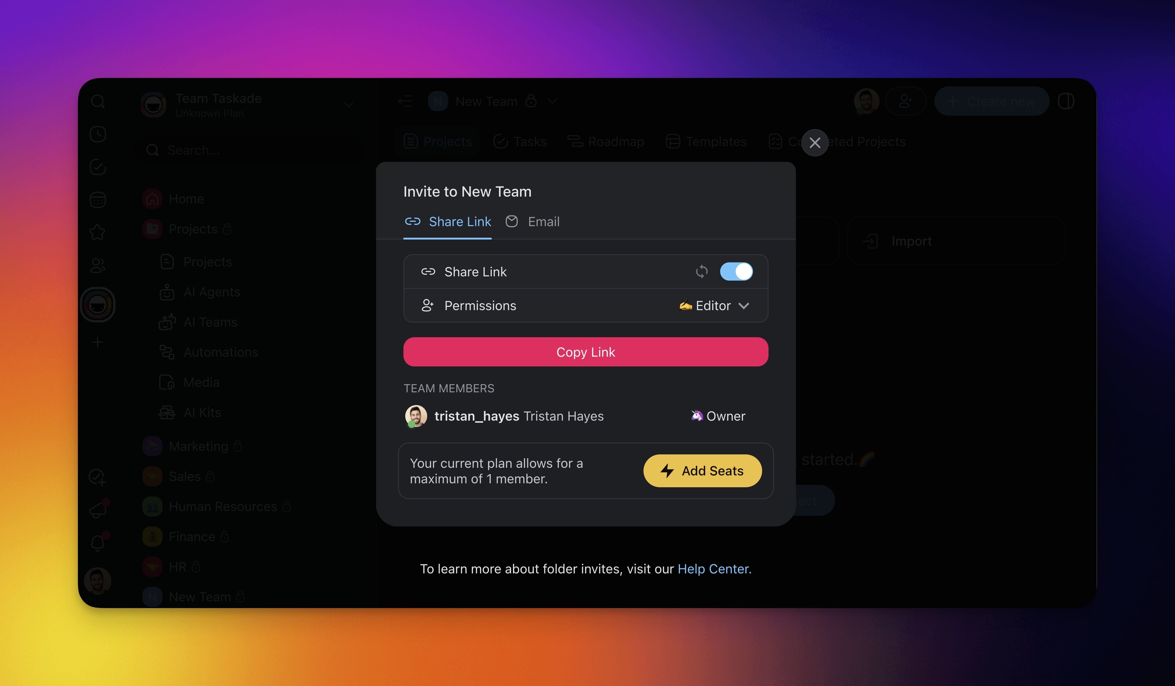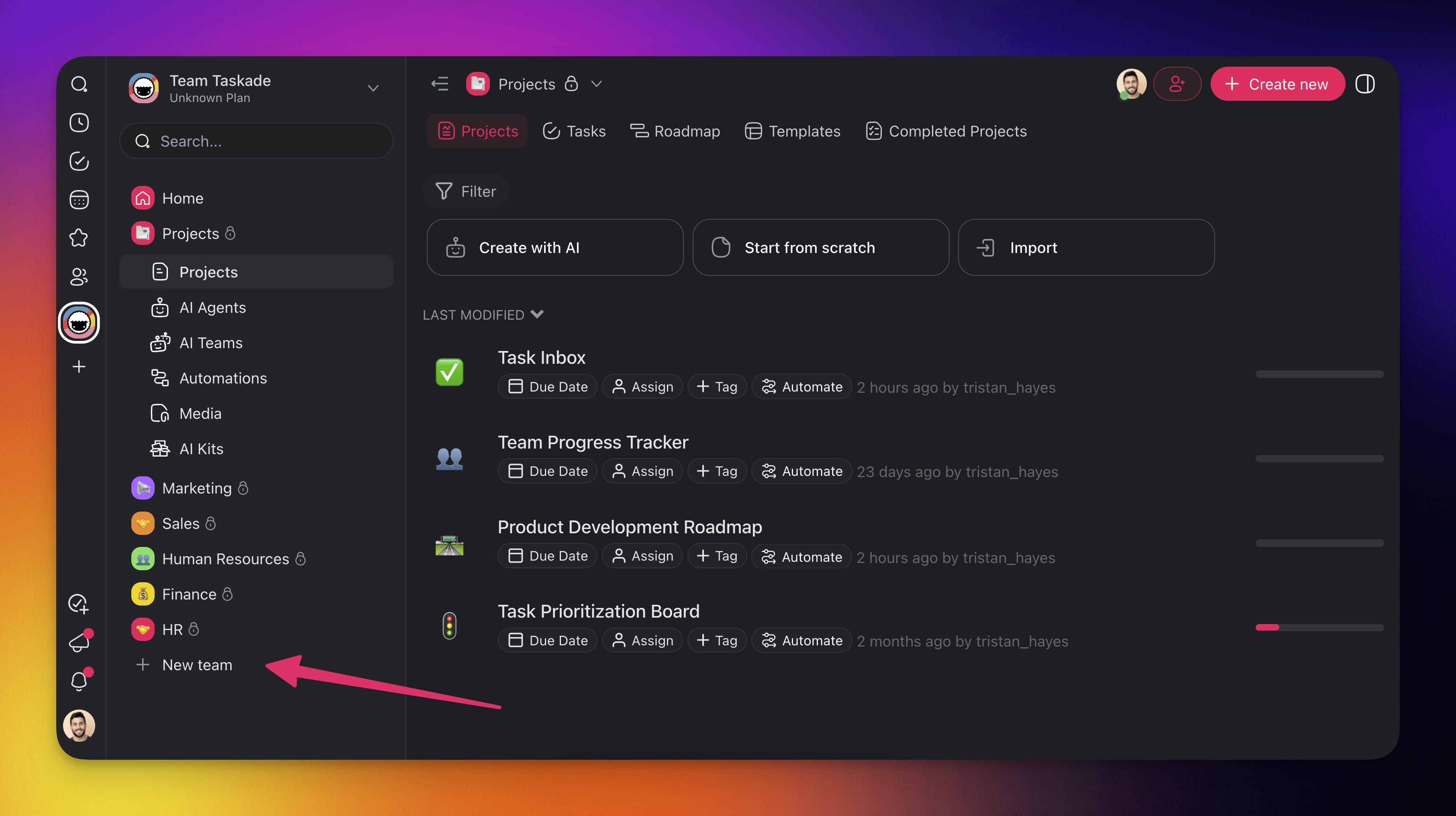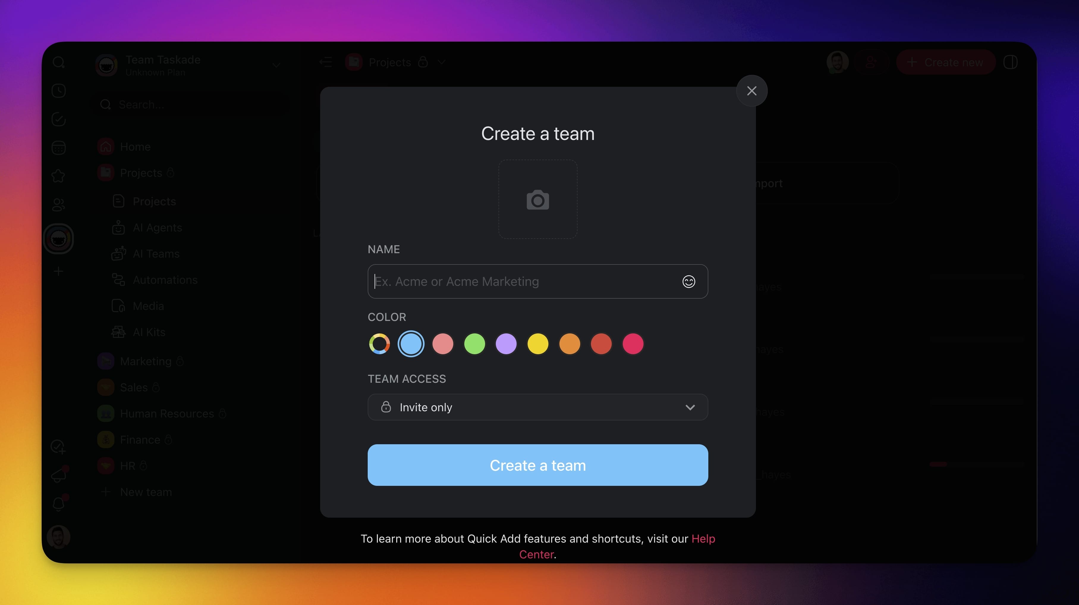 A Team in Taskade is just like a regular folder on your computer. It's a collection of Projects, and Templates "nested" inside a Workspace. You can create Teams to organize your personal projects, team members, departments, or clients.