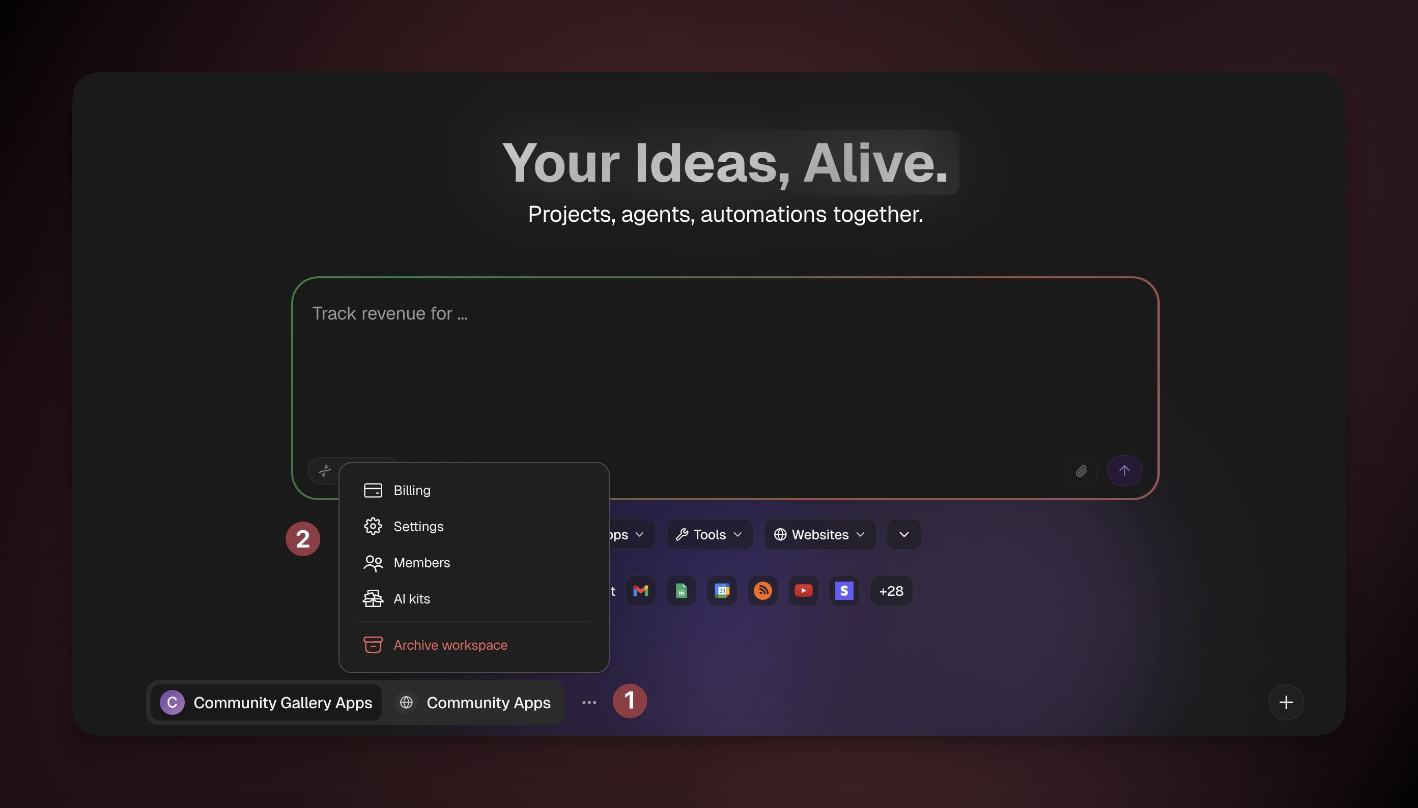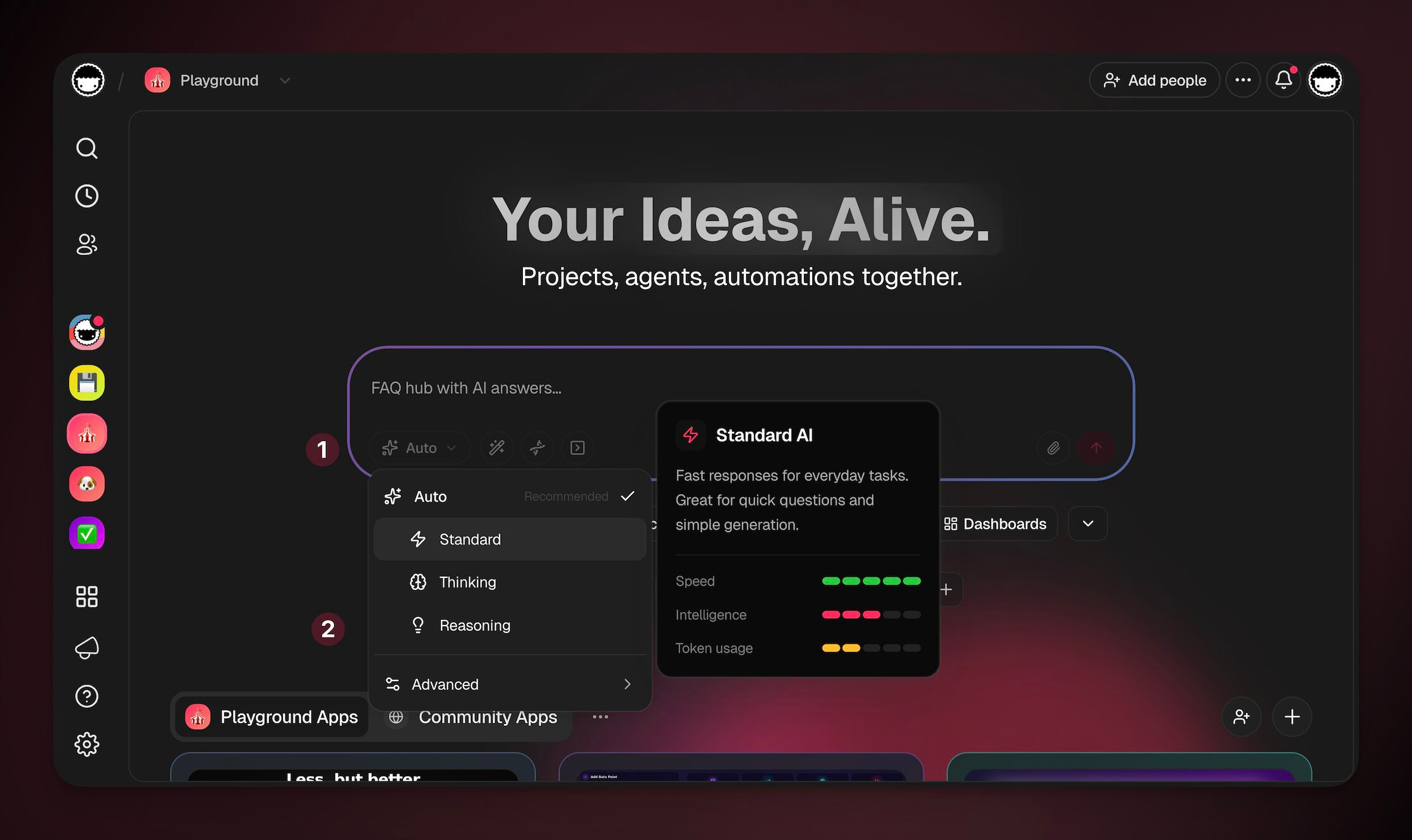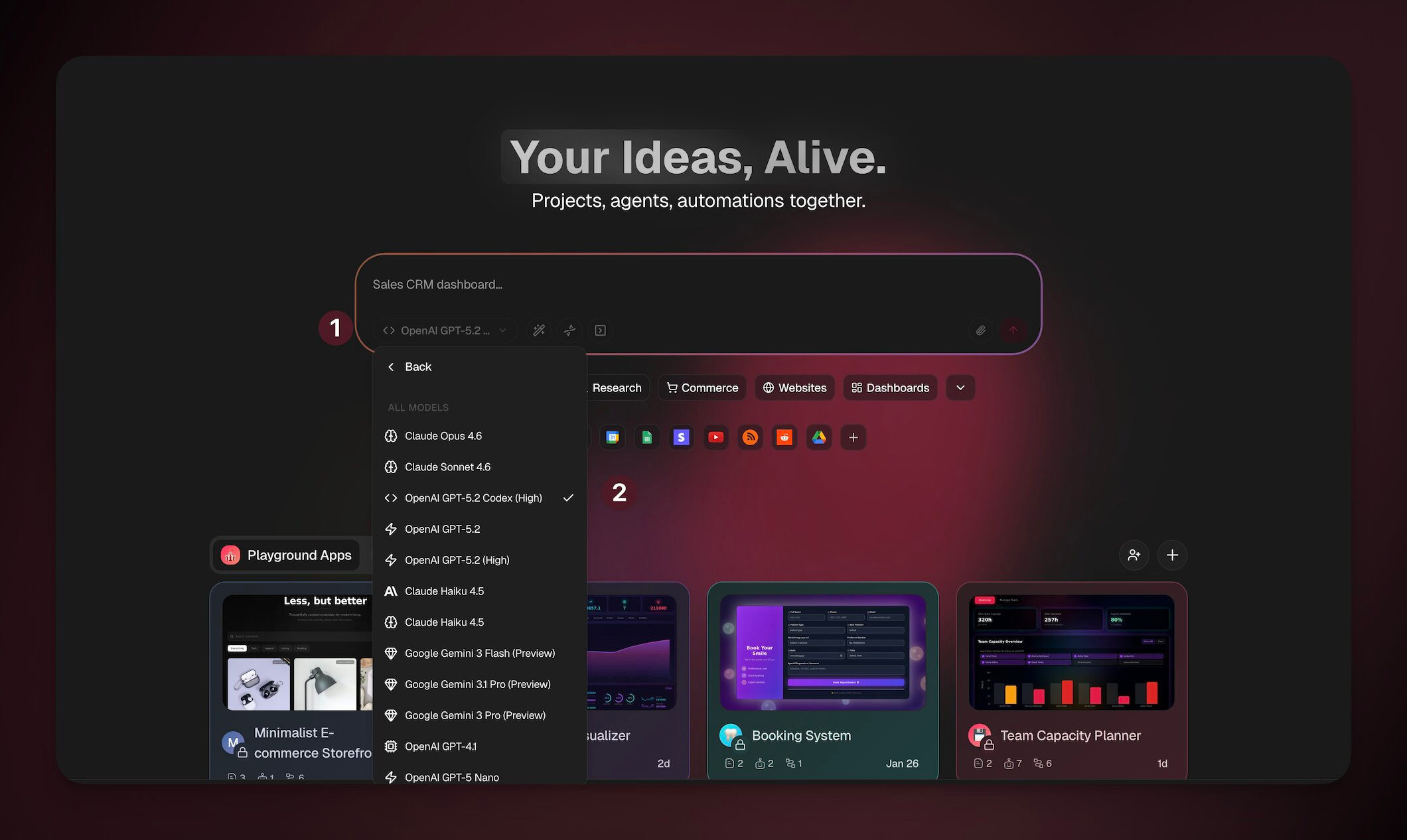 - Mode Selector: Choose build priority (Apps, Projects, Agents, Automations).