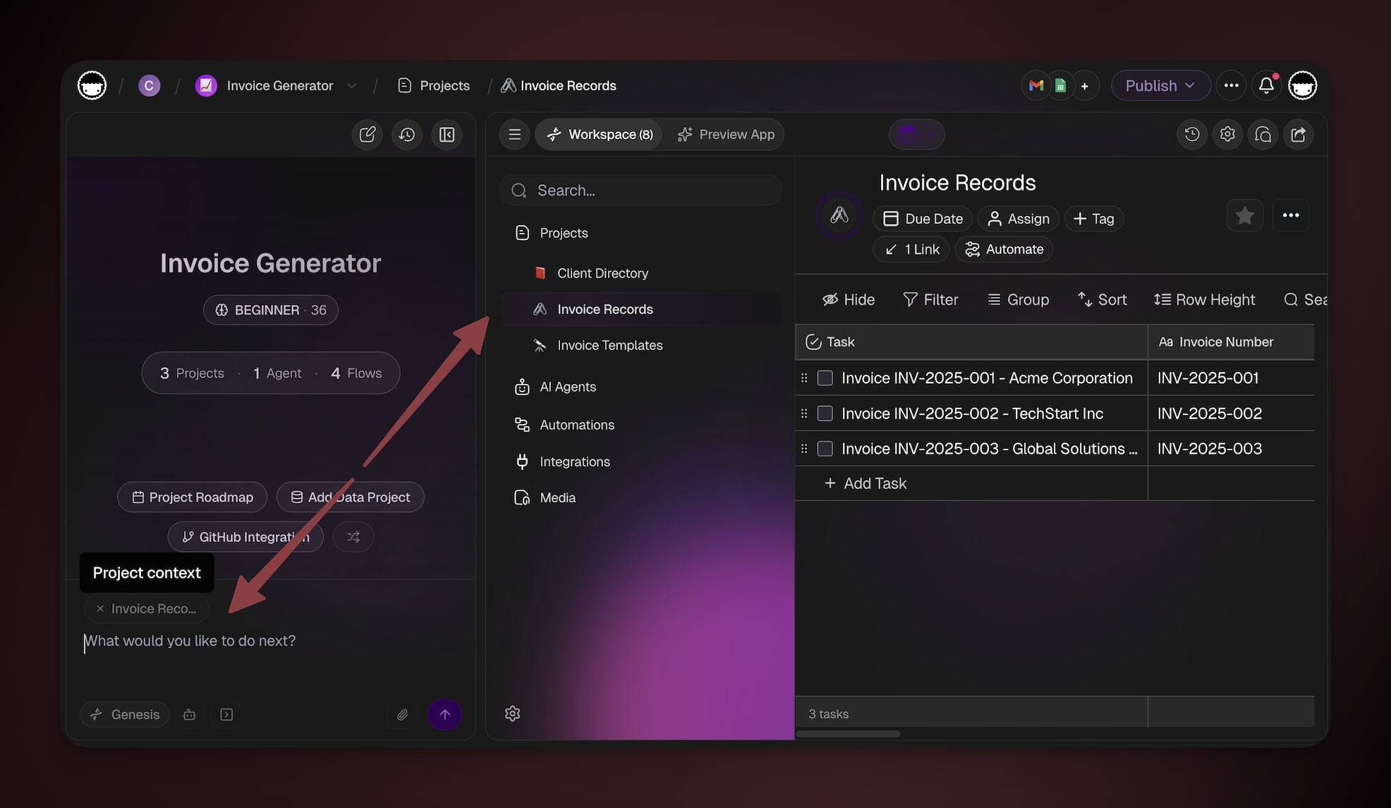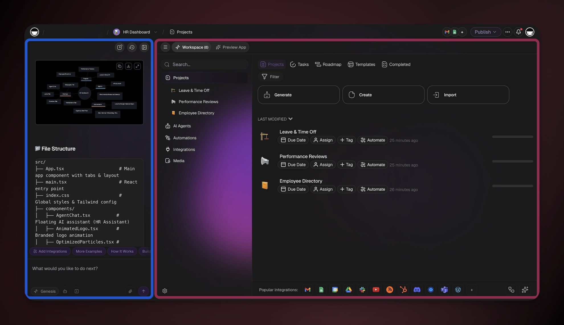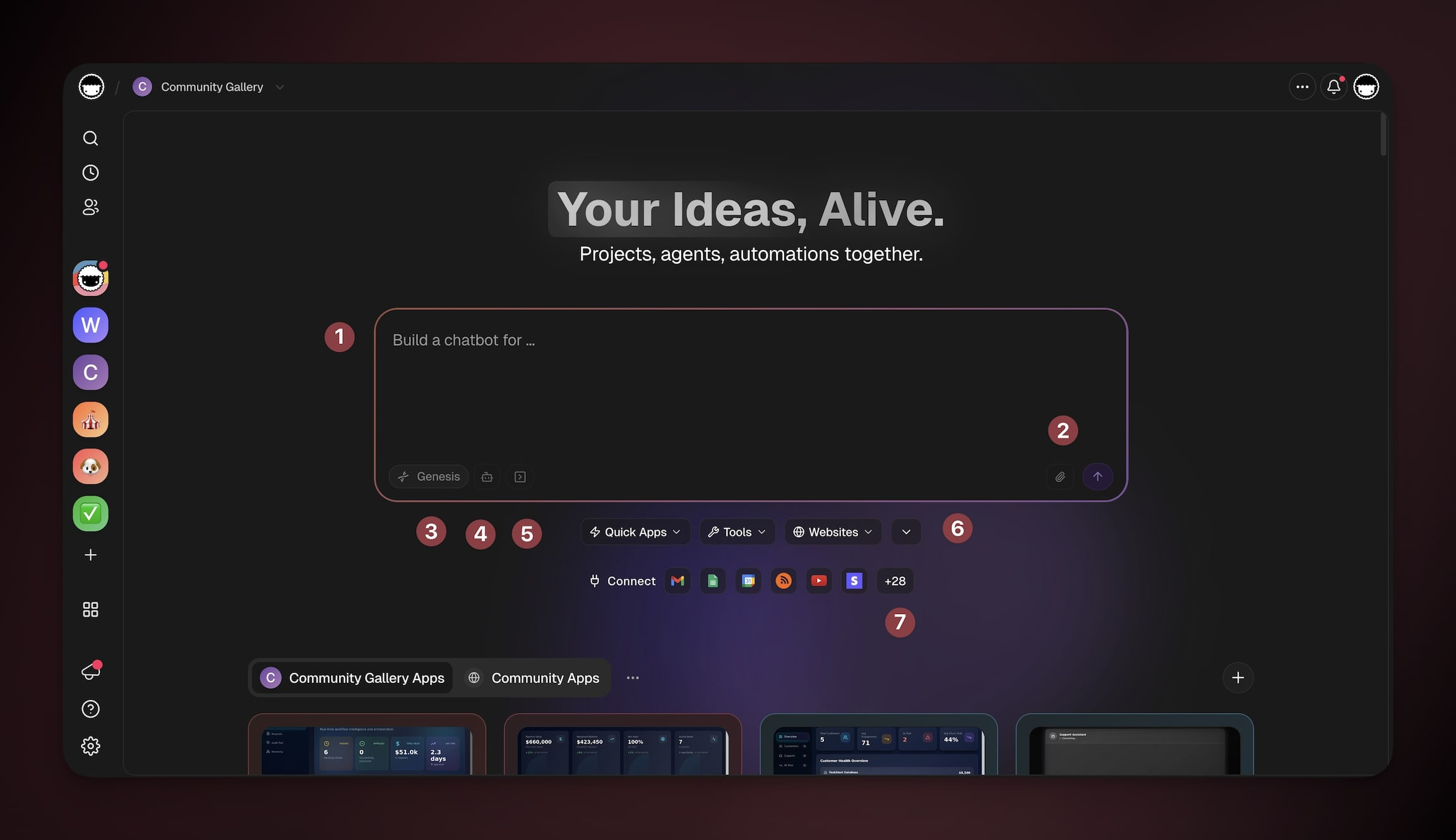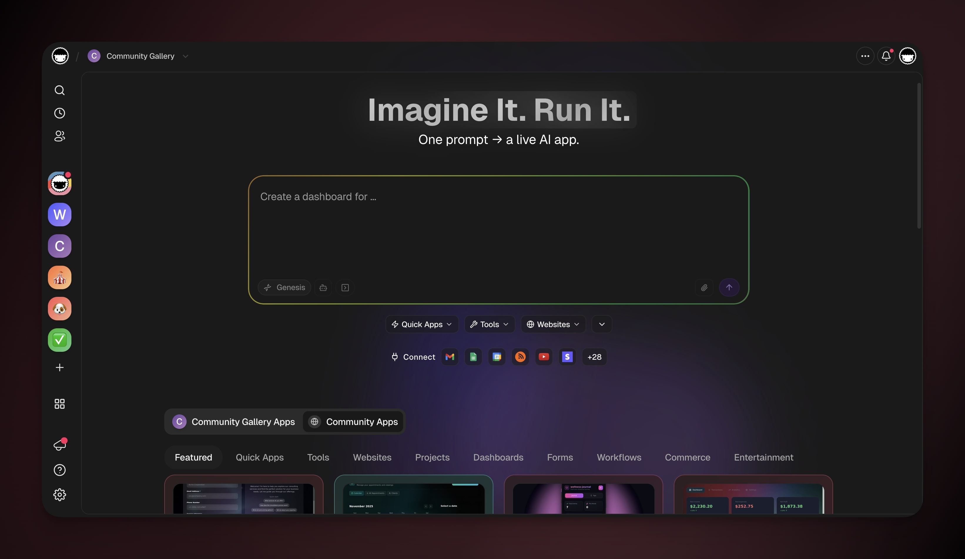 Genesis is an AI app builder that generates complete business applications from a single prompt. Just describe what you need, and Genesis will create it for you. Every app is "living software" powered by your Workspace DNA: Projects remember (memory), AI Agents think (intelligence), and Automations act (motion).